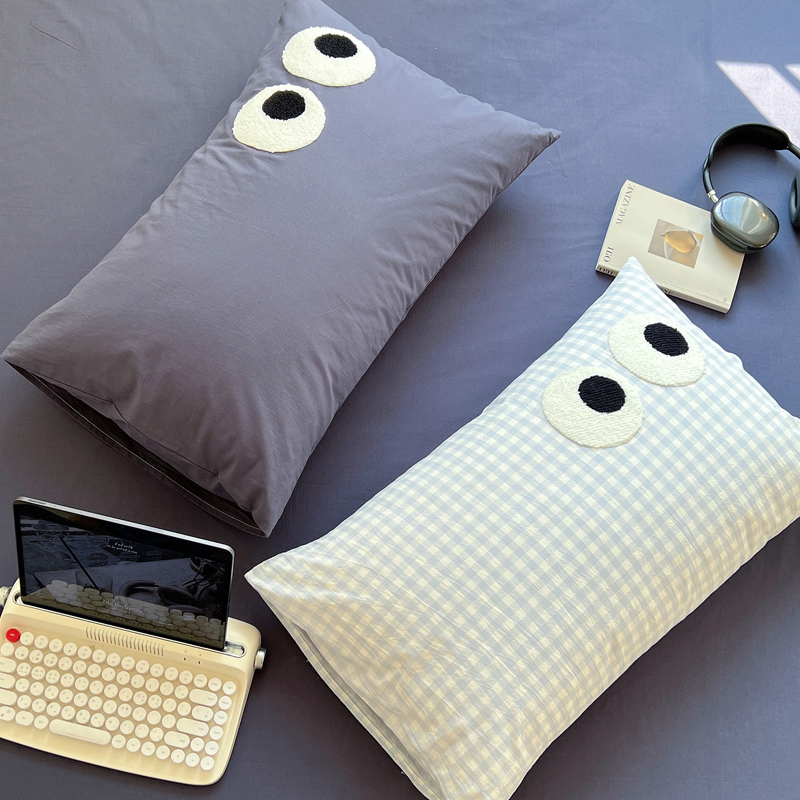 盼季家纺 2024新款萌趣毛巾绣大眼睛枕套 大眼-藏青+蓝格
