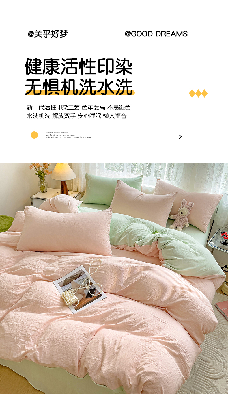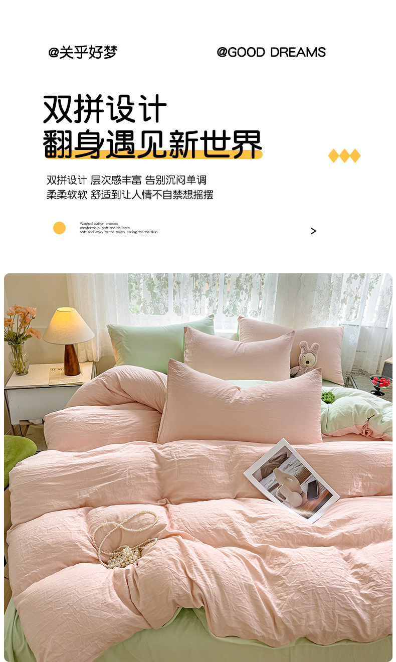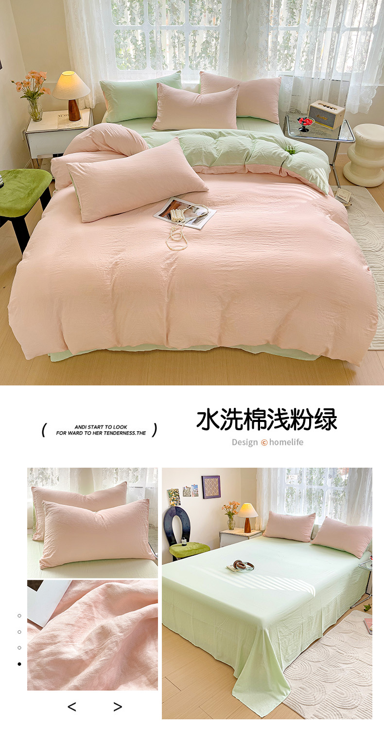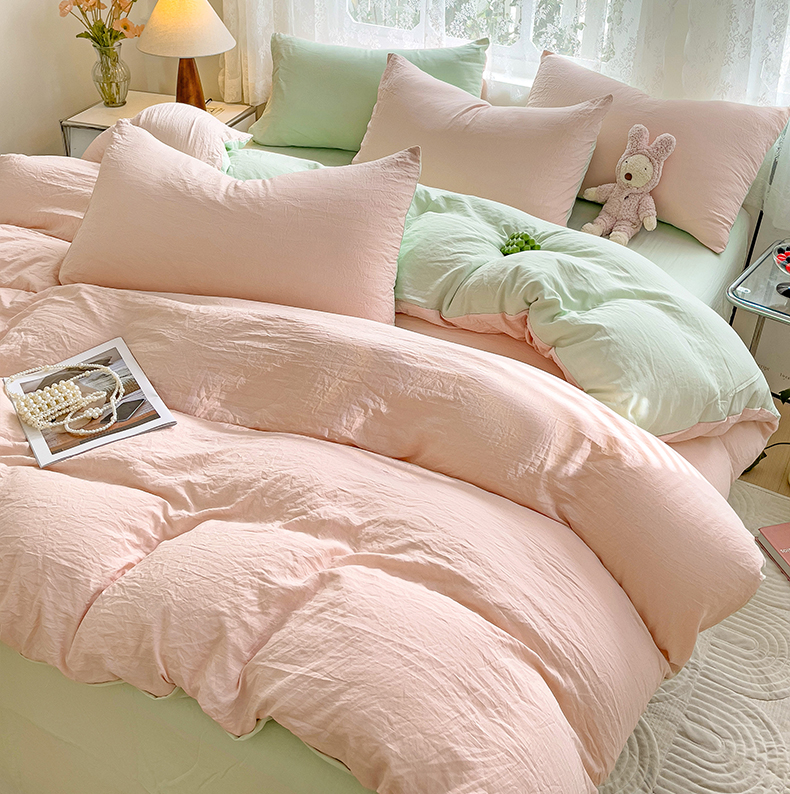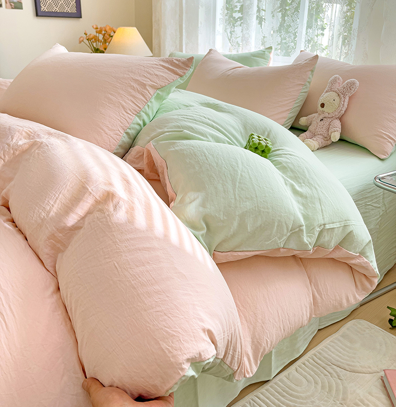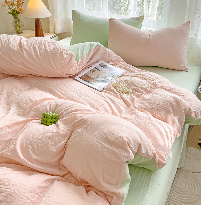 当前位置: 91家纺网 > 商品网购 > 床品套件 > 四件套 > 水洗棉四件套 > 韩巢家纺 2024新款ins风超柔褶皱亲肤水洗棉四件套 -纯色双拼系列(提供卖家秀) 水洗棉浅粉绿