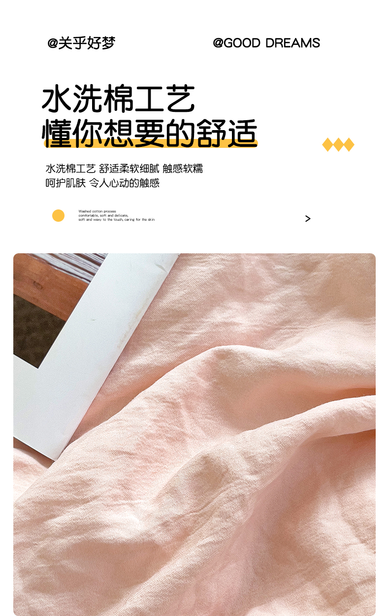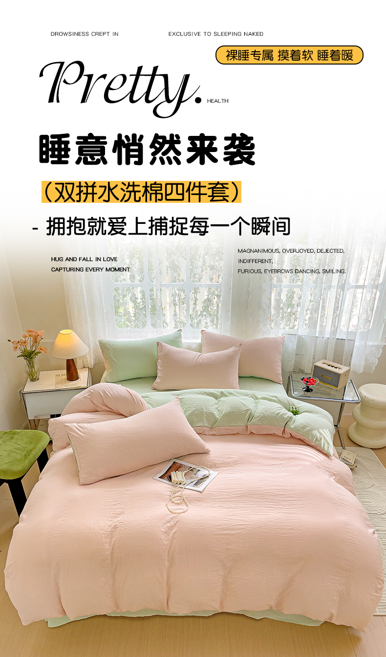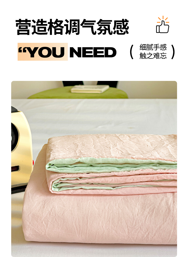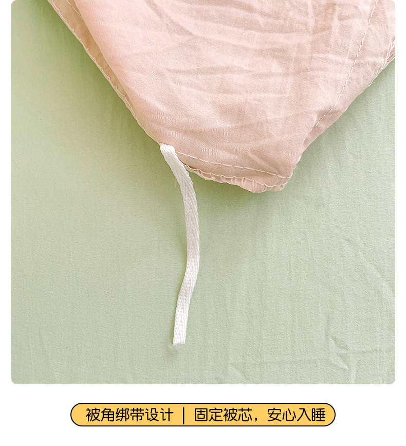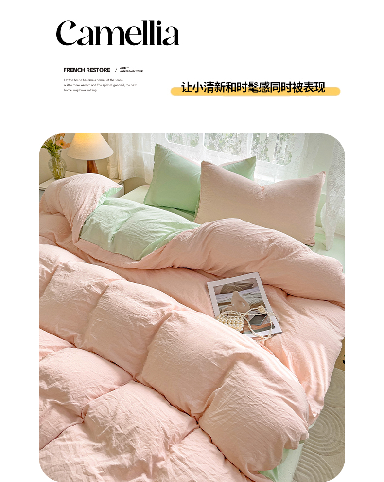 当前位置: 91家纺网 > 商品网购 > 床品套件 > 四件套 > 水洗棉四件套 > 韩巢家纺 2024新款ins风超柔褶皱亲肤水洗棉四件套 -纯色双拼系列(提供卖家秀) 水洗棉浅粉绿