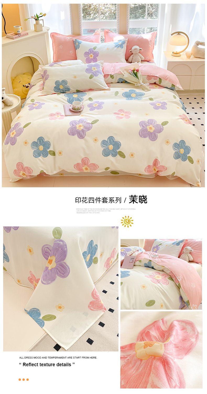 当前位置: 91家纺网 > 商品网购 > 床品套件 > 四件套 > 全棉普通四件套 > 铭成家纺 2024新款新疆棉喷气印花小清新系列四件套茉晓
