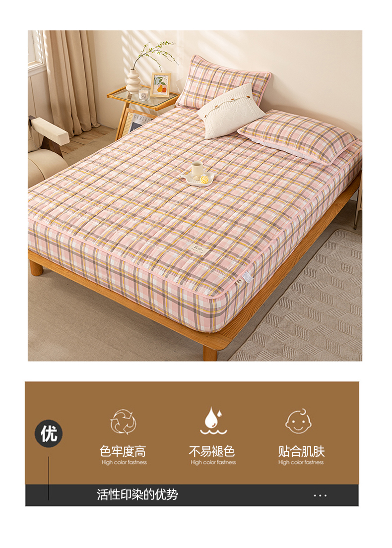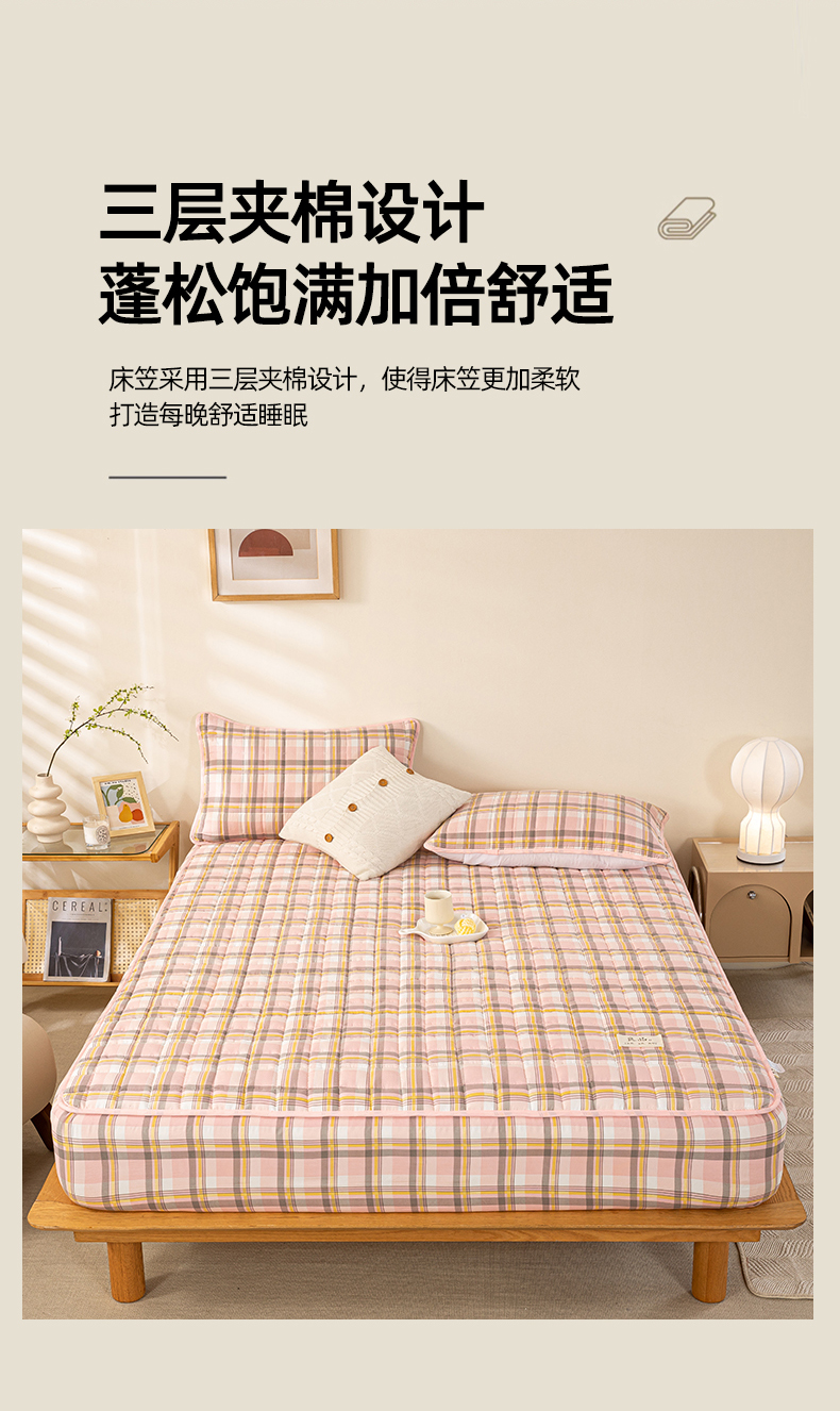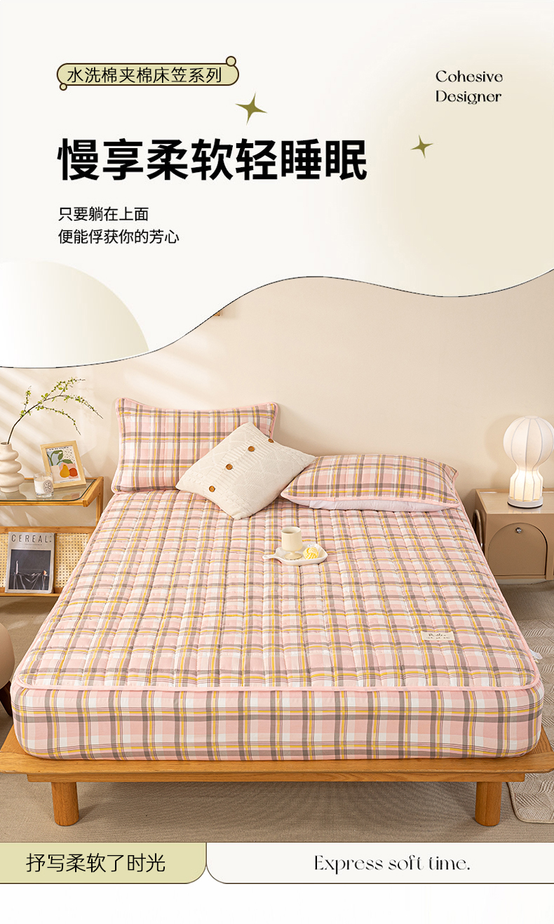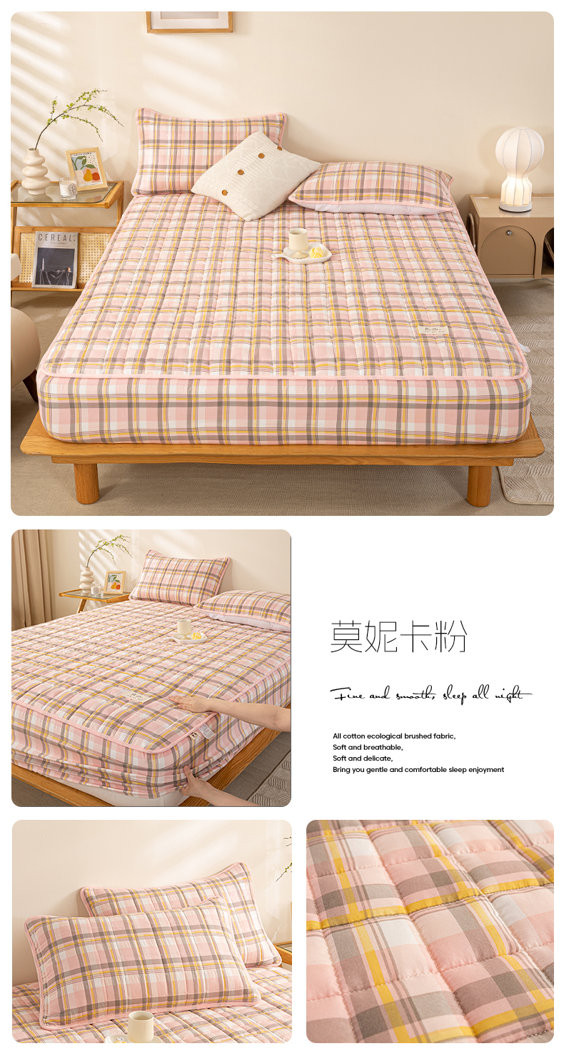萌飞 2024【无印风 全网热销同款】新款A类水洗棉夹棉床笠三件套印花床笠 莫妮卡粉