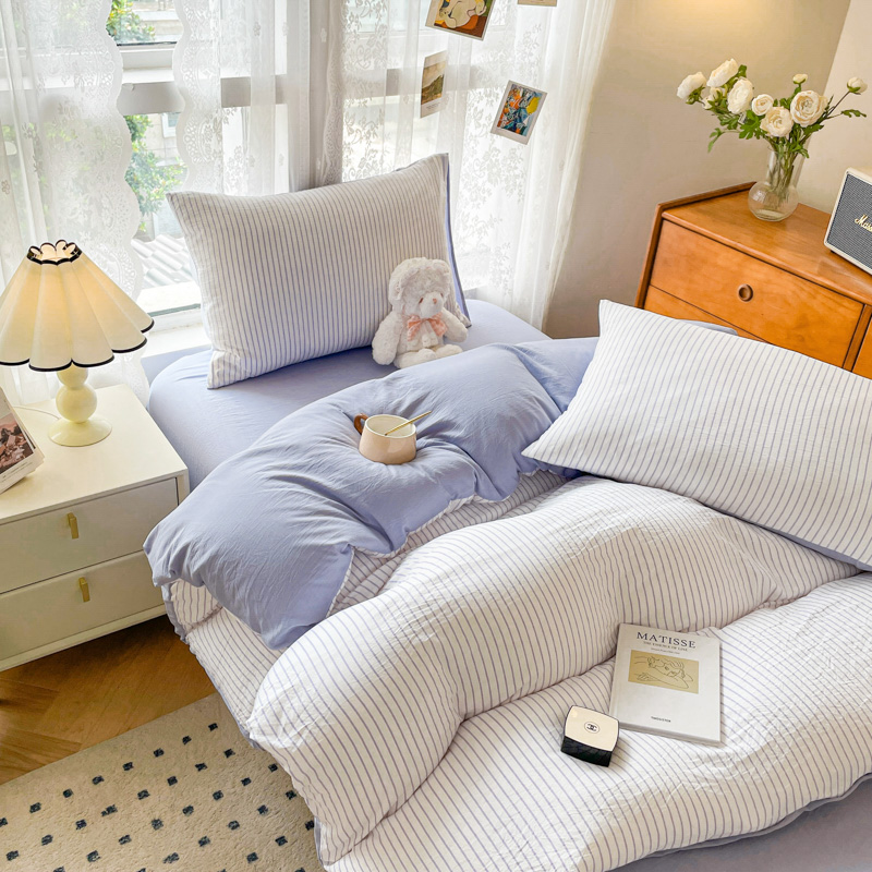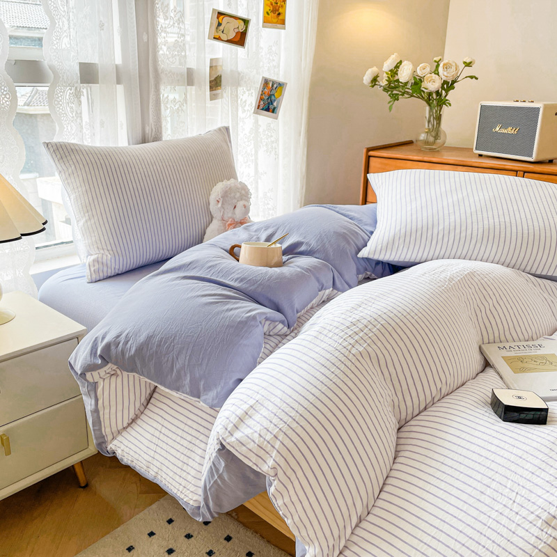 商品名称:悦织湾家纺 2025新款水洗棉纯色条纹小眼睛学生宿舍三件套 良品条纹紫