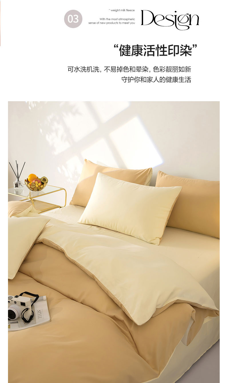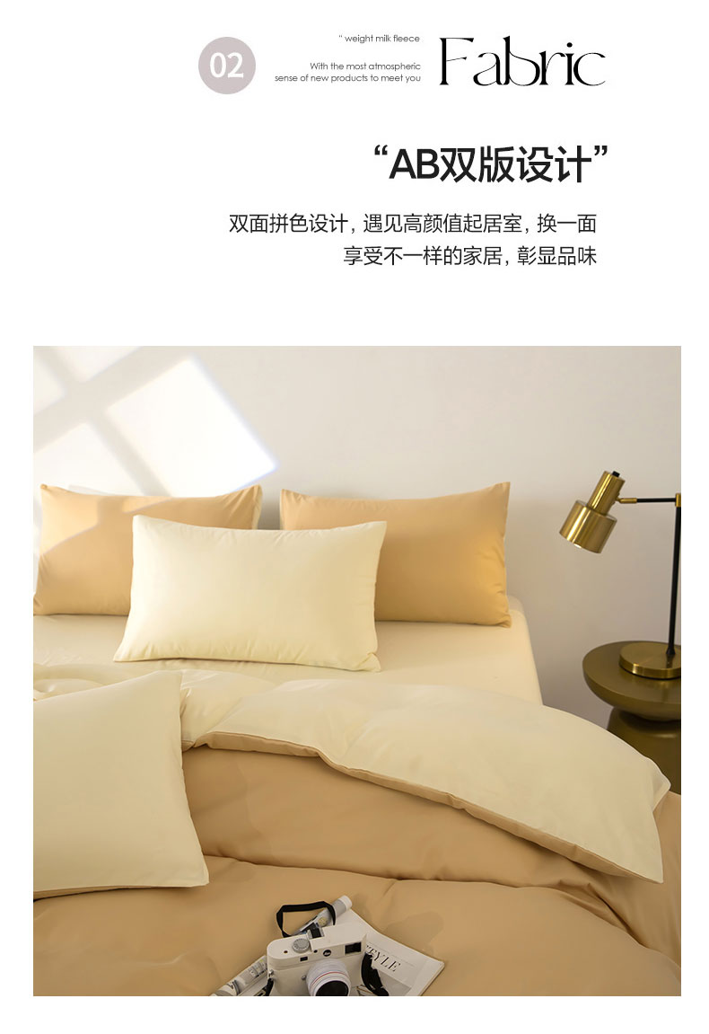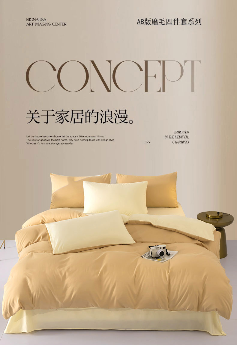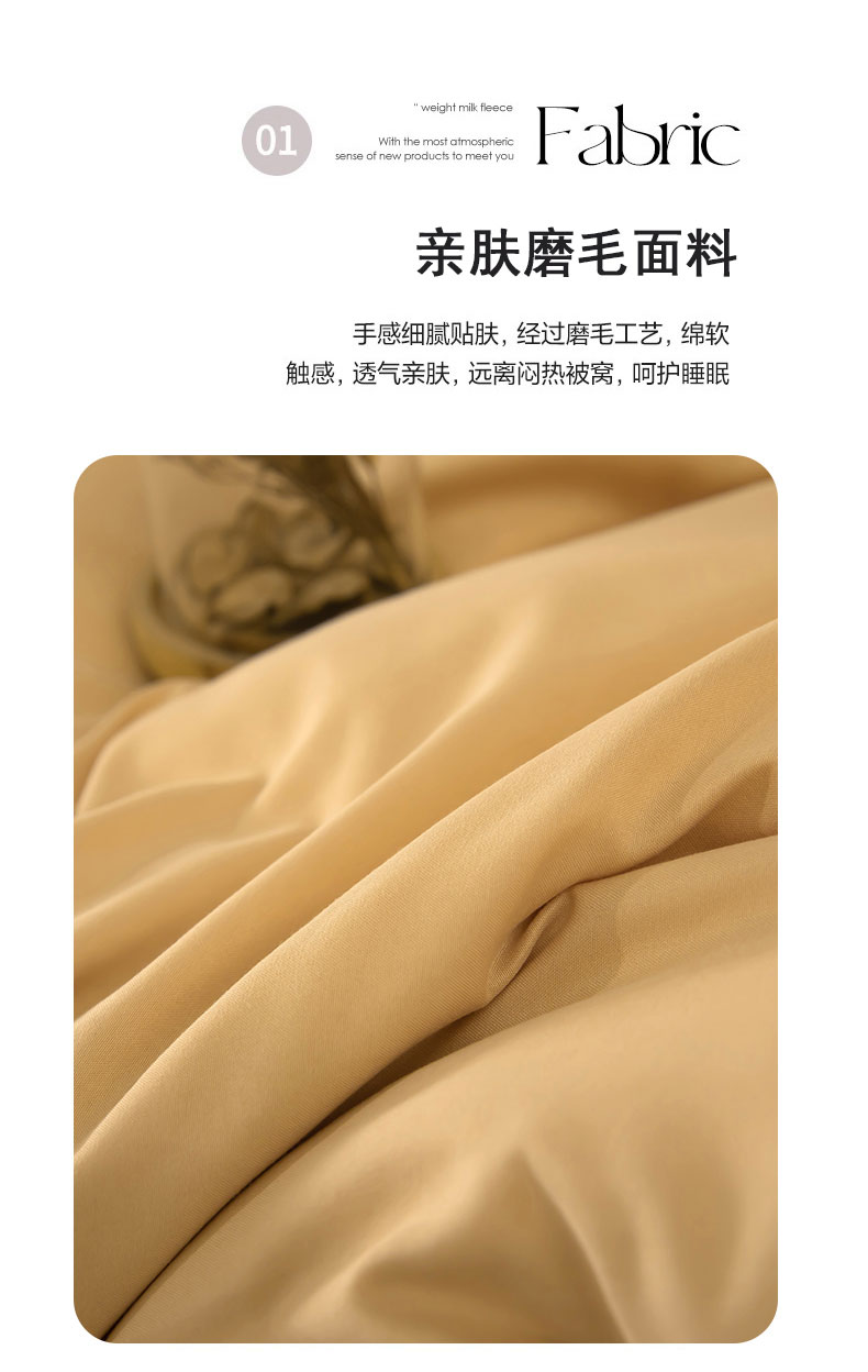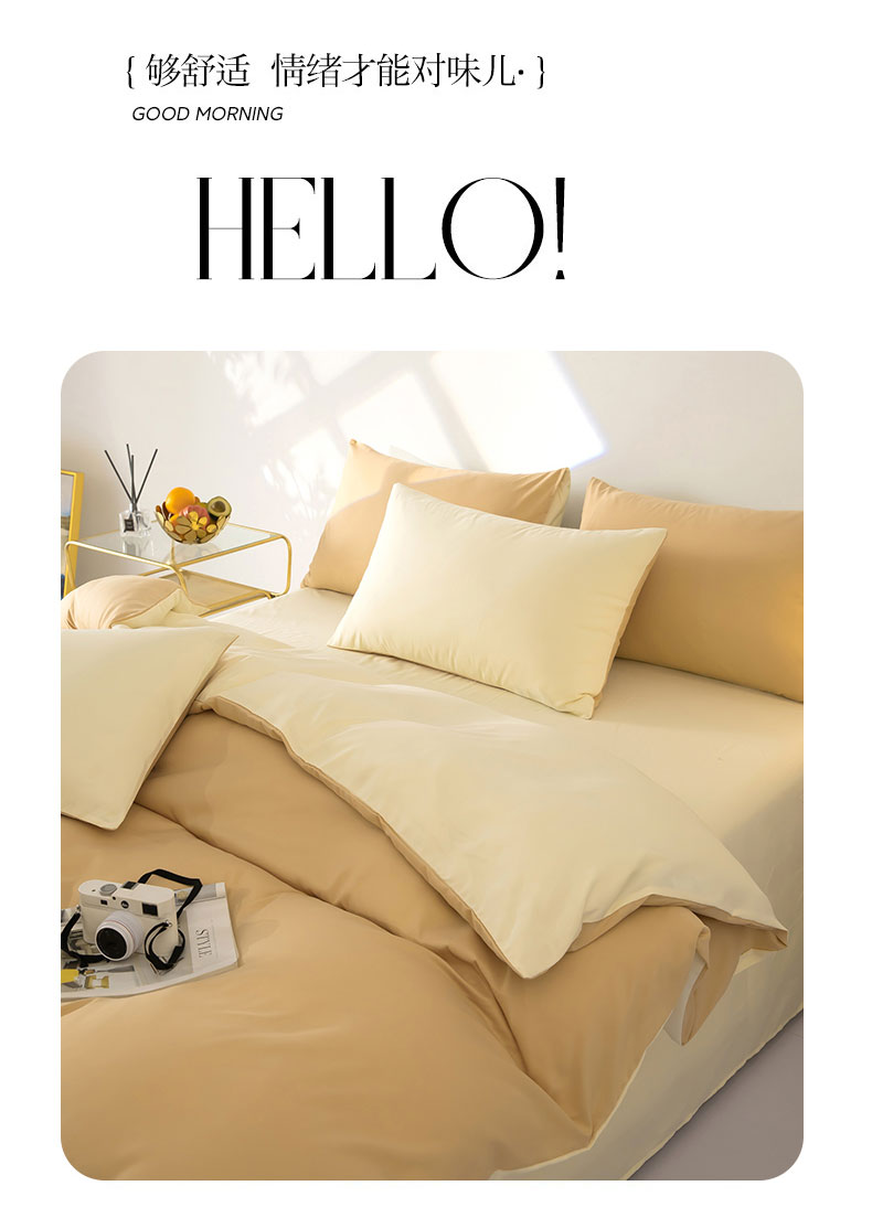 商品名称:梦莱家纺 2024新款亲肤磨毛纯色拼色轻奢系列四件套 卡其+米黄