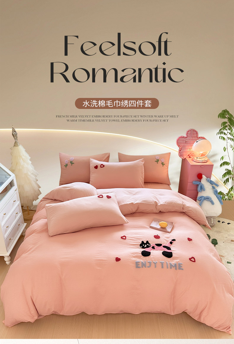 天一阁 2024新款加厚水洗棉毛巾绣四件套学生季学生三件套 小猫咪
