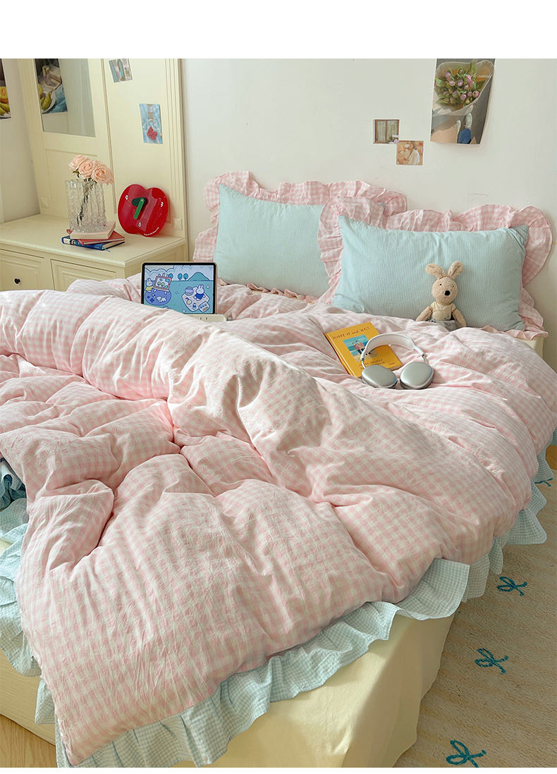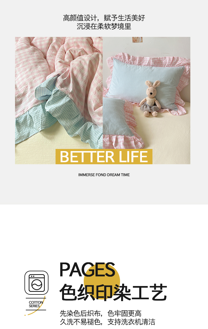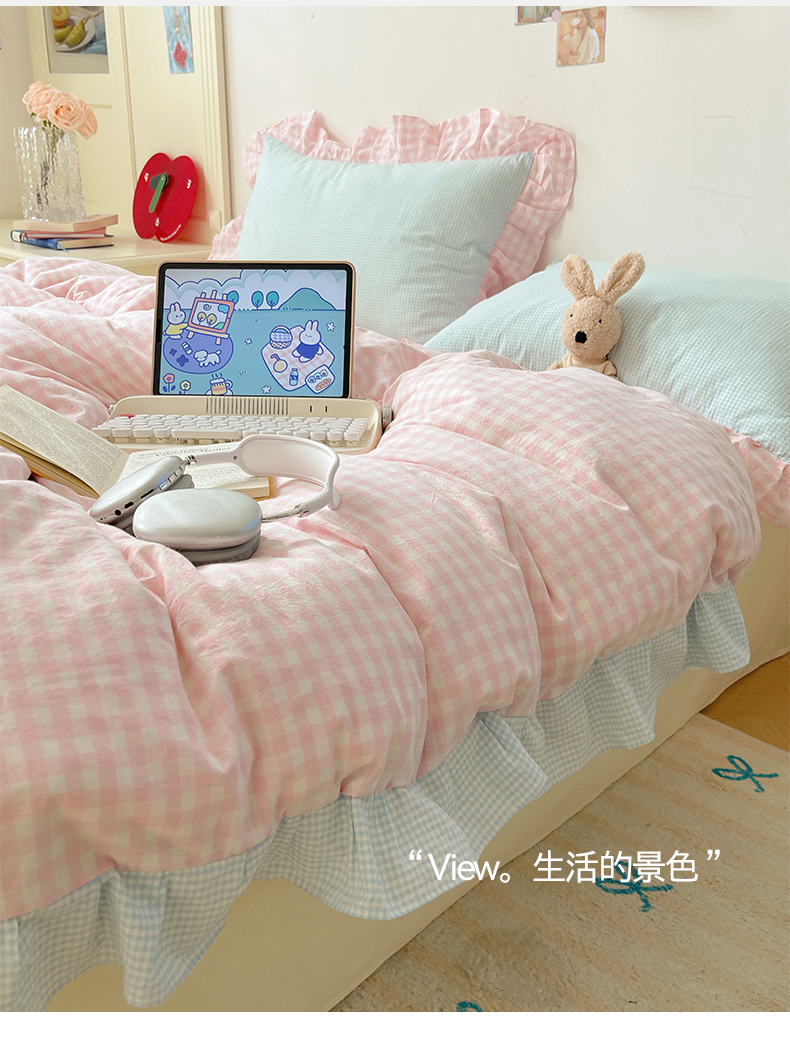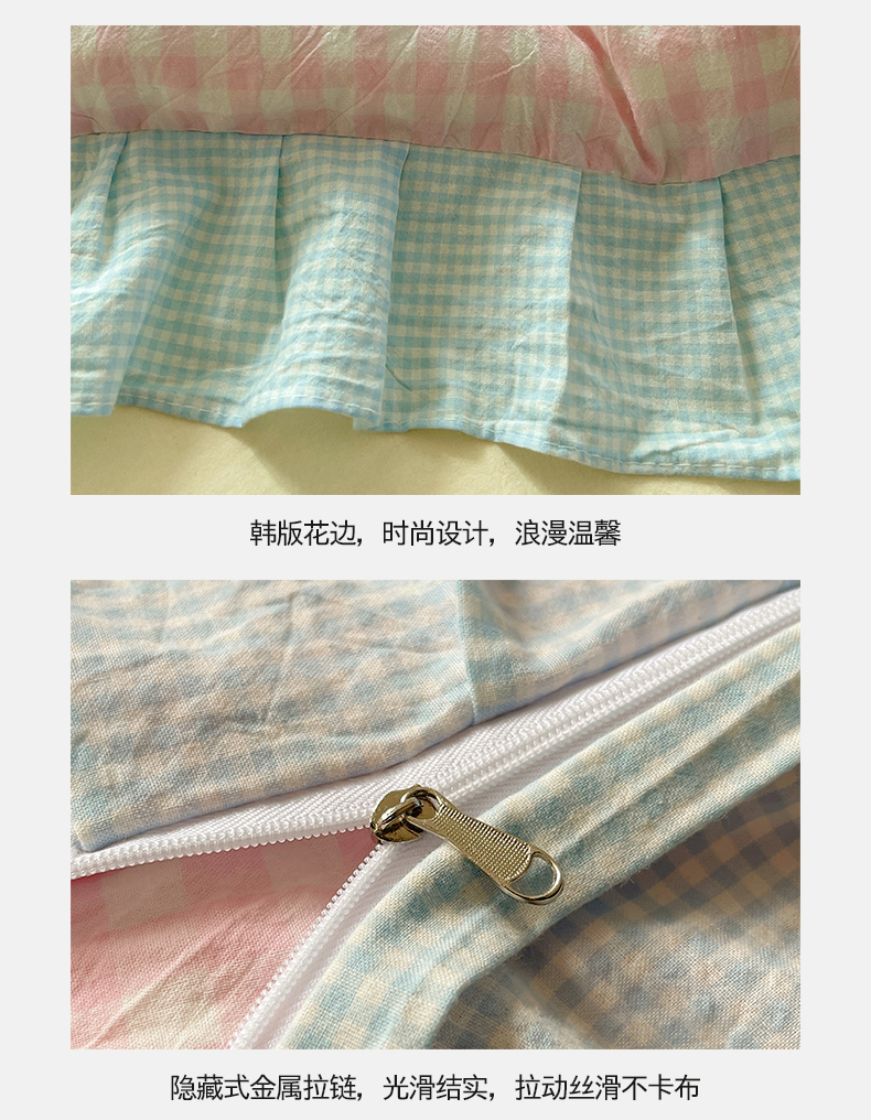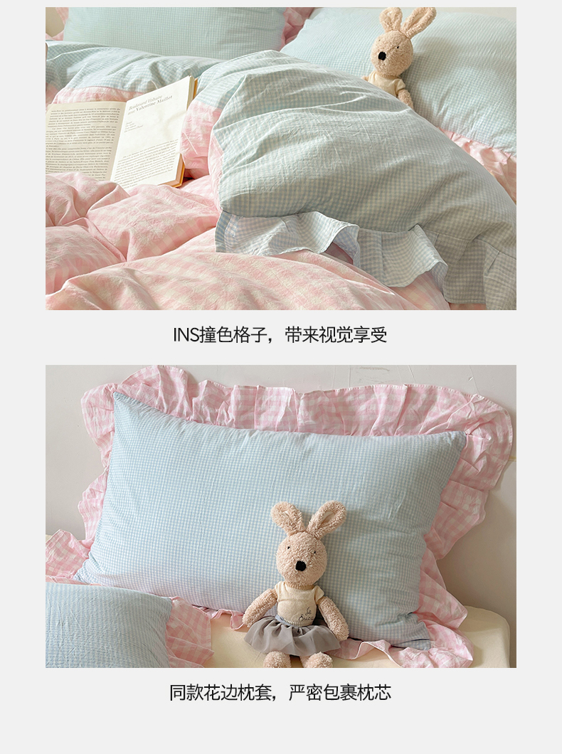 当前位置: 91家纺网 > 商品网购 > 床品套件 > 四件套 > 全棉普通四件套 > 桃子家居 2024新款A类ins色织水洗棉花边撞色玛卡龙格子韩版花边纯棉系列四件套 水洗棉花边-草莓粉蓝