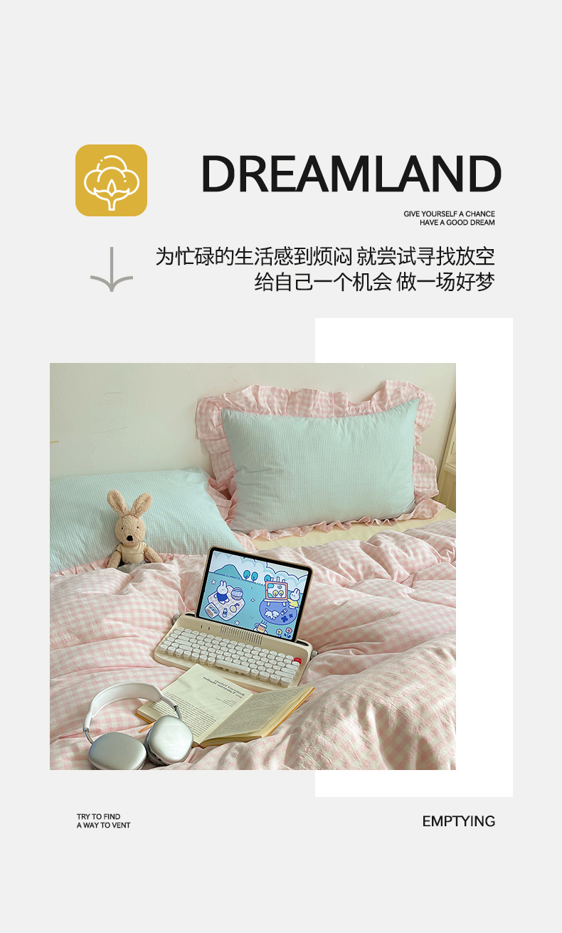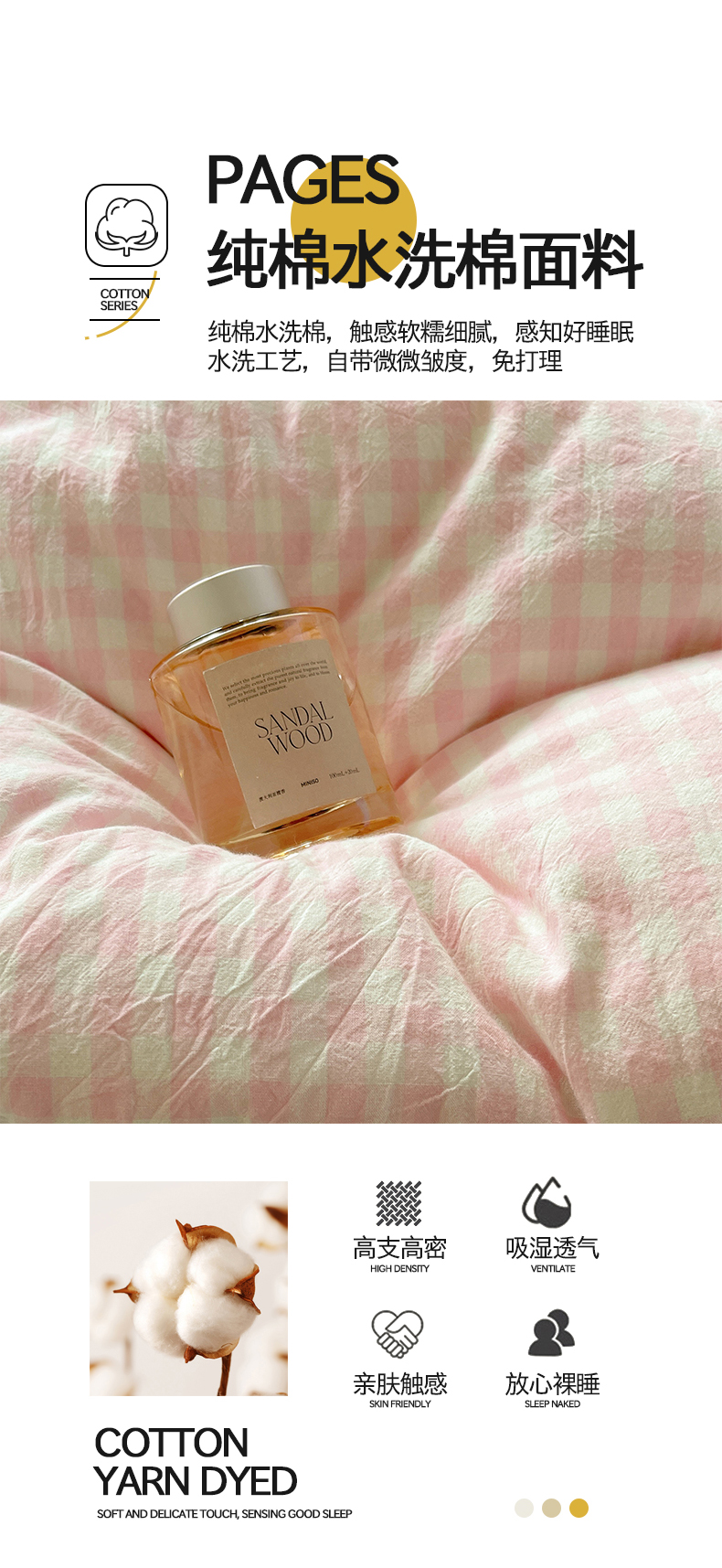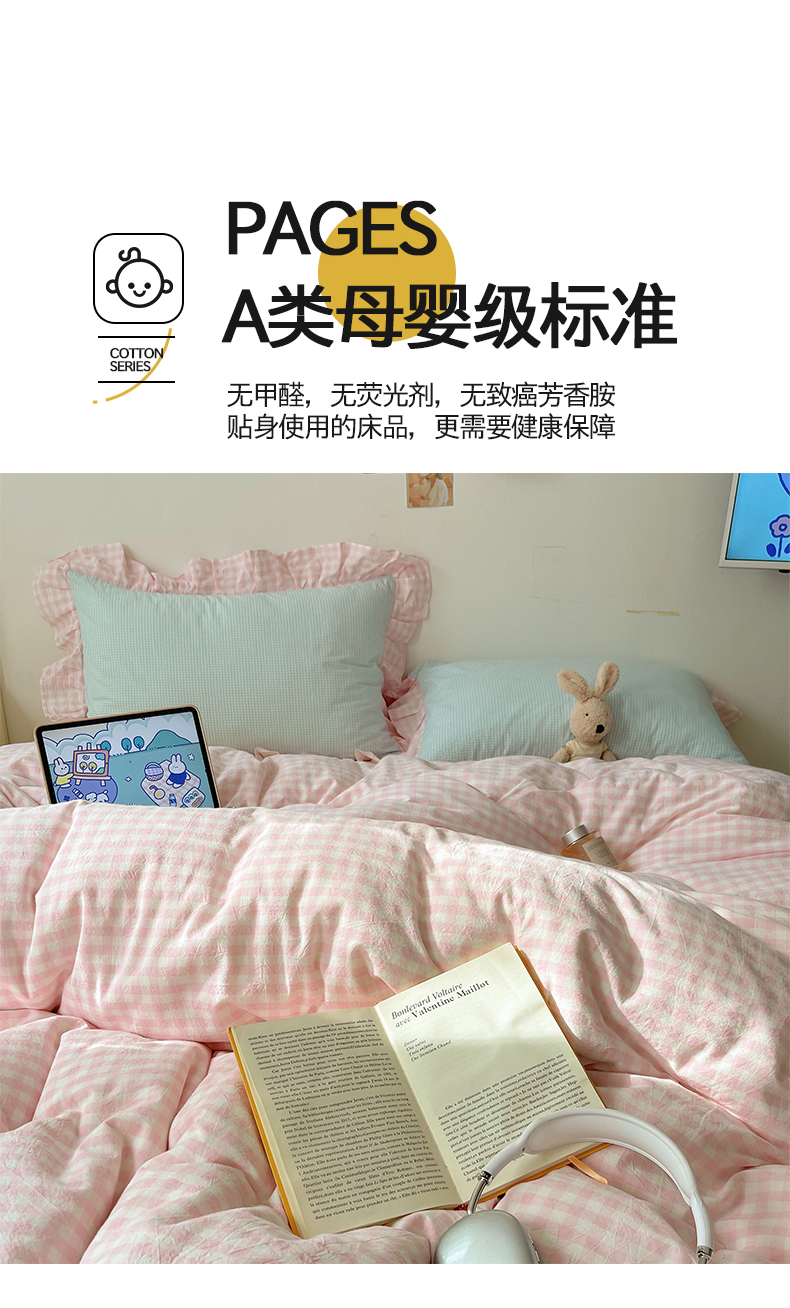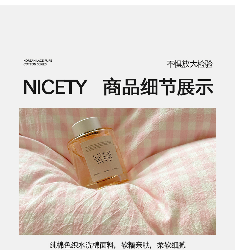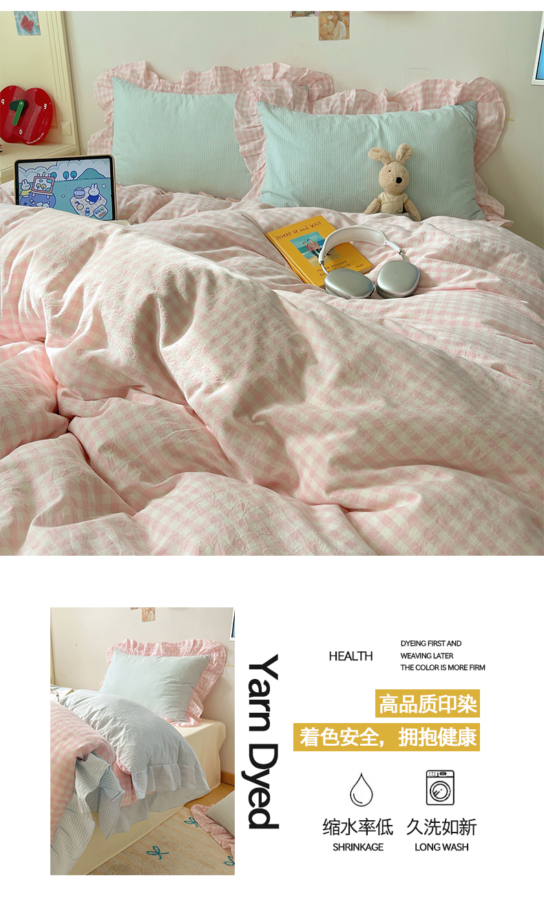 当前位置: 91家纺网 > 商品网购 > 床品套件 > 四件套 > 全棉普通四件套 > 桃子家居 2024新款A类ins色织水洗棉花边撞色玛卡龙格子韩版花边纯棉系列四件套 水洗棉花边-草莓粉蓝