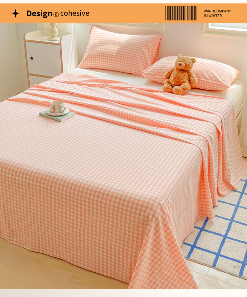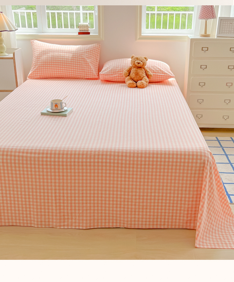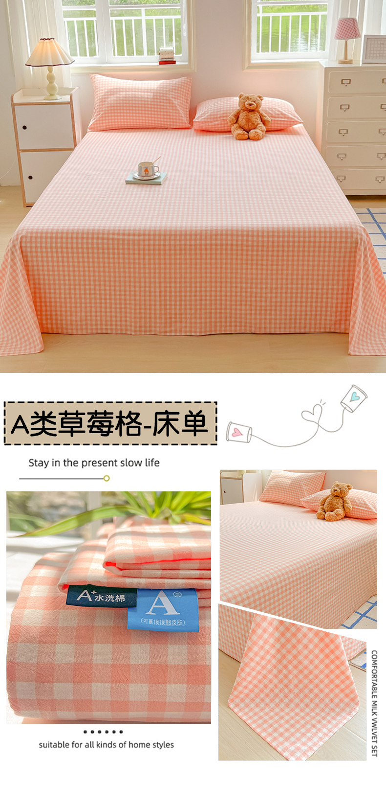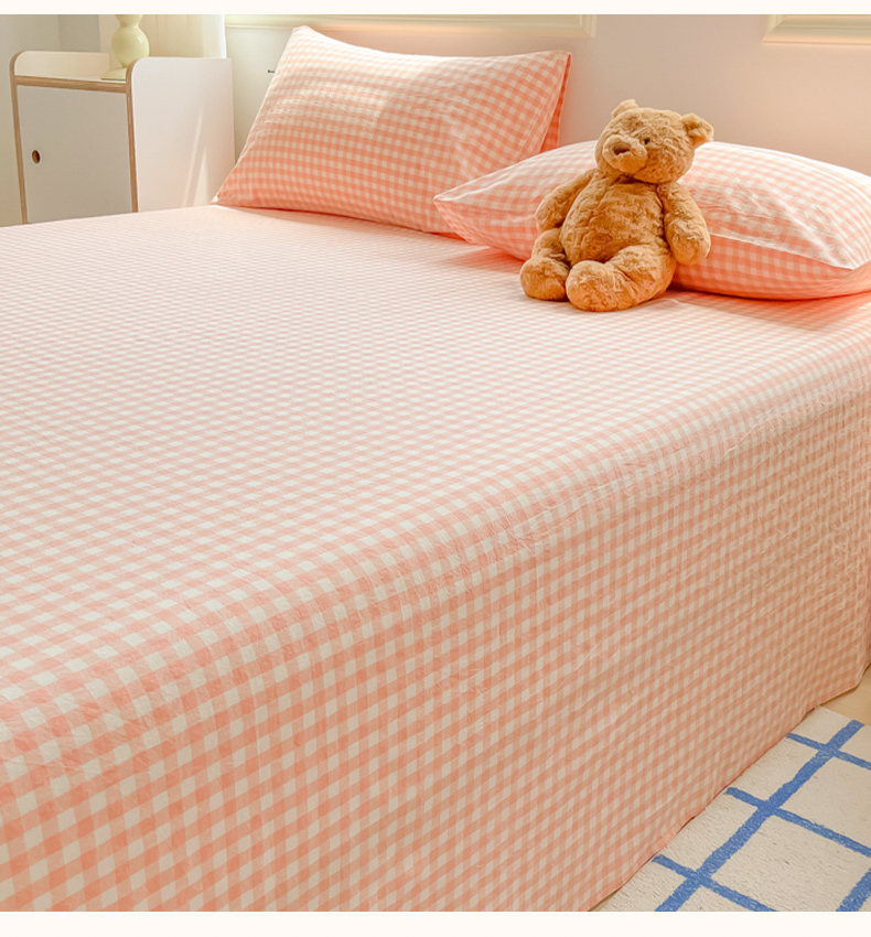 韩巢家纺 2024新款简约格子纯色A类水洗棉床单枕套三件套 A类草莓格-床单