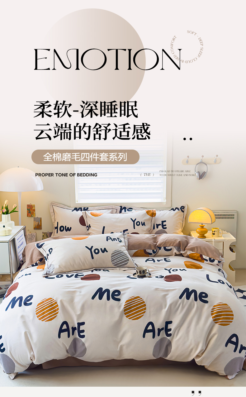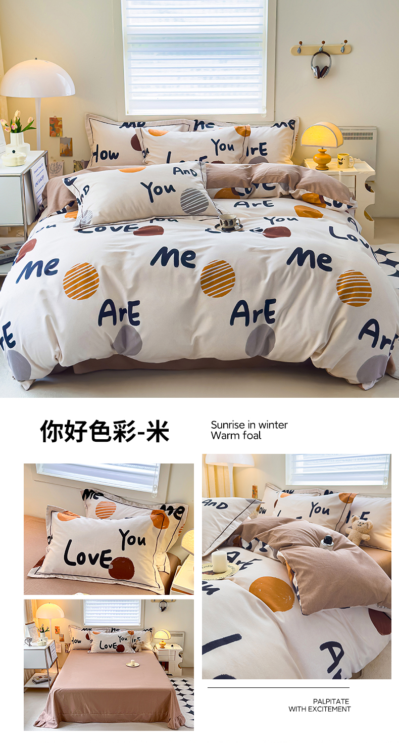 当前位置: 91家纺网 > 商品网购 > 床品套件 > 四件套 > 普通磨毛四件套 > 眷恋家纺 2025秋冬新款全棉纯棉喷气加厚磨毛纯棉四件套 你好色彩-米