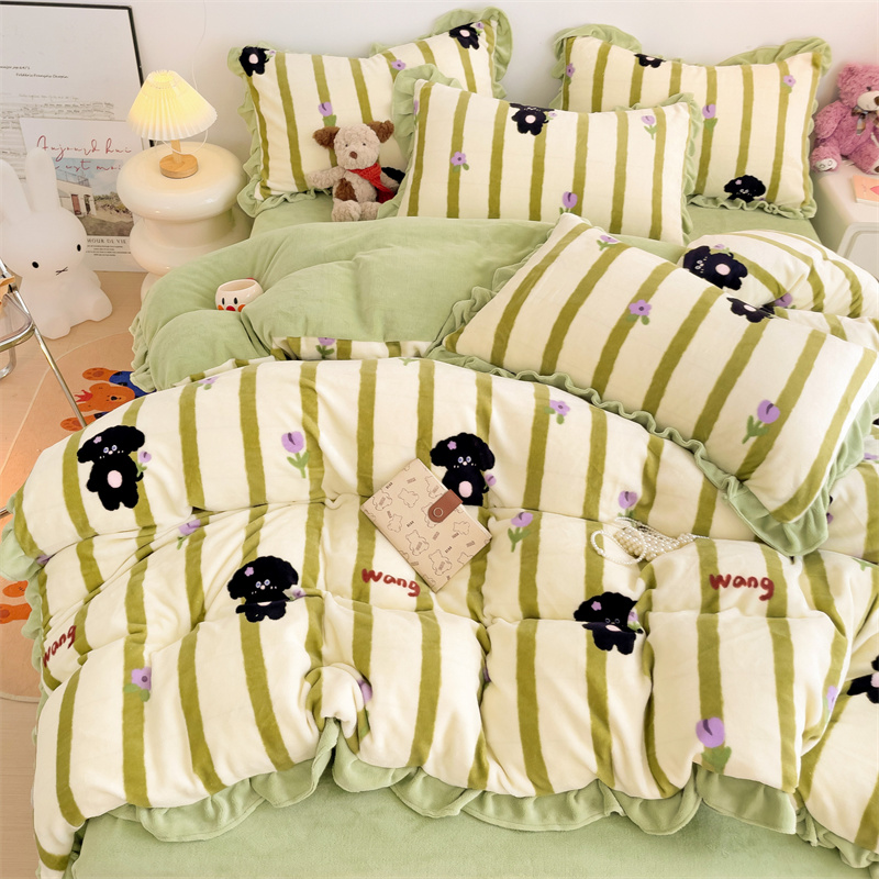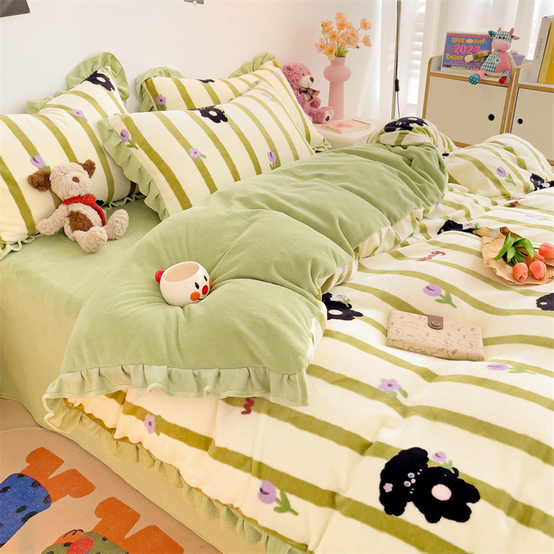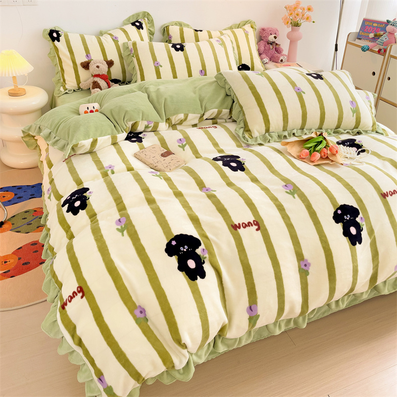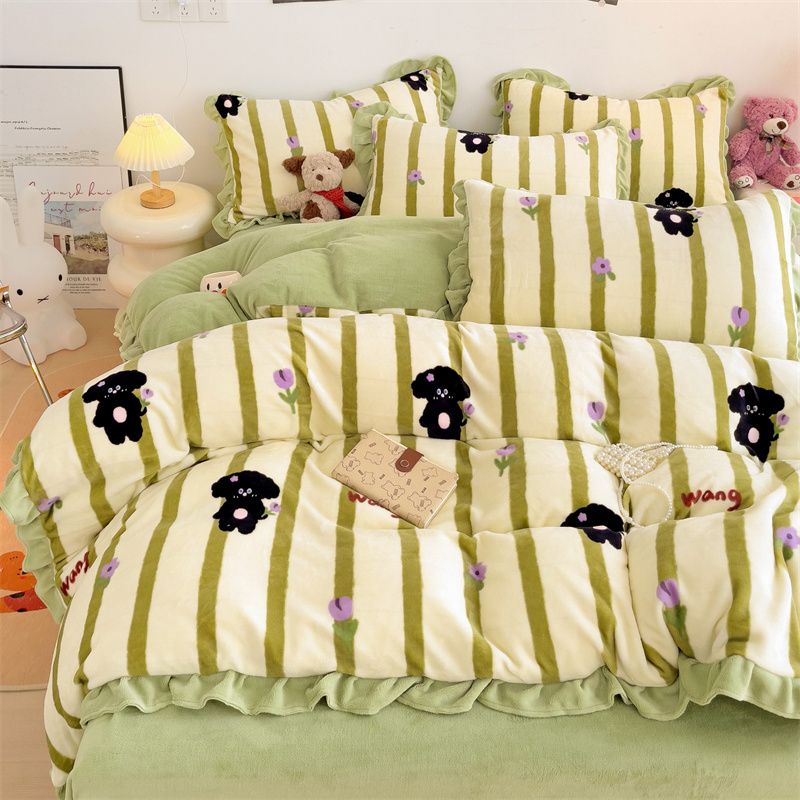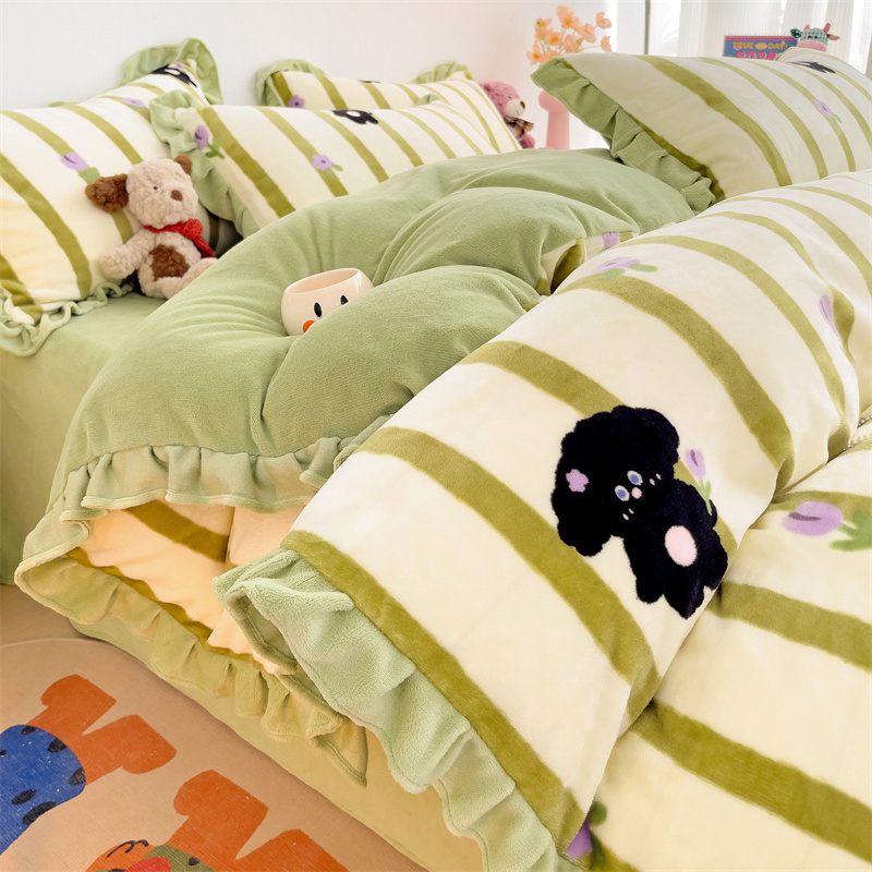 麦朵 2024高克重牛奶绒花边款四件套雪花绒金貂绒套件宝宝绒雕花绒被套 哈基米-绿