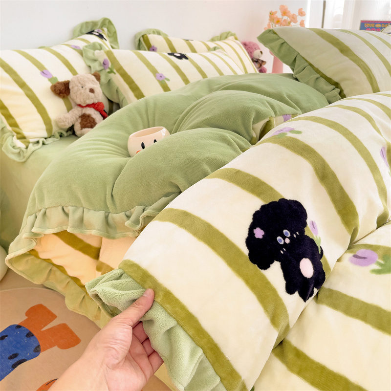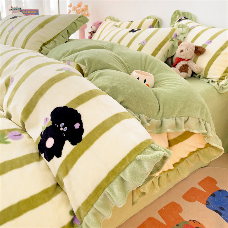 商品名称:麦朵 2024高克重牛奶绒花边款四件套雪花绒金貂绒套件宝宝绒雕花绒被套 哈基米-绿
