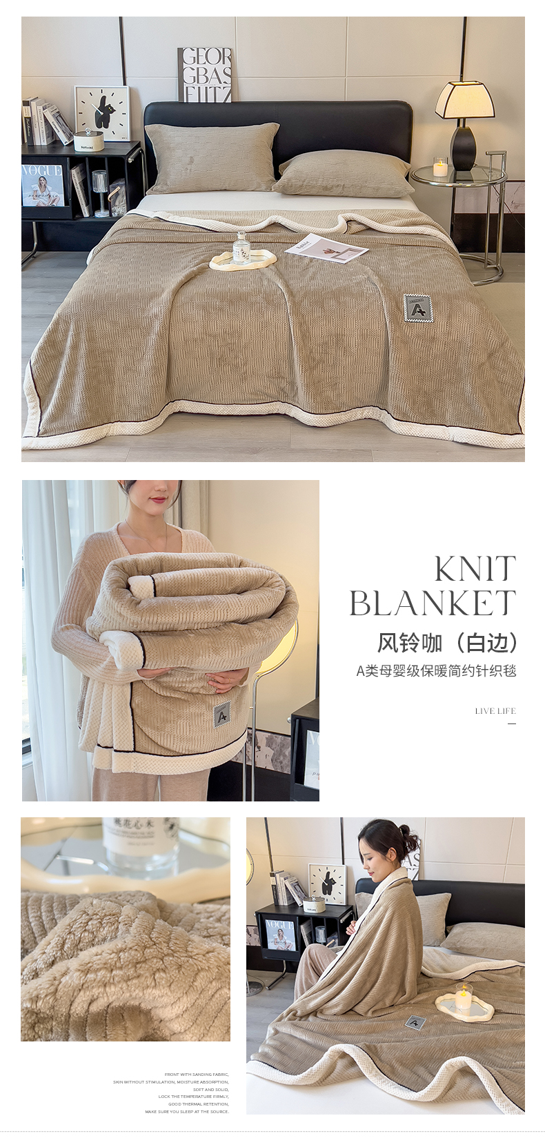 欧邦 新款简约针织绒毯牛奶绒包边单层毛毯 风铃咖(白边)