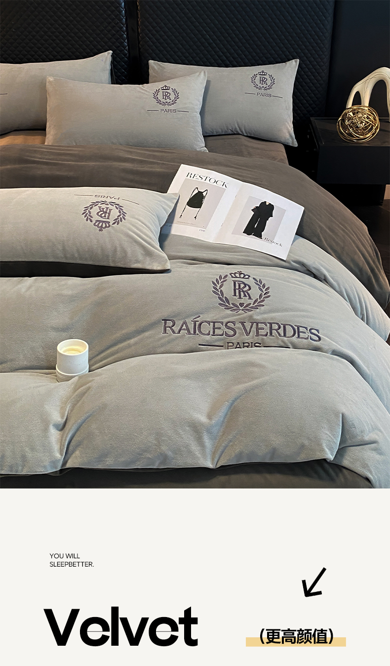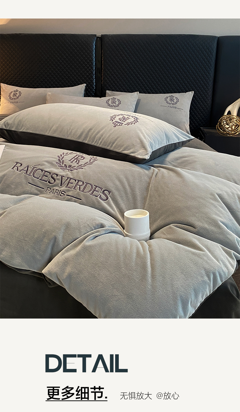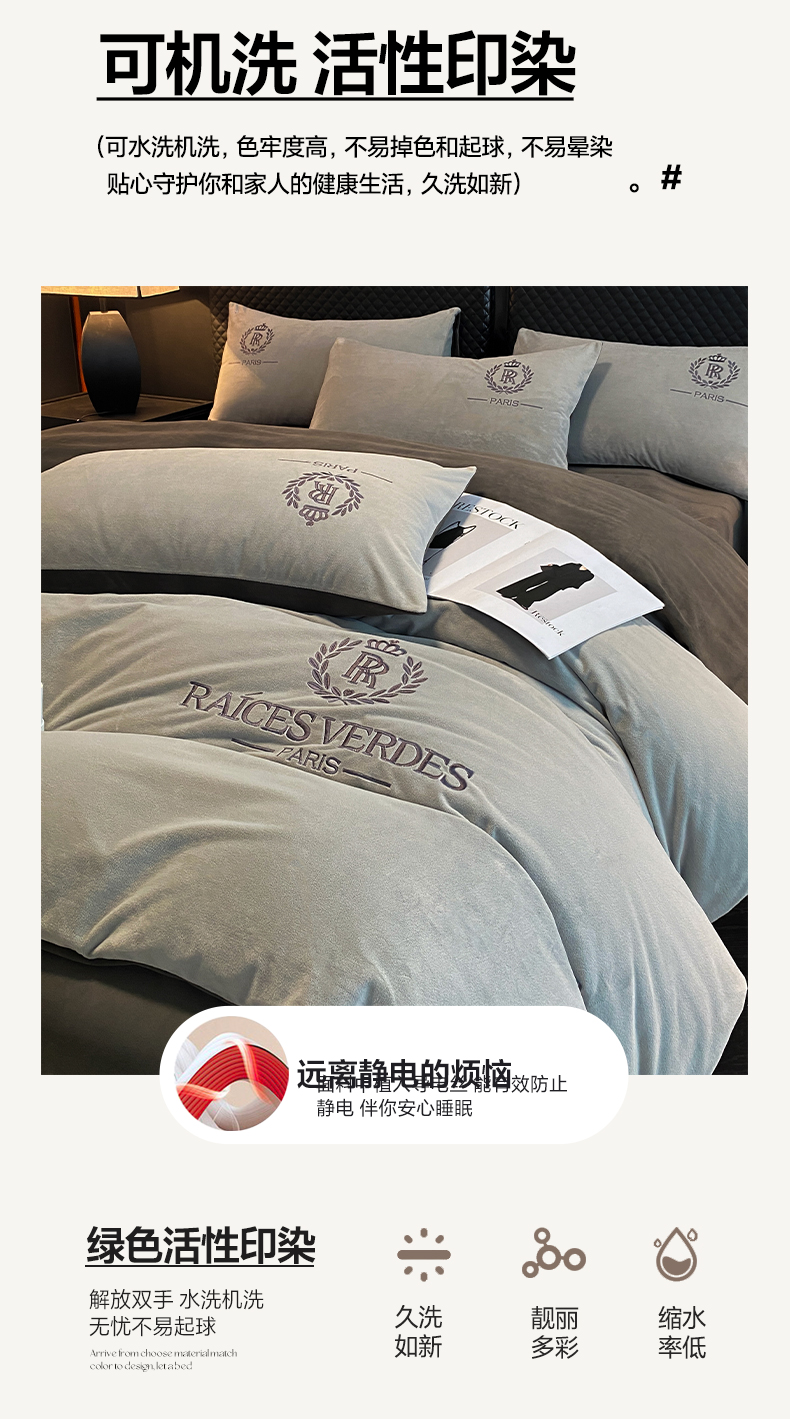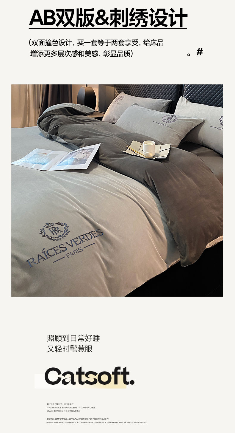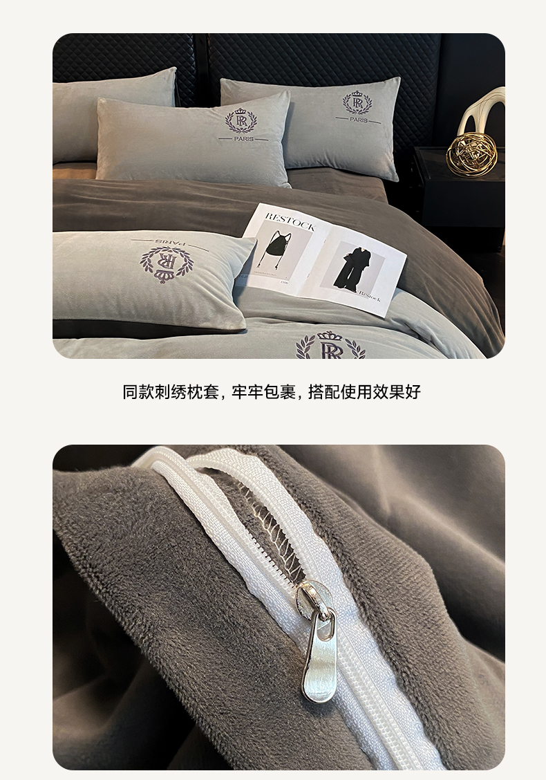 (总)如一 2025新款水晶绒双拼刺绣四件套轻羽系列-系列二,轻羽-典雅灰,轻羽-落日橙,轻羽-奶白咖,轻羽-深灰银,轻羽-雾蓝灰,轻羽-豆沙灰