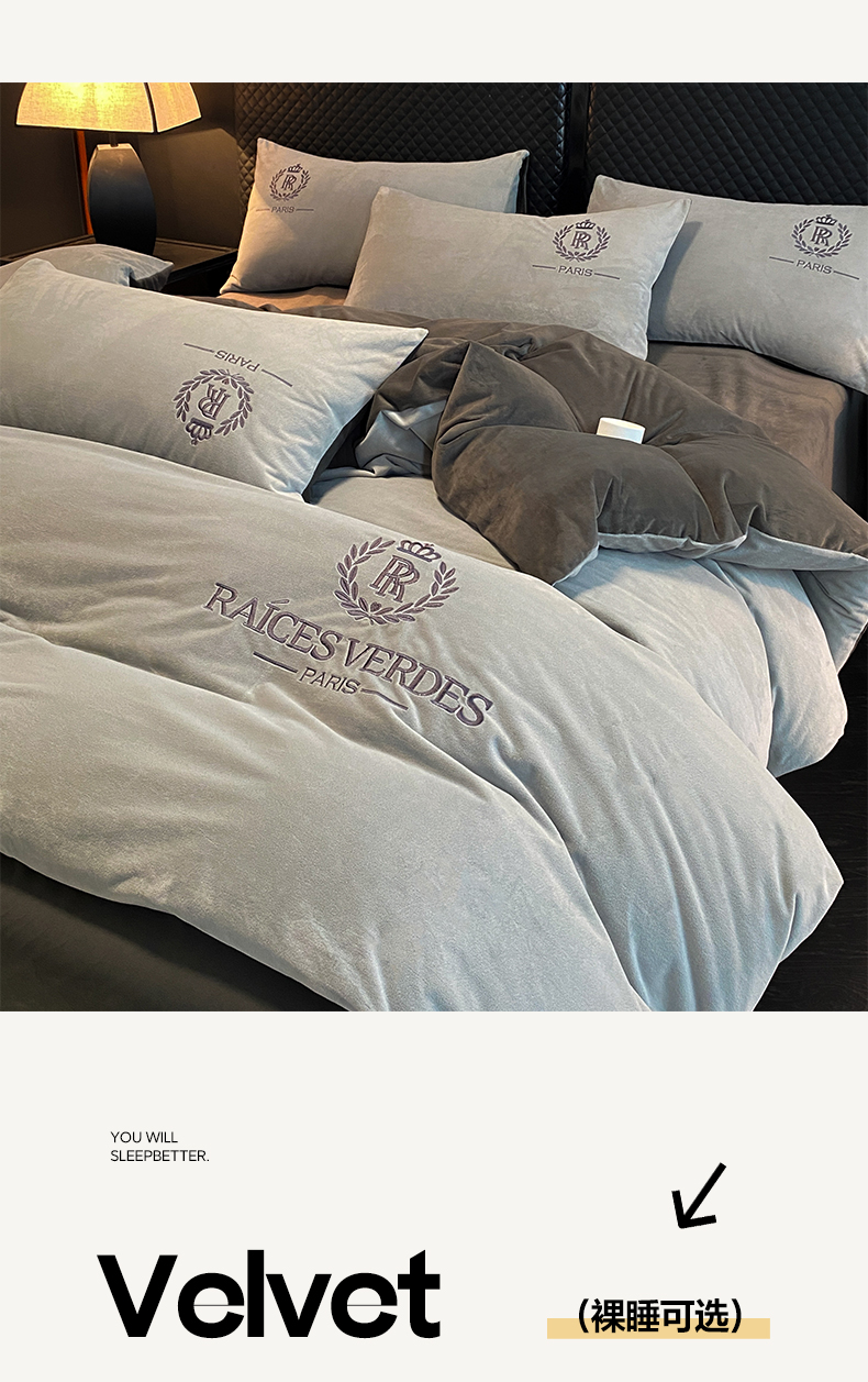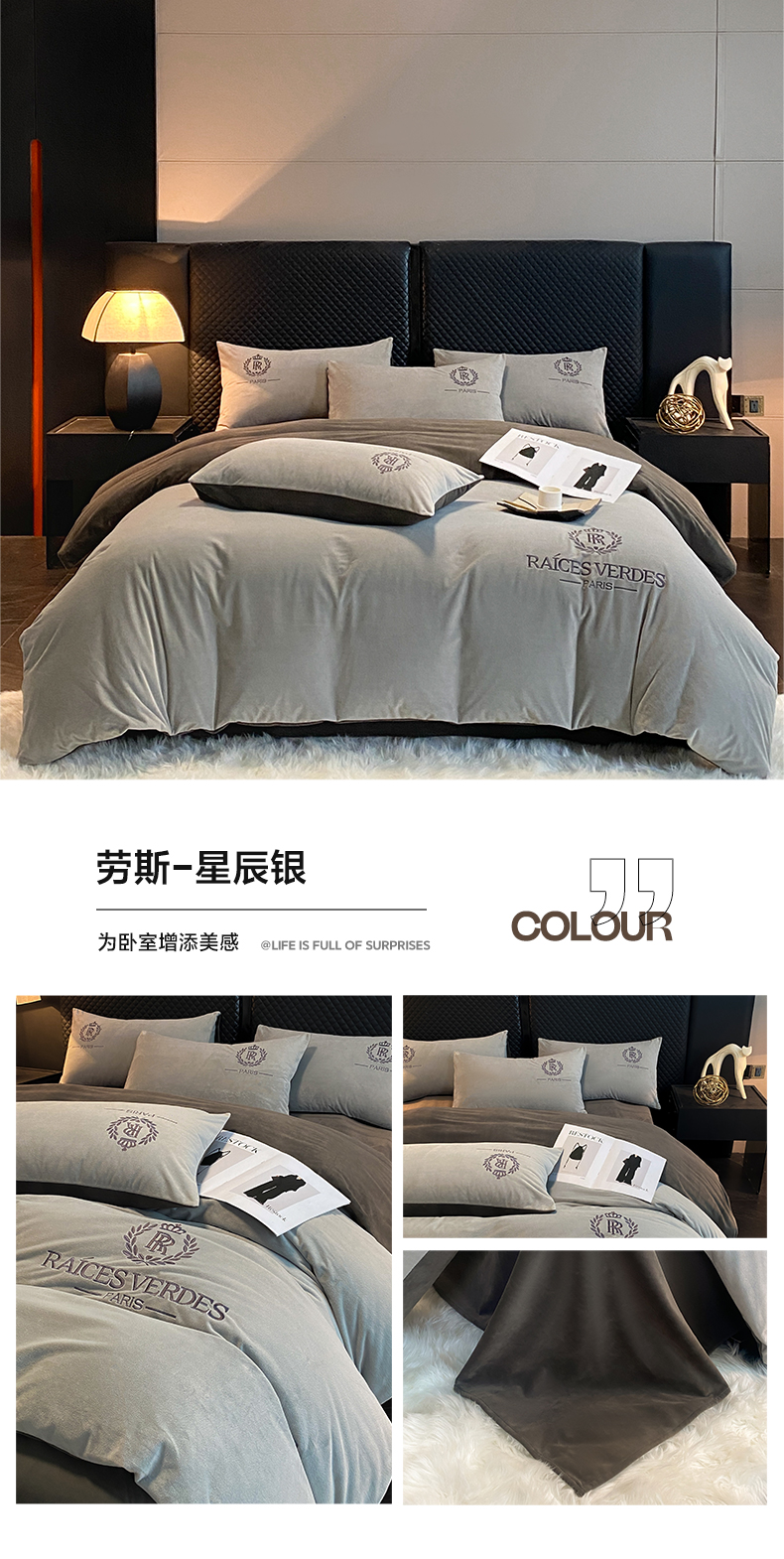 商品名称:如一 2024新款水晶绒双拼刺绣四件套-劳斯系列 劳斯-星辰银
