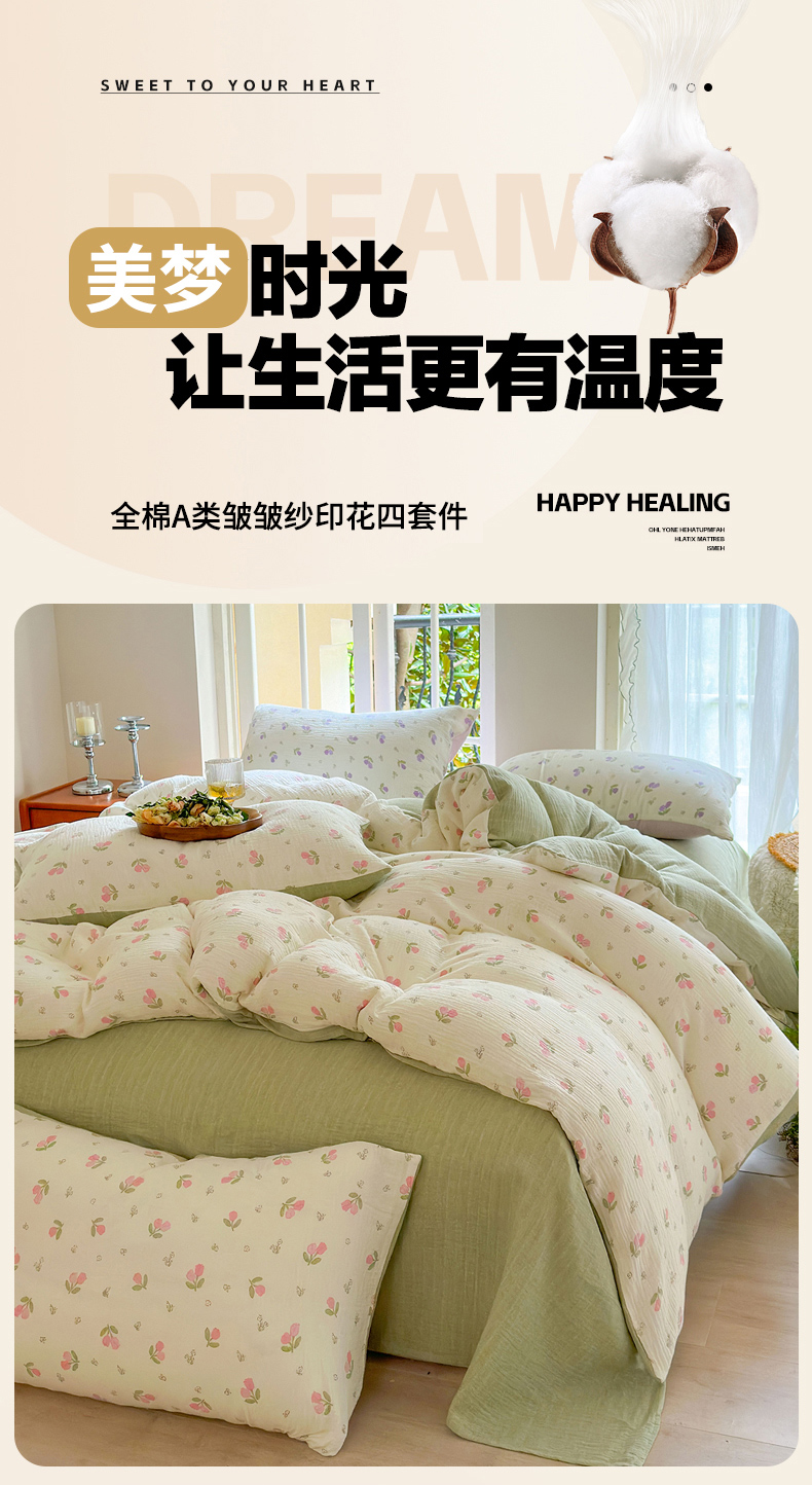 商品名称:木楌 2025新款全棉A类皱皱纱印花四件套 丁香-绿