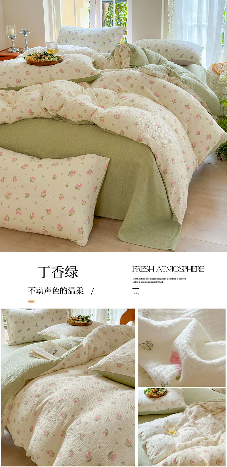 木楌 2025新款全棉A类皱皱纱印花四件套 丁香-绿,丁香-绿