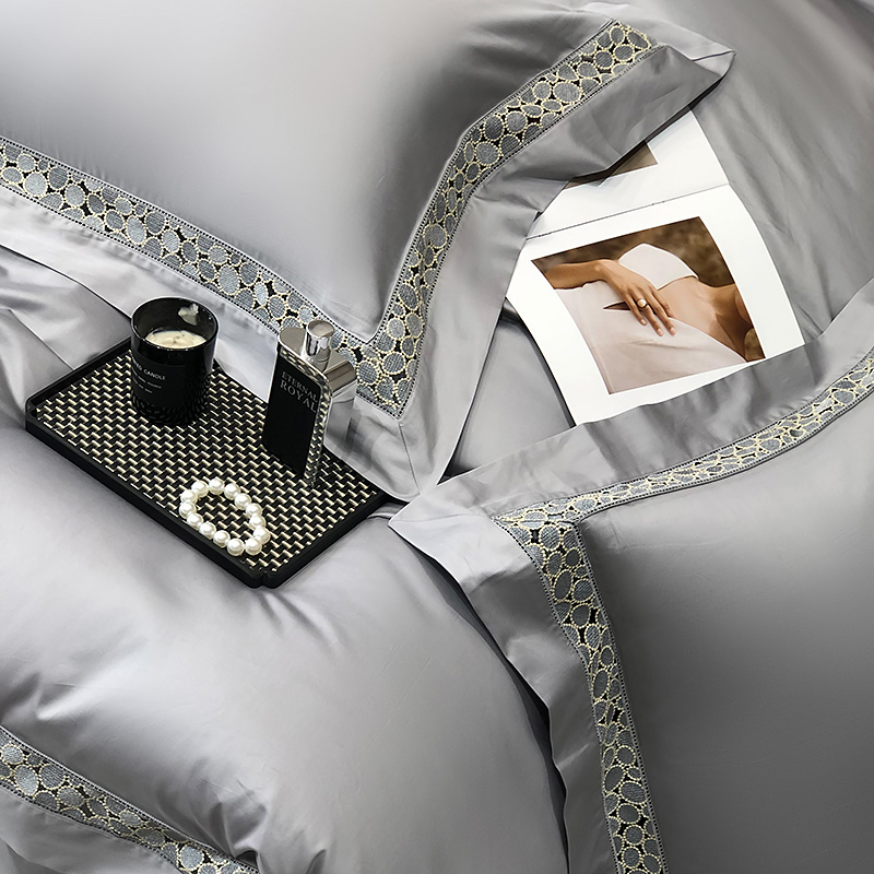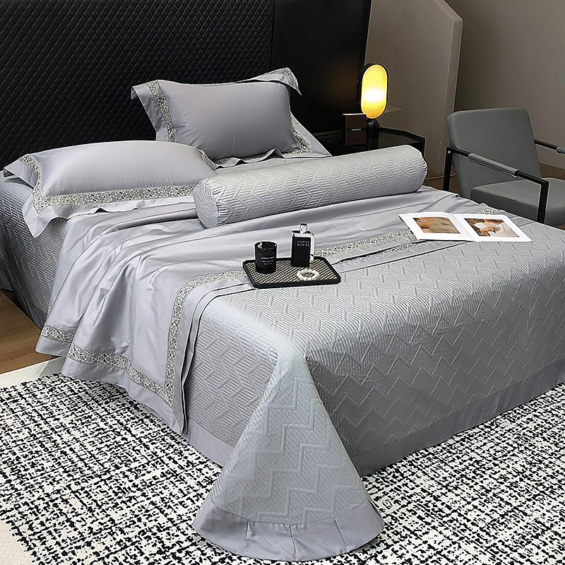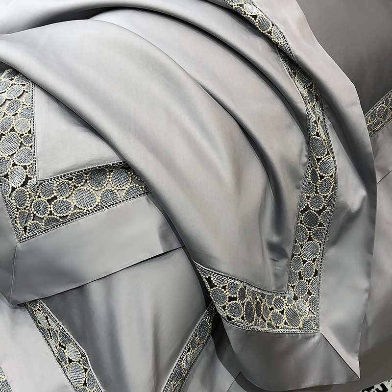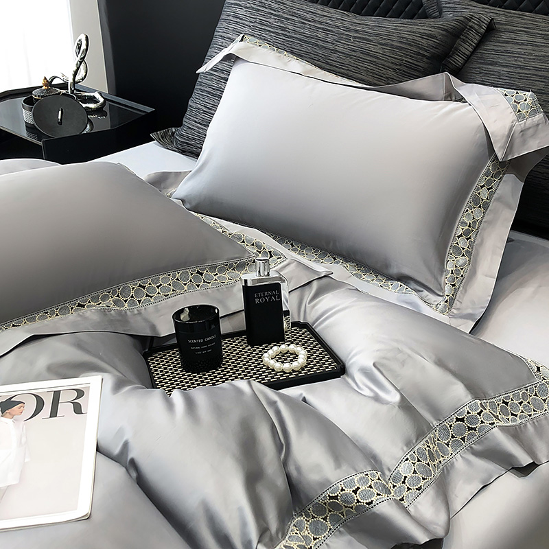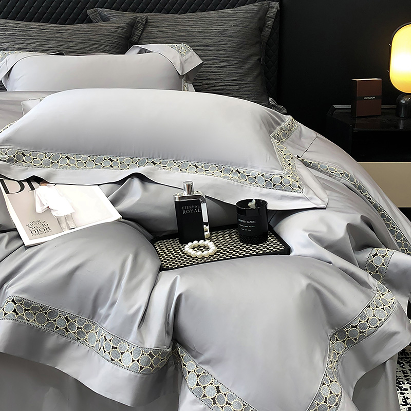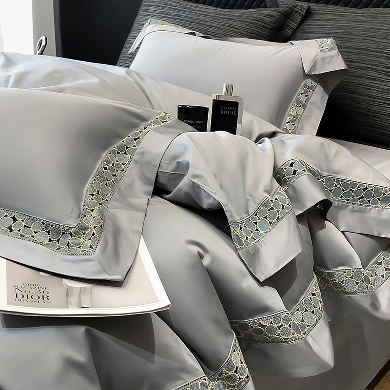 商品名称:若未家居 LOVEWE HOUSE 2025新款高工艺贡缎长绒棉全棉镂空床盖款四件套-奥黛尔 奥黛尔-气质灰