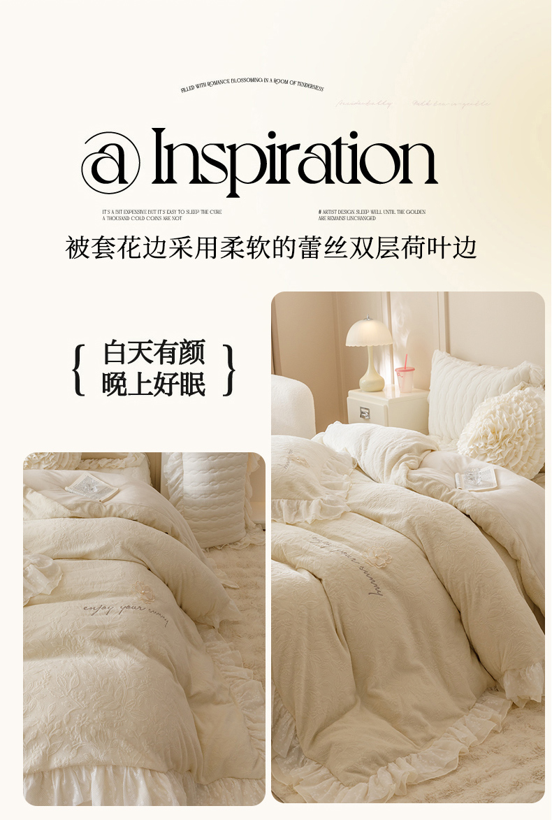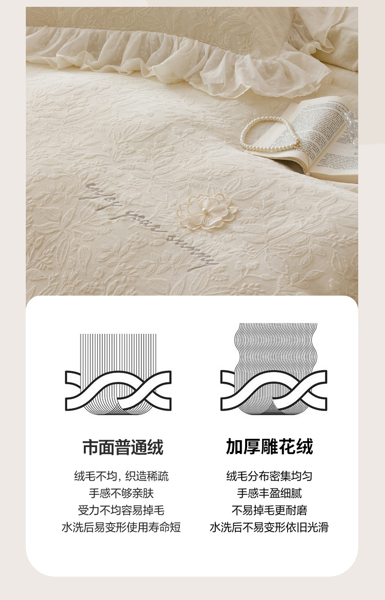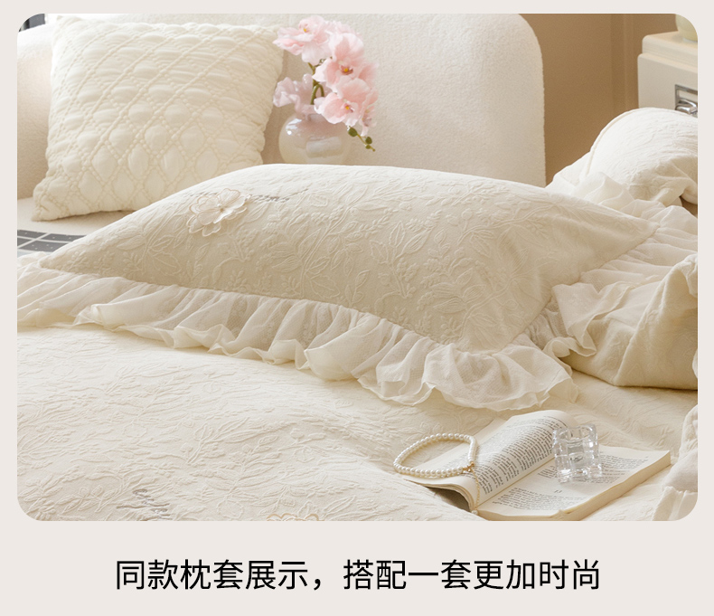 商品名称:胜权家纺 2024秋冬新款法式牛奶绒蕾丝床盖四件套系列-爱丽丝 爱丽丝-珍珠白