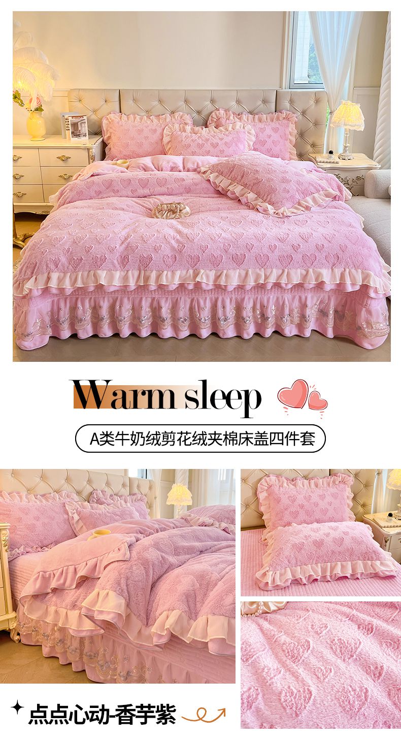 (总)宜凡家纺 2025新款兔绒提花牛奶绒夹棉床裙四件套,爱心 少女粉,爱心 粉紫,爱心 驼色,蝶舞 大红,蝶舞 米色,蝶舞 浅紫,蝶舞 玉色,简爱 苍青,简爱 豆沙紫,简爱 玉色,樱桃 苍青,樱桃 豆沙紫,樱桃 奶油白