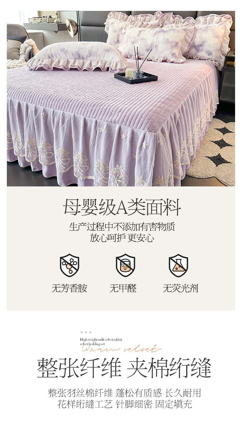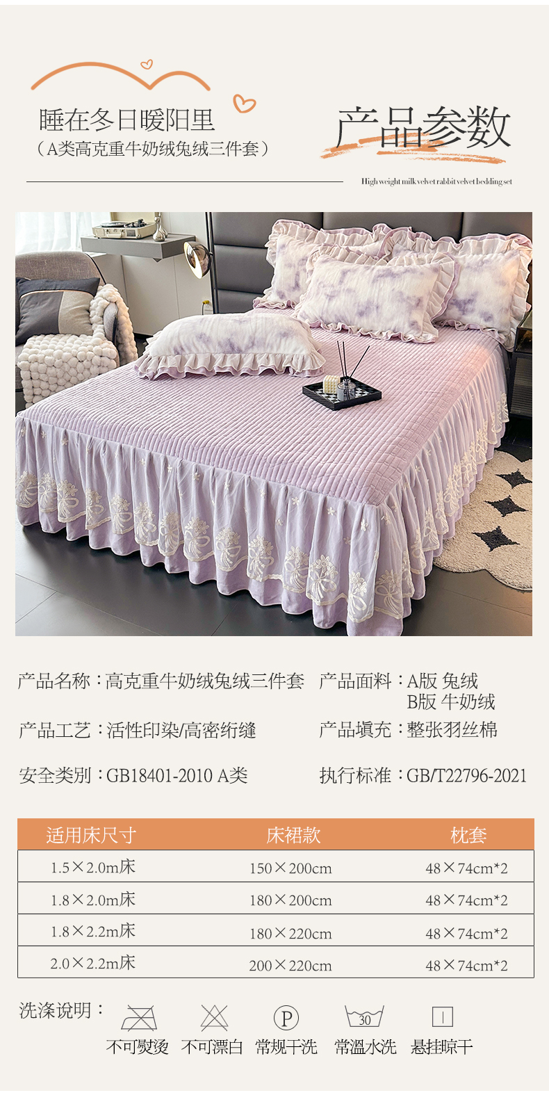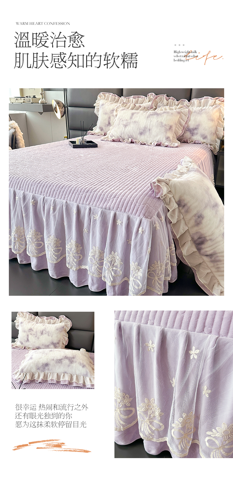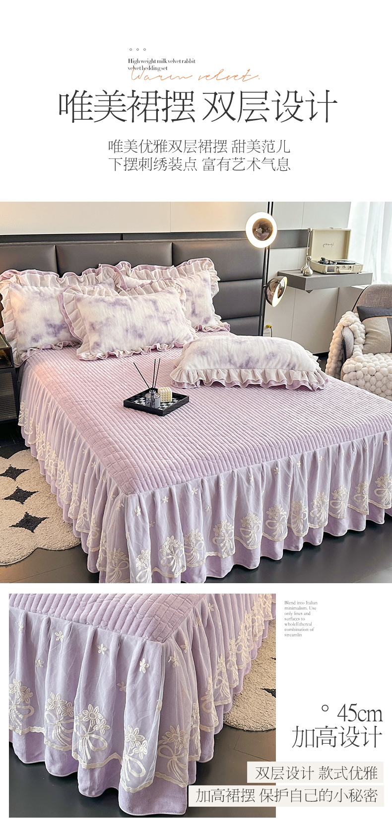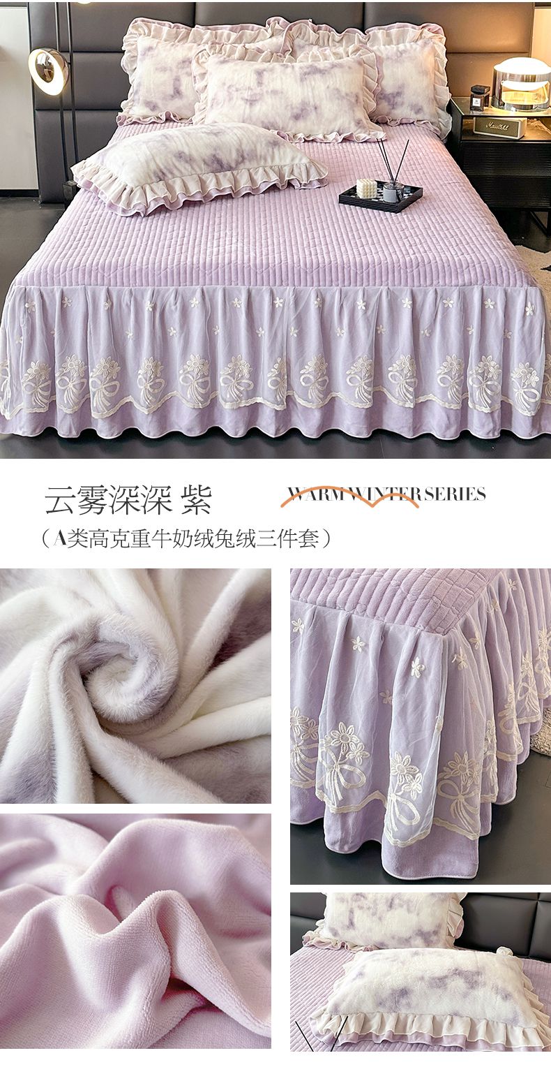 当前位置: 91家纺网 > 商品网购 > 床品套件 > 三件套 > 宜凡家纺 2024新款高克重牛奶绒兔绒床裙三件套 云雾深深 紫