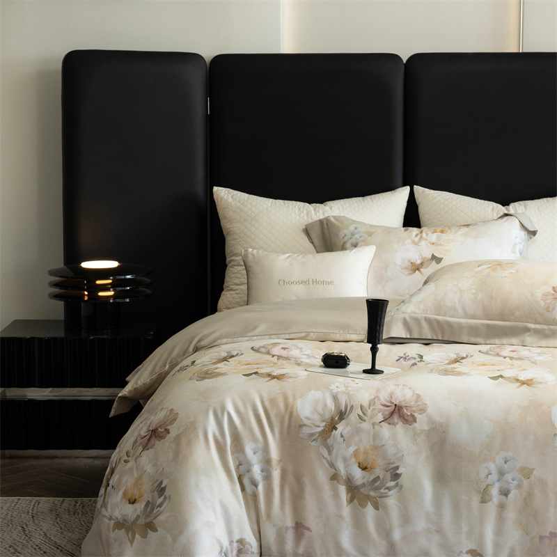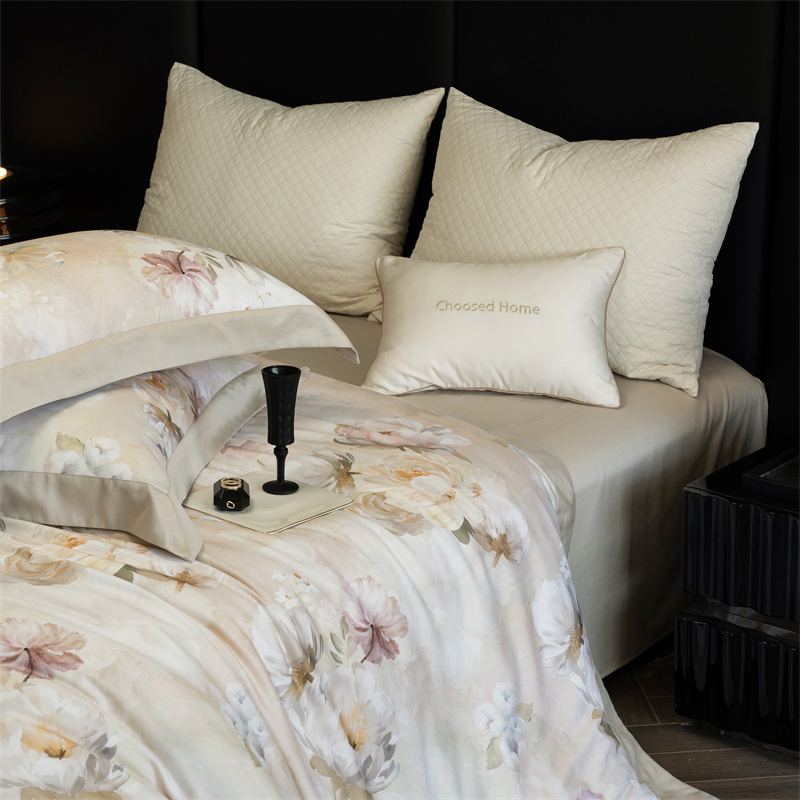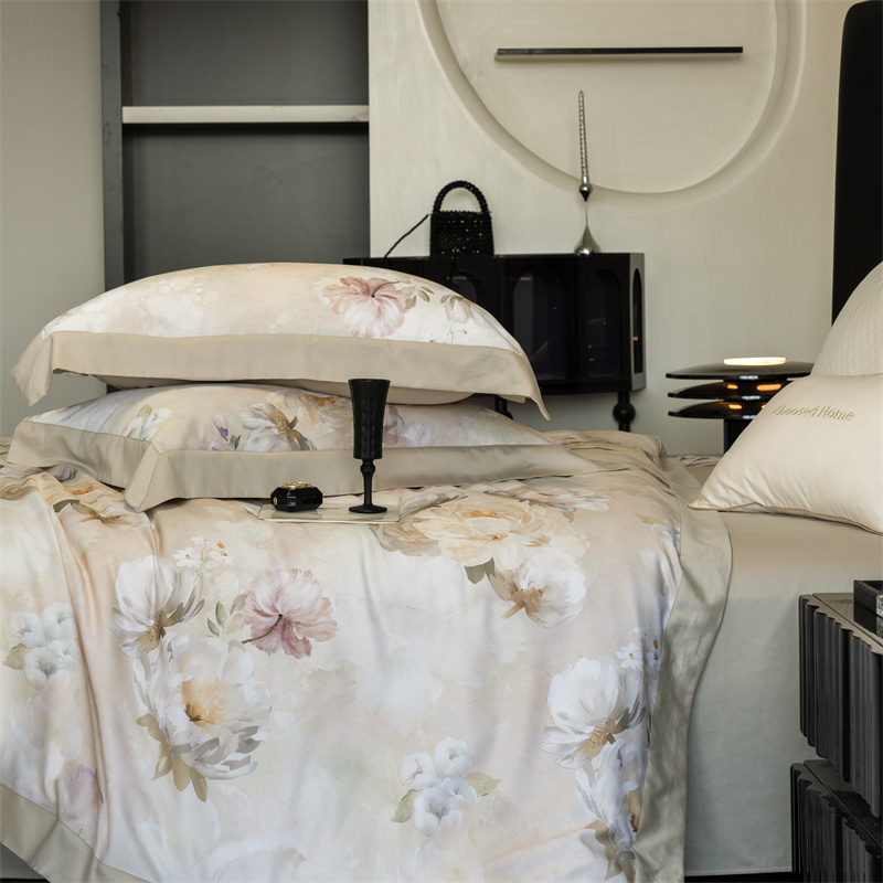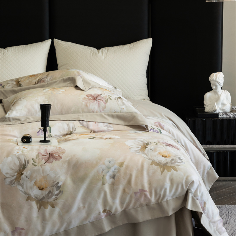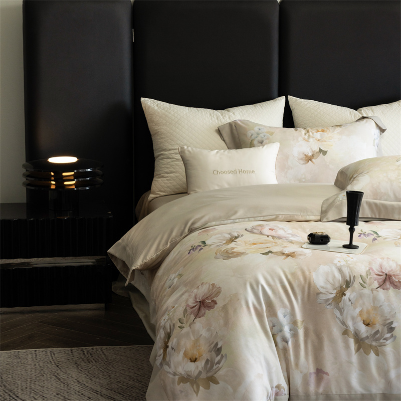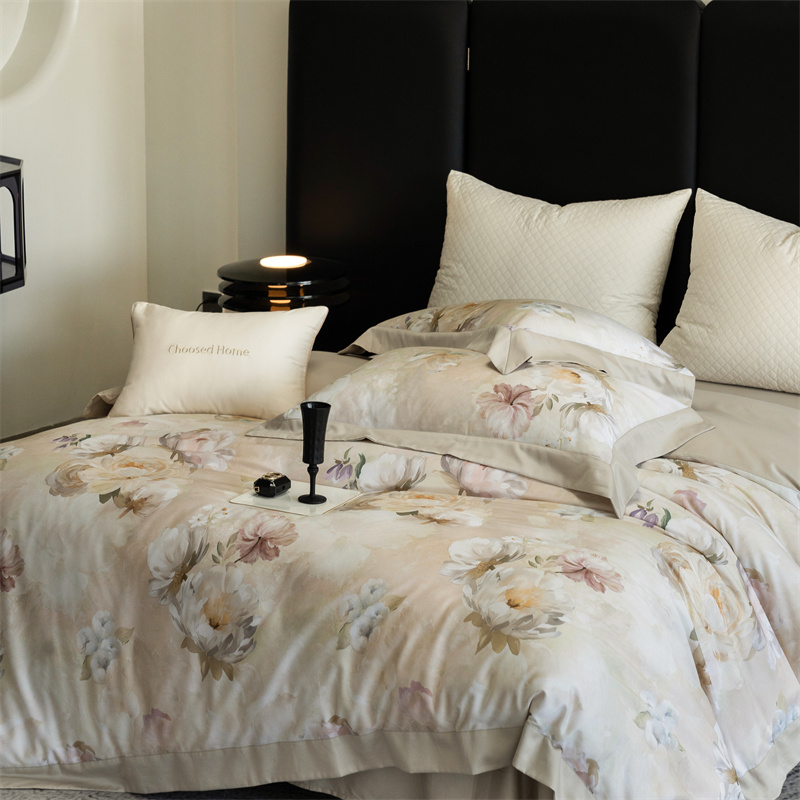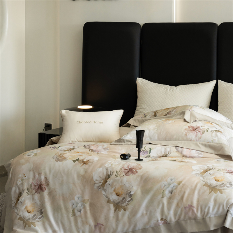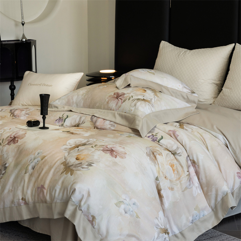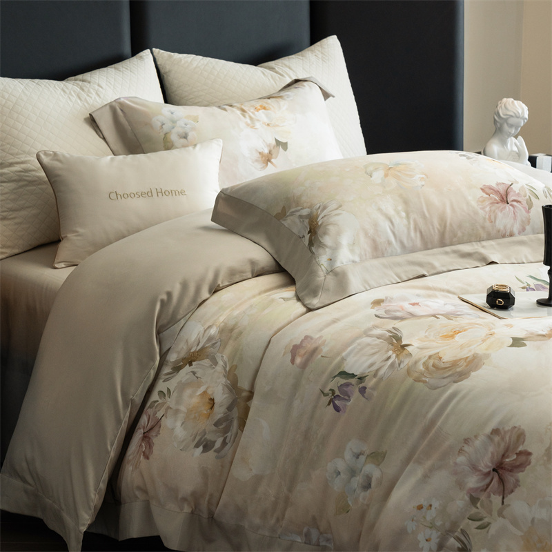 初拾 2024新款60s天丝棉磨毛数码印花四件套 花簇-米黄