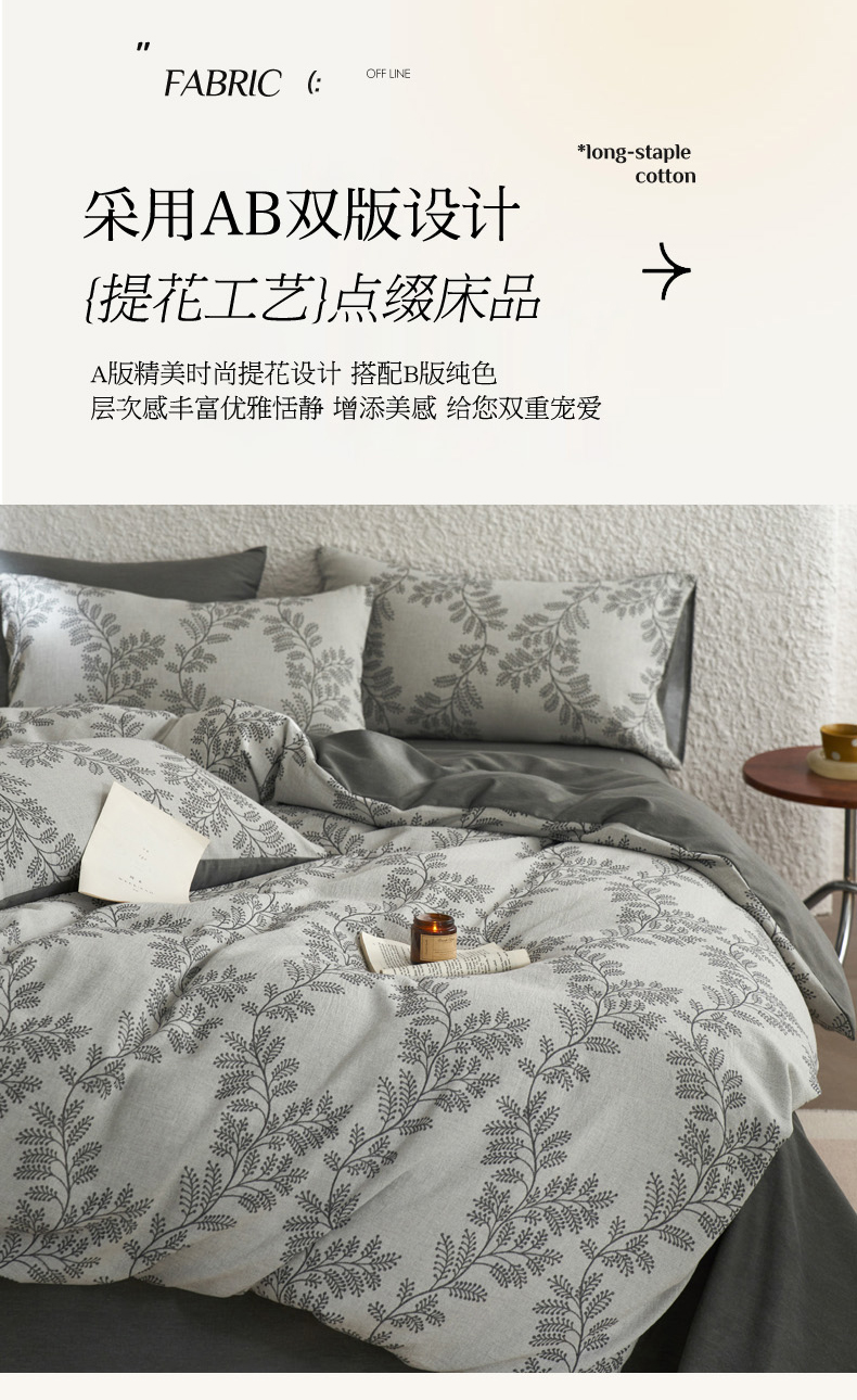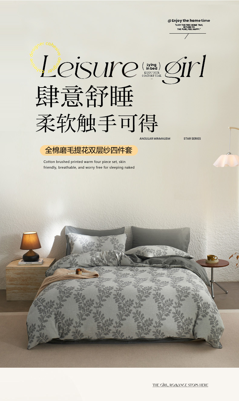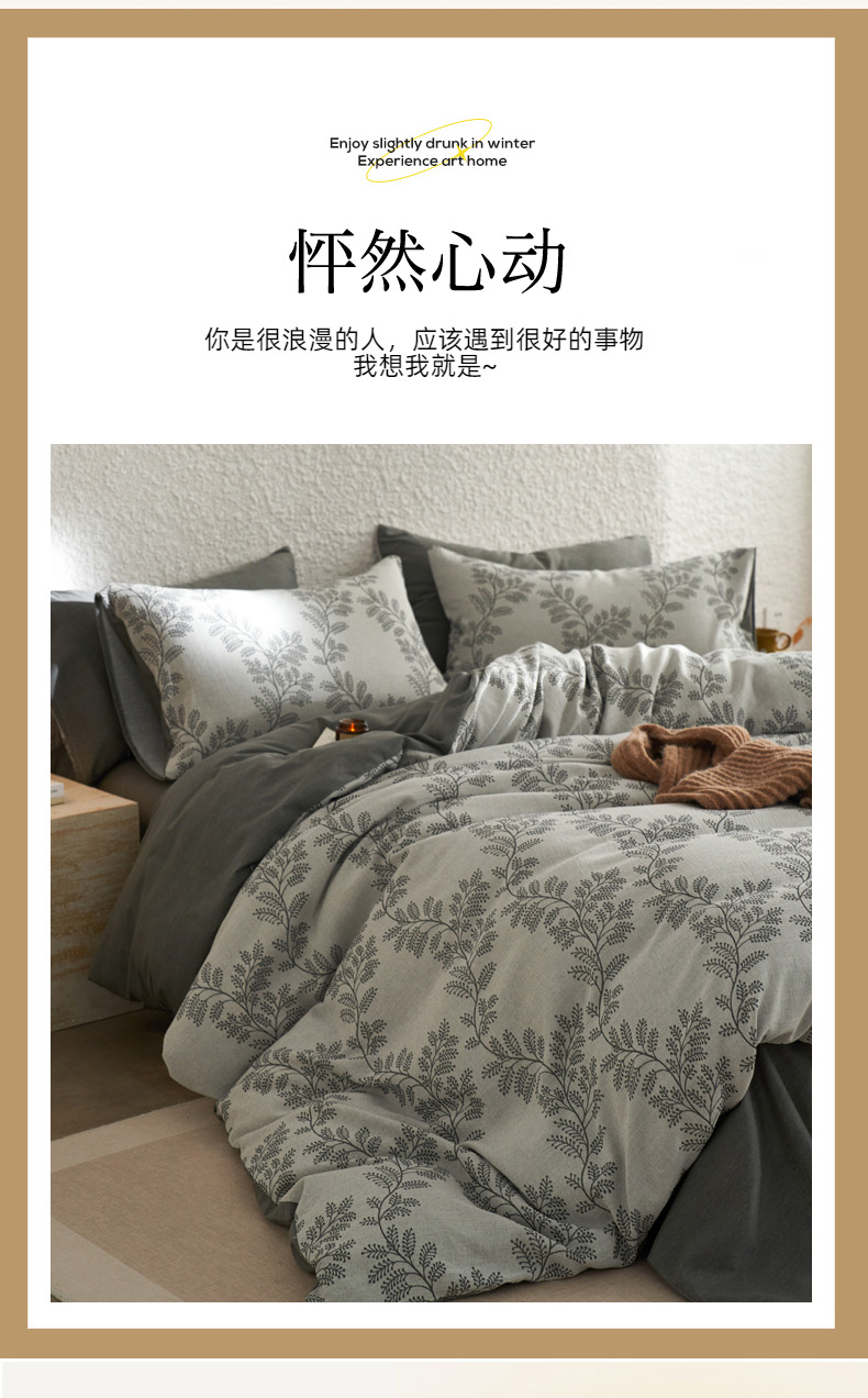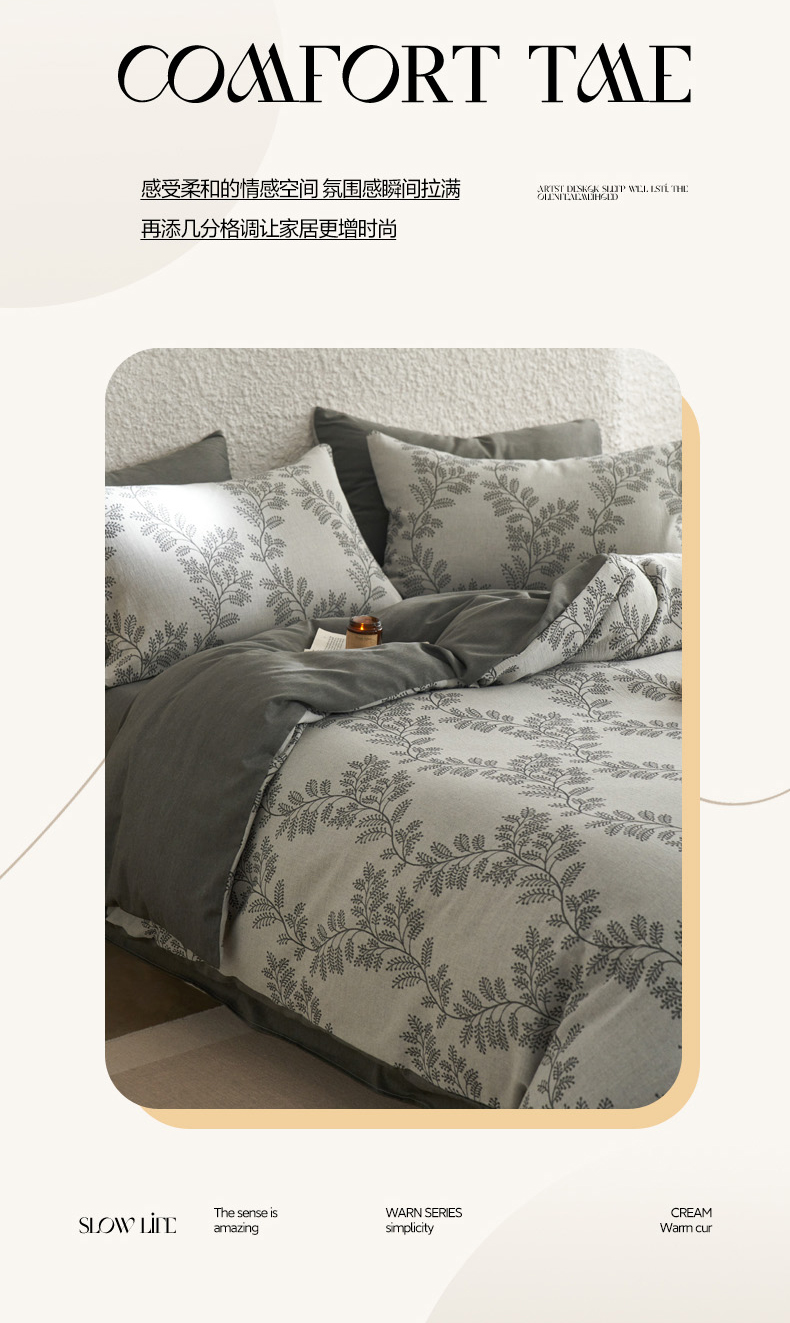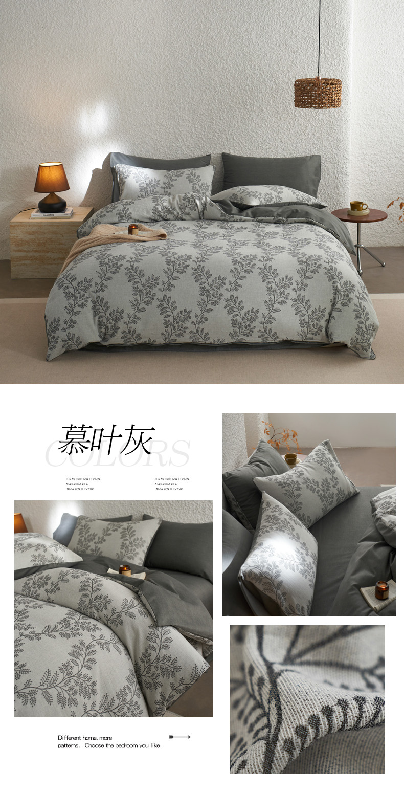 当前位置: 91家纺网 > 商品网购 > 床品套件 > 四件套 > 普通磨毛四件套 > 慕尚家纺 2025新款磨毛提花双层纱四件套 慕叶灰