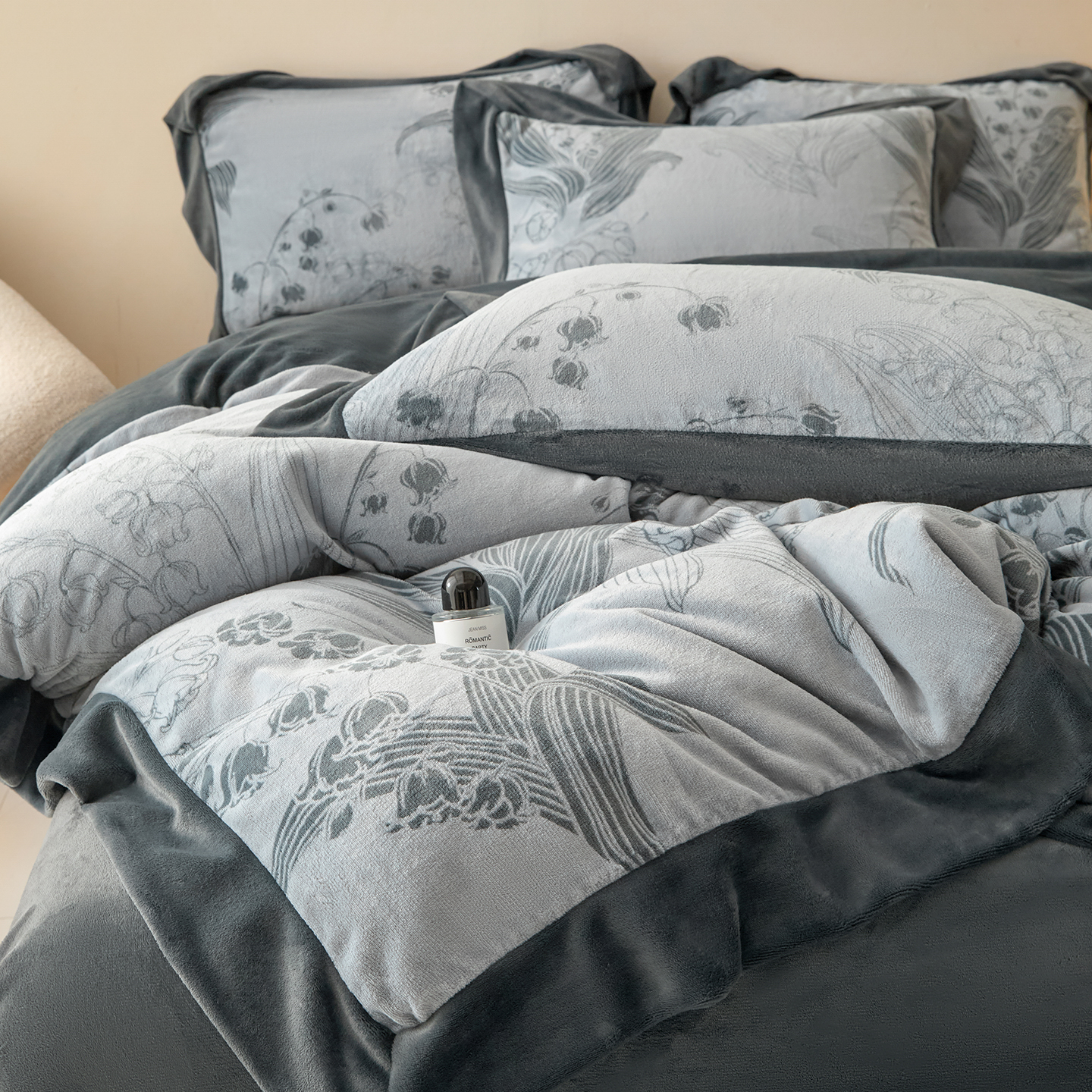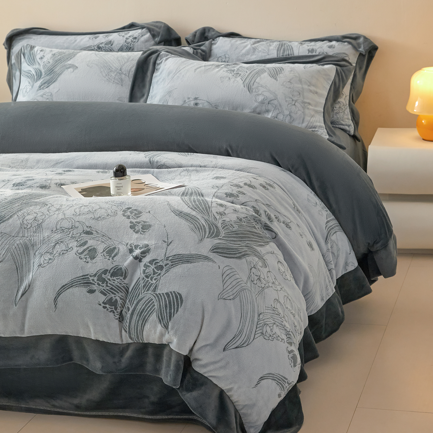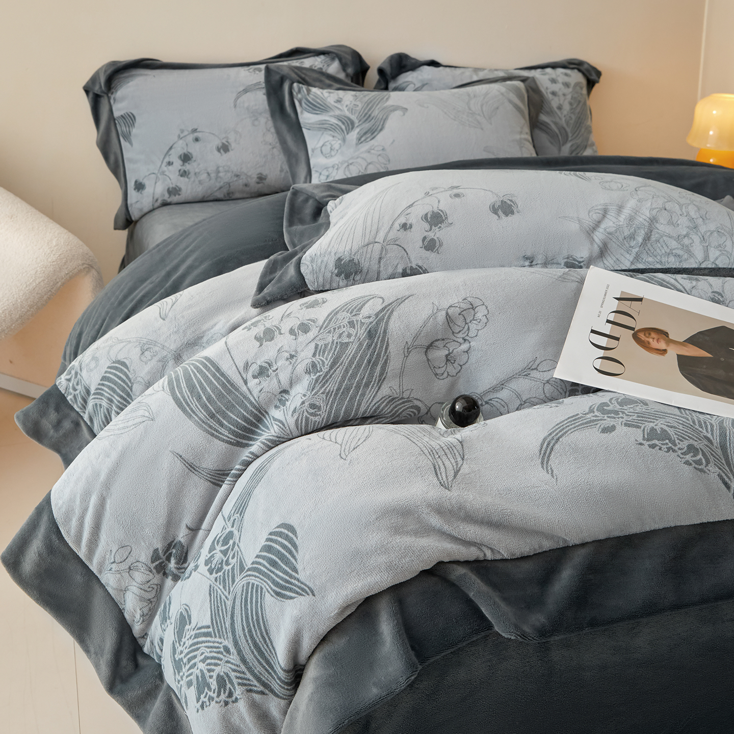 商品名称:新方向 2025新款高克重240克A类全消光印花牛奶绒四件套-铃兰 铃兰-深灰