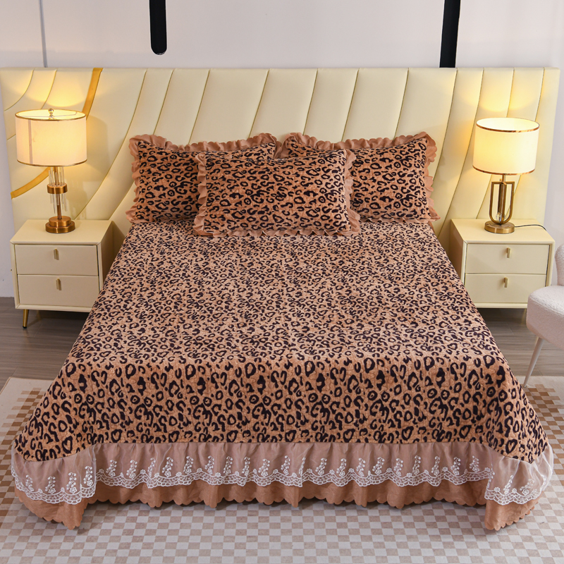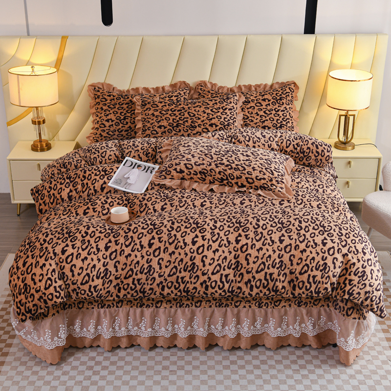 雅眠居 2025新款直播爆款牛奶绒印花床盖四件套双层蕾丝花边床裙单件三件套豹纹咖