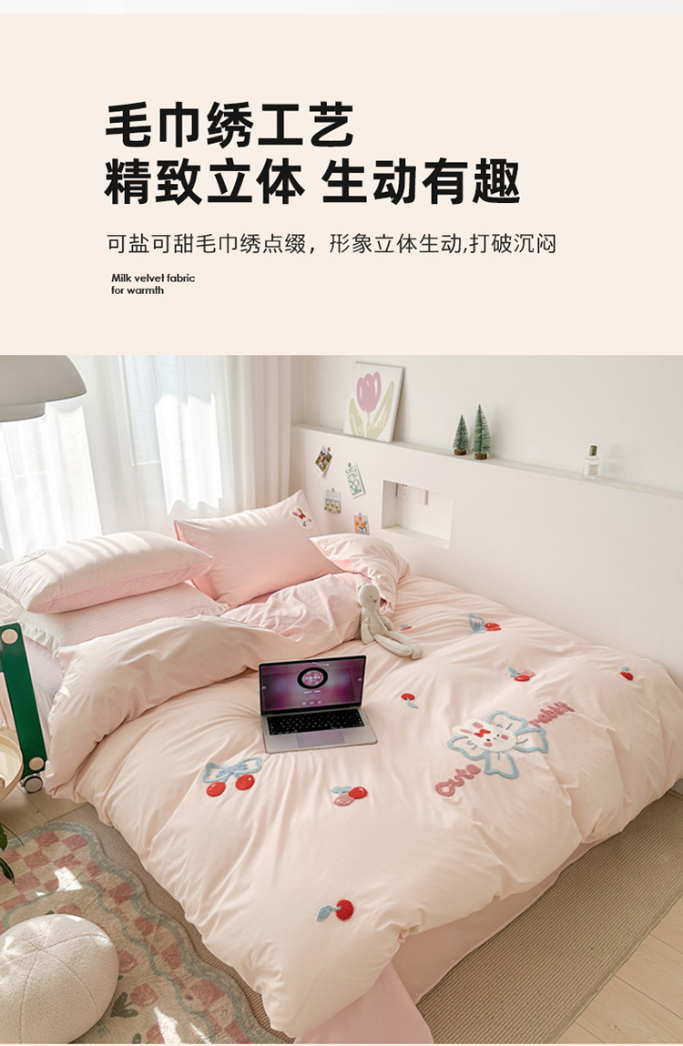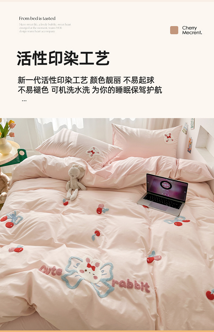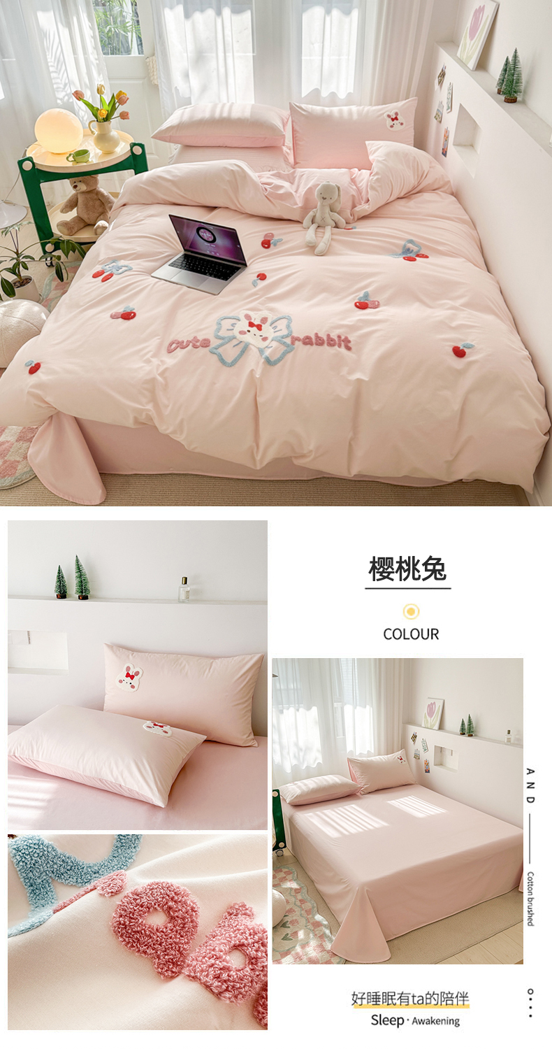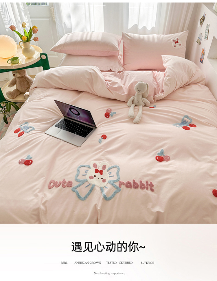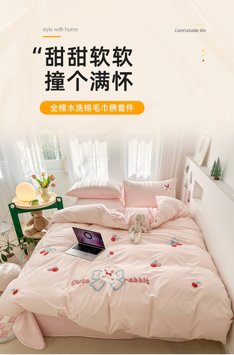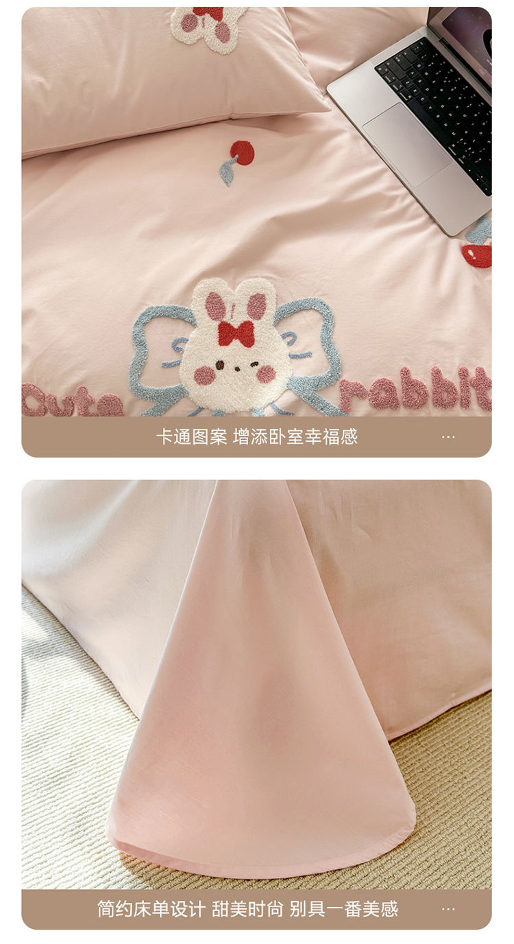 商品名称:买家秀热款花型不断货 母婴级A类ins风水洗棉四件套水洗棉毛巾绣四件套水洗棉床笠四件套提花绣花四件套 樱桃兔