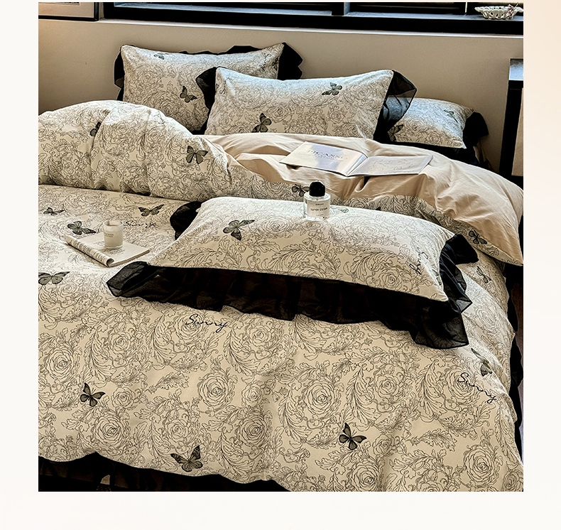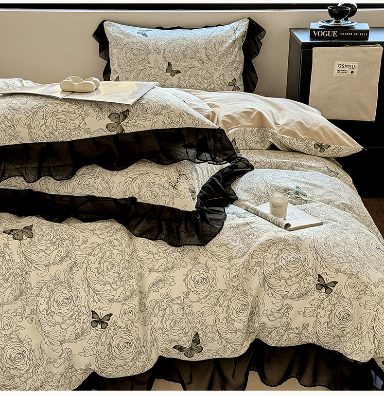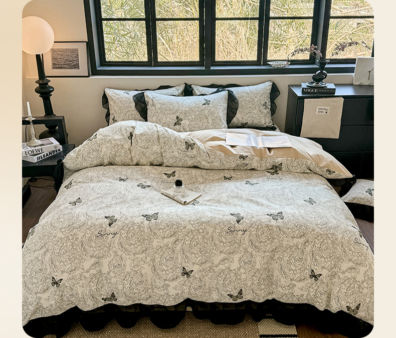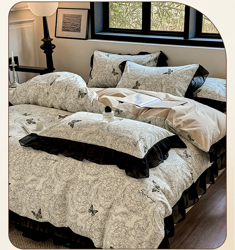 床品套件 > 宅家居 2025新款爆款轻法式赫本风复古印花13372纯棉四件套韩式黑色花边40支全棉三件套 蝶舞