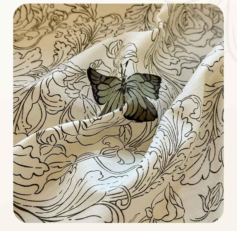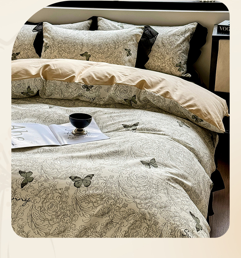 宅家居 2025新款爆款轻法式赫本风复古印花13372纯棉四件套韩式黑色花边40支全棉三件套 蝶舞