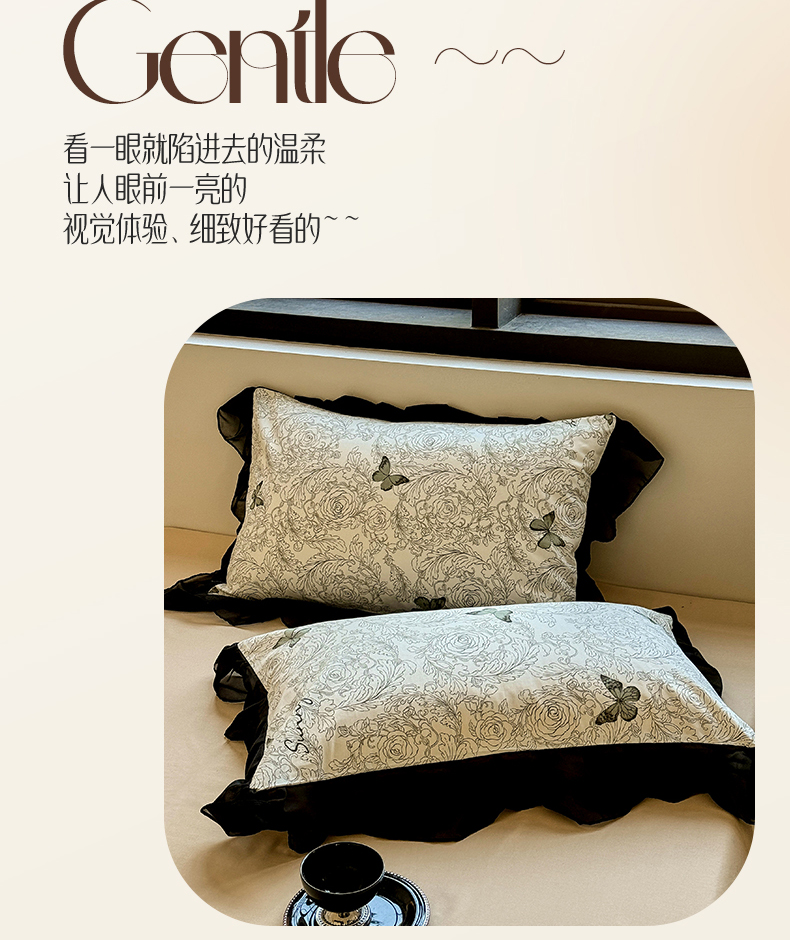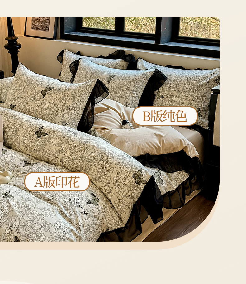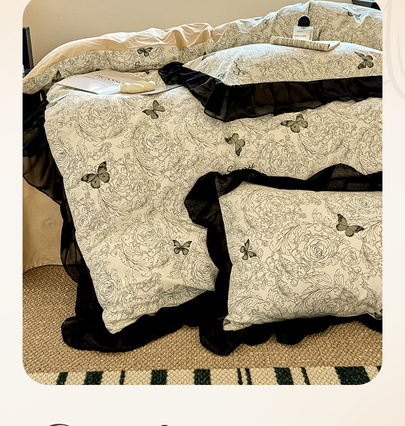 商品名称:宅家居 2025新款爆款轻法式赫本风复古印花13372纯棉四件套韩式黑色花边40支全棉三件套 蝶舞