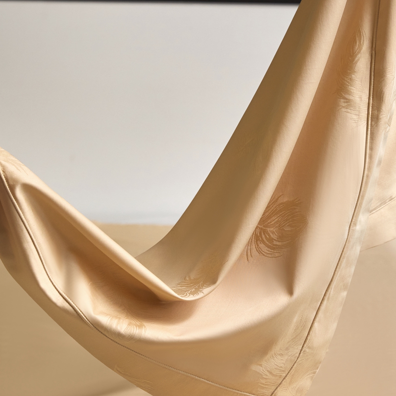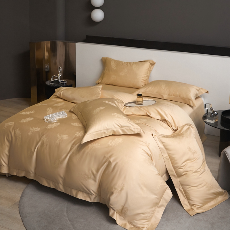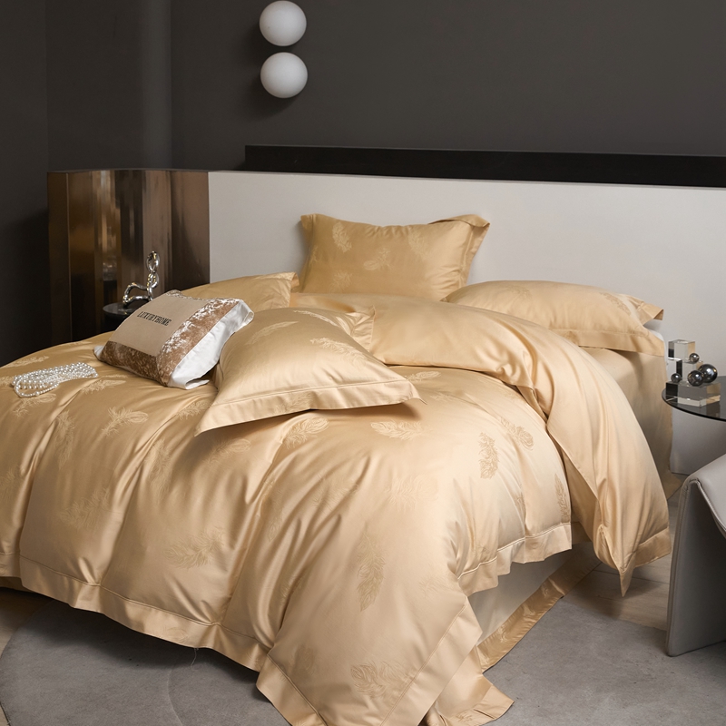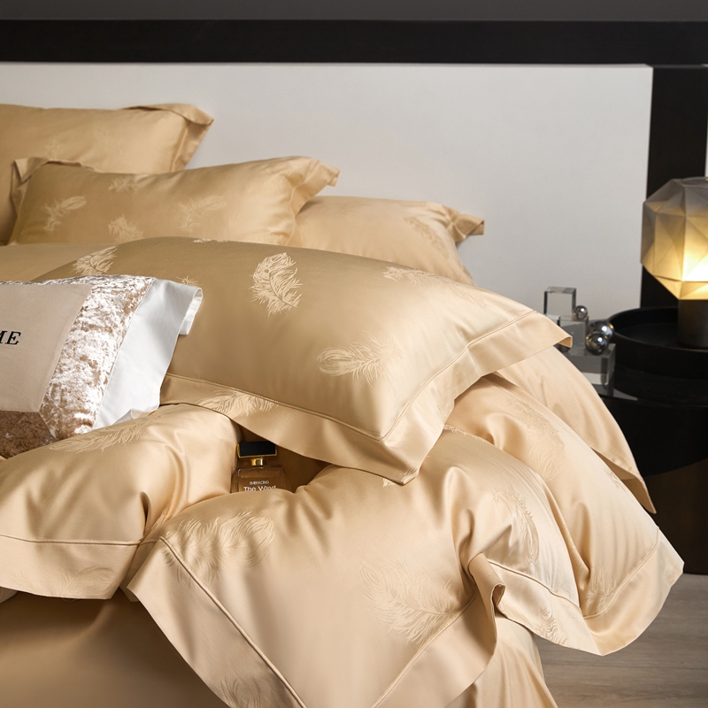 商品名称:淳绵家居 2025新款50*50S长绒棉贡缎提花手工立体埋绳工艺四件套(礼盒包装)飘羽(香槟金)