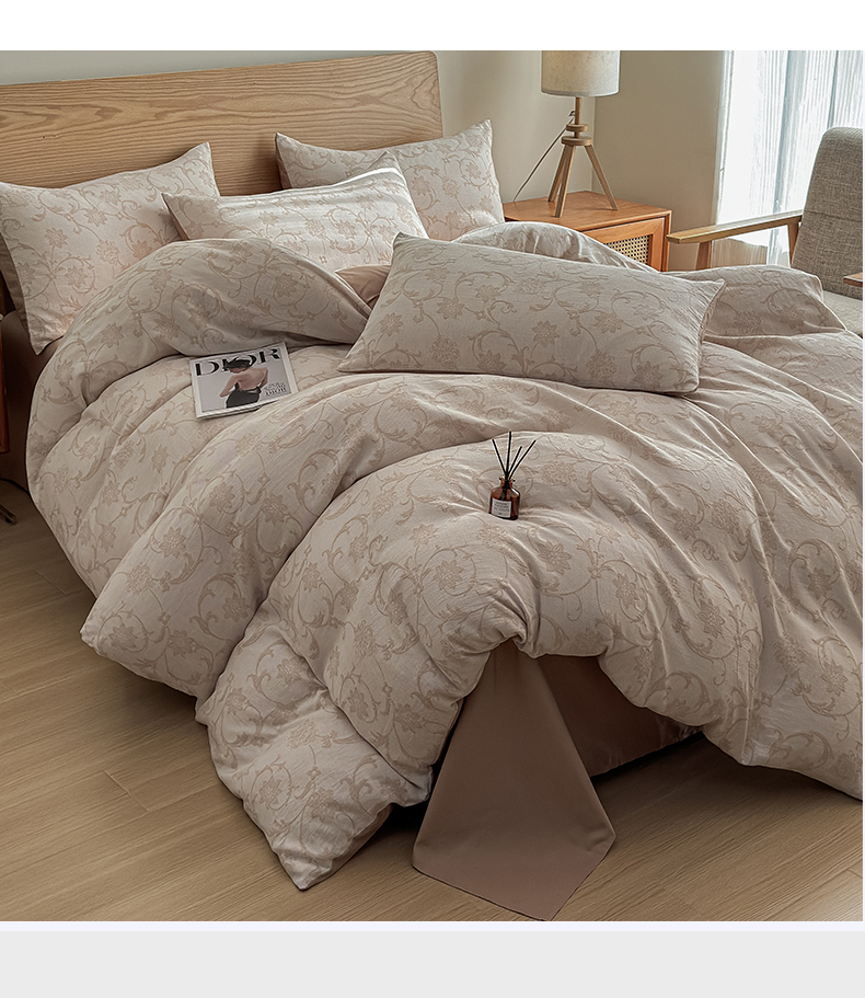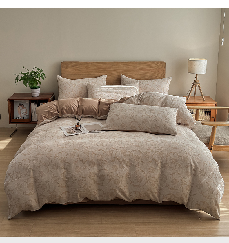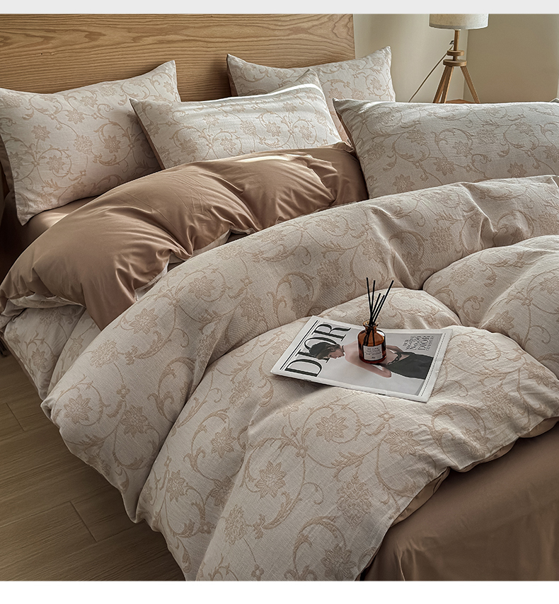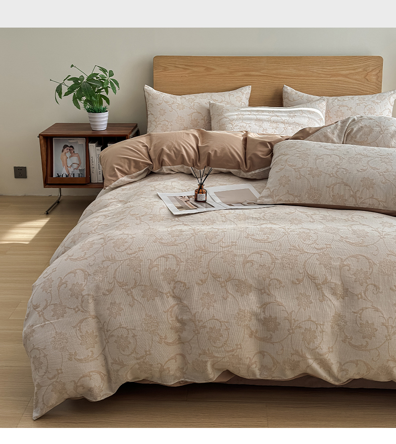 莱茵家居 2025春夏新款A类三层纱色织提花全棉四件套 花蔓咖
