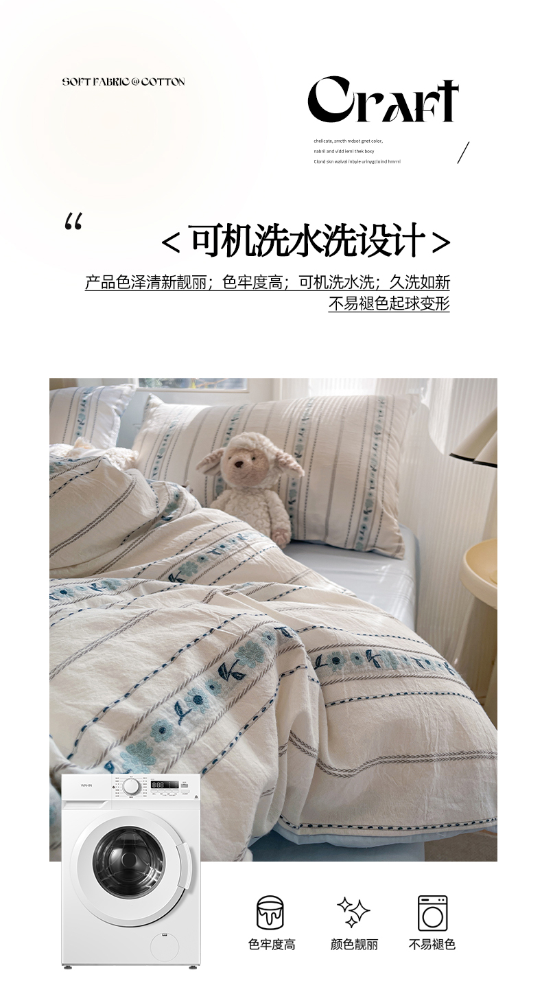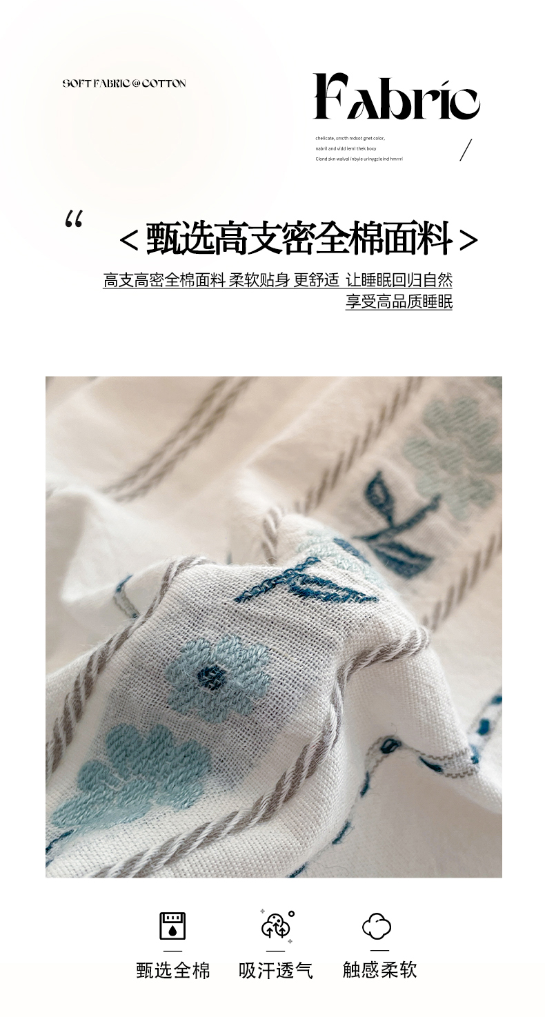 商品名称:莱茵家居 2025春夏新款A类田园风小碎花色织钩花全棉四件套-沐阳系列 沐阳-海盐蓝