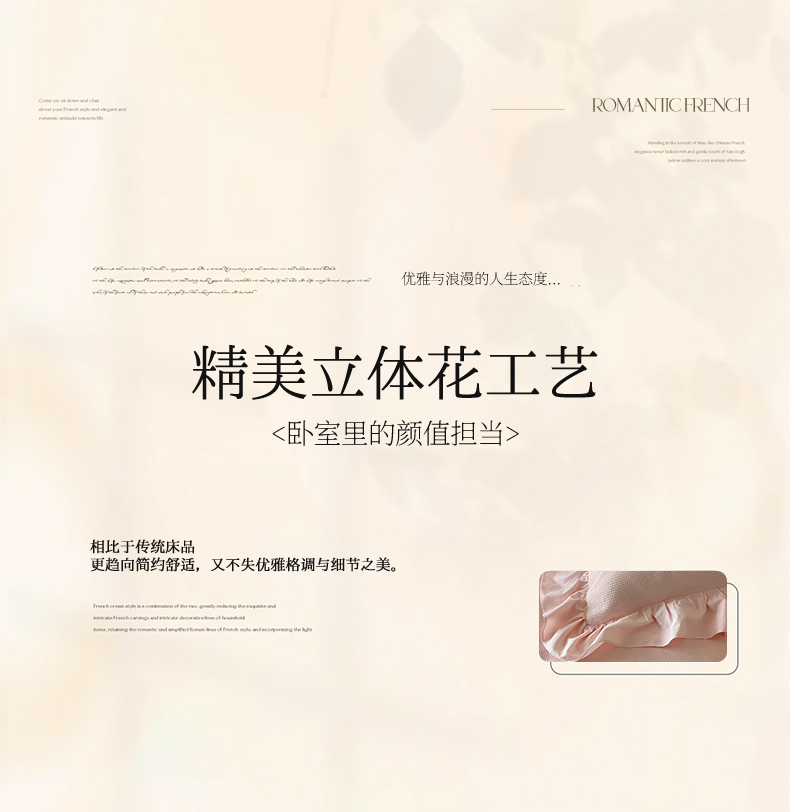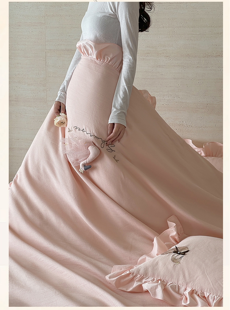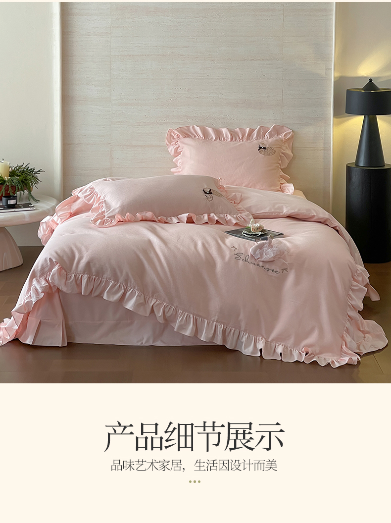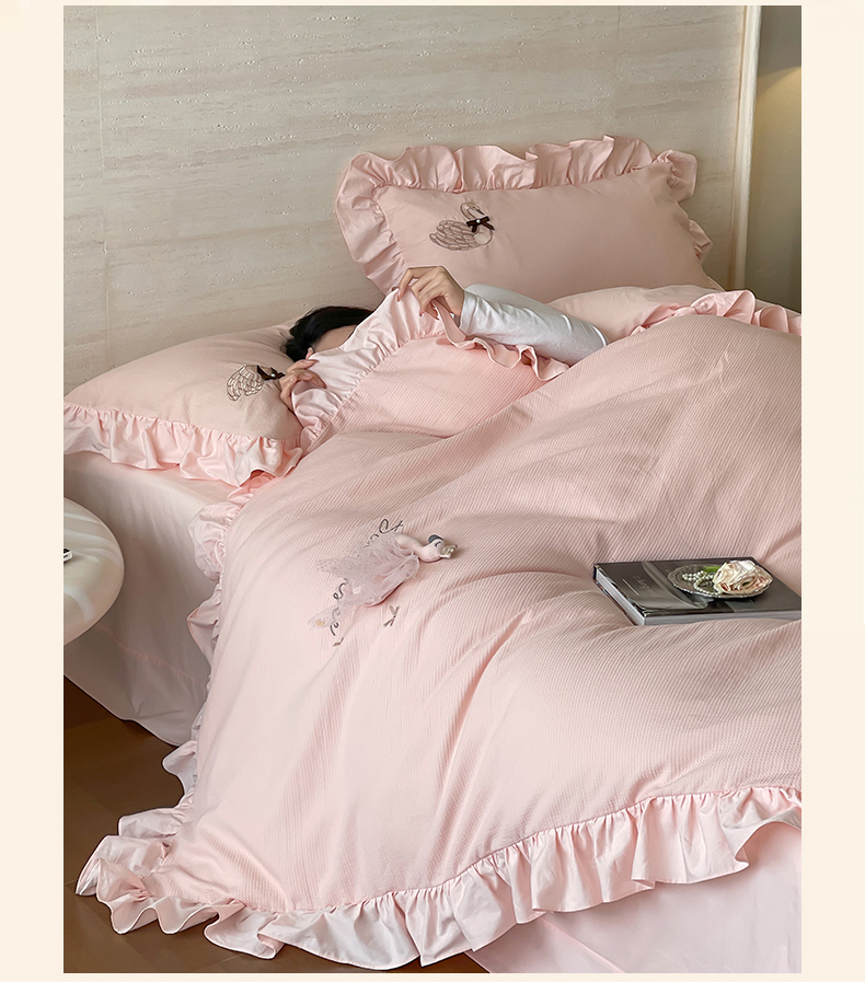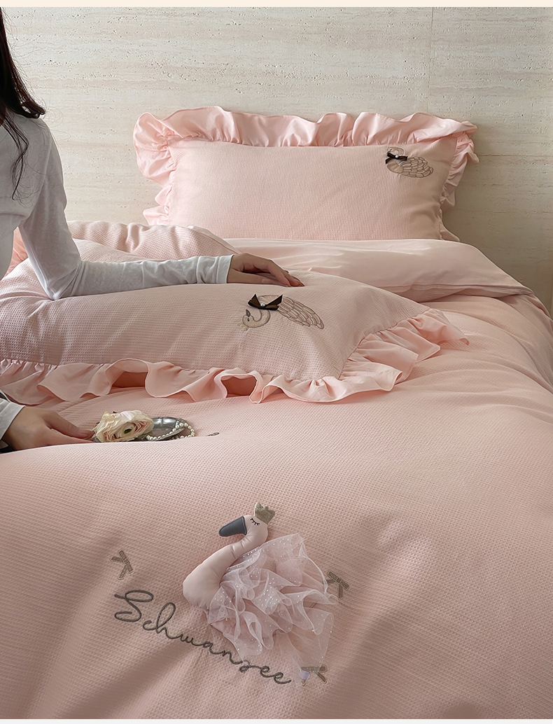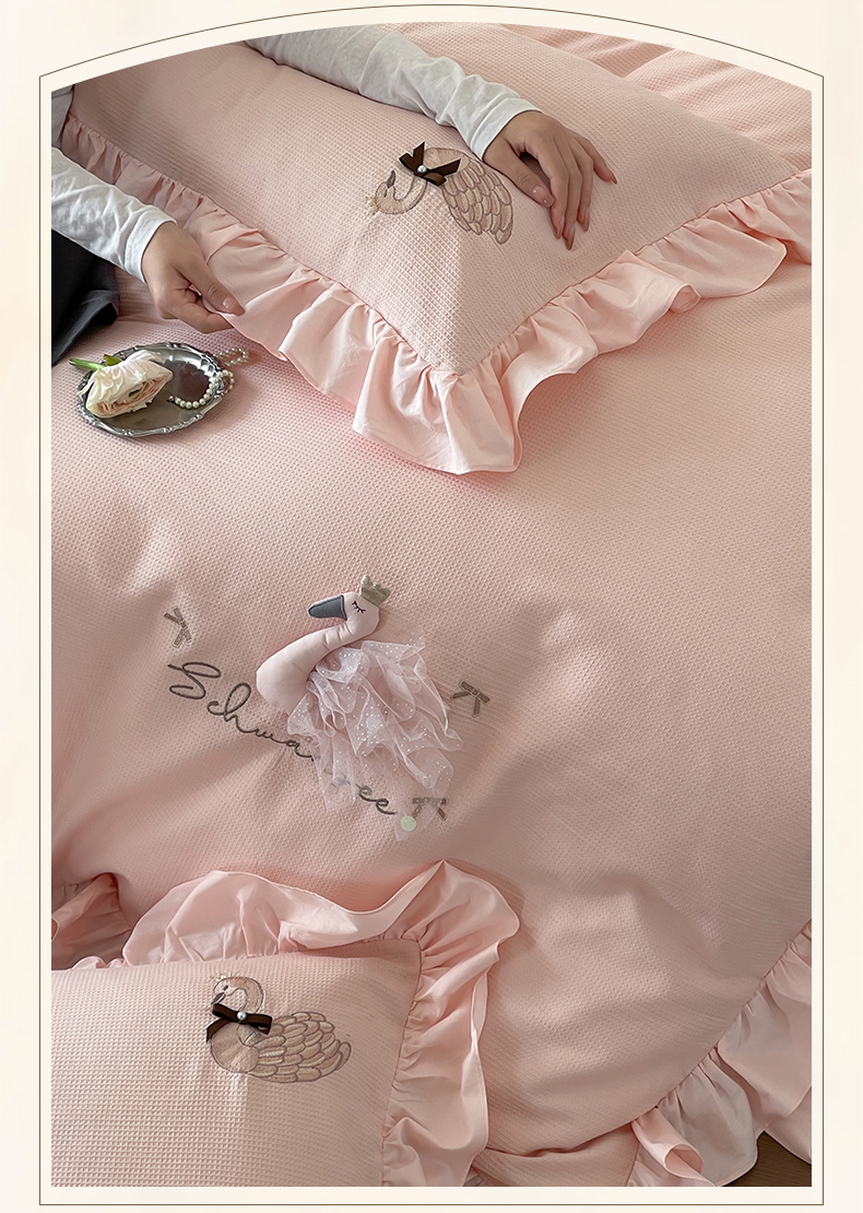商品名称:名品优仓 2025新款全棉华夫格水洗棉双层纱手工花提花韩版花边四件套 天鹅舞曲-仙女粉