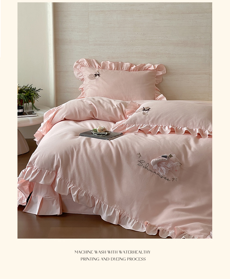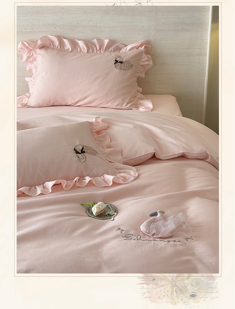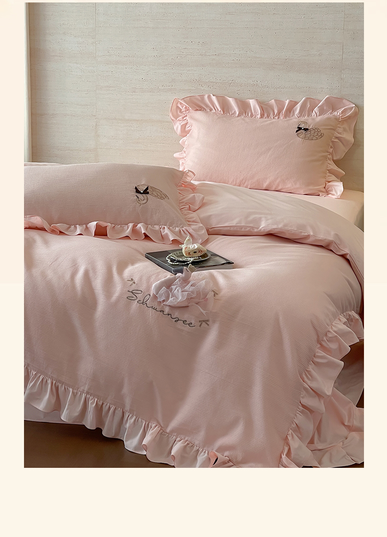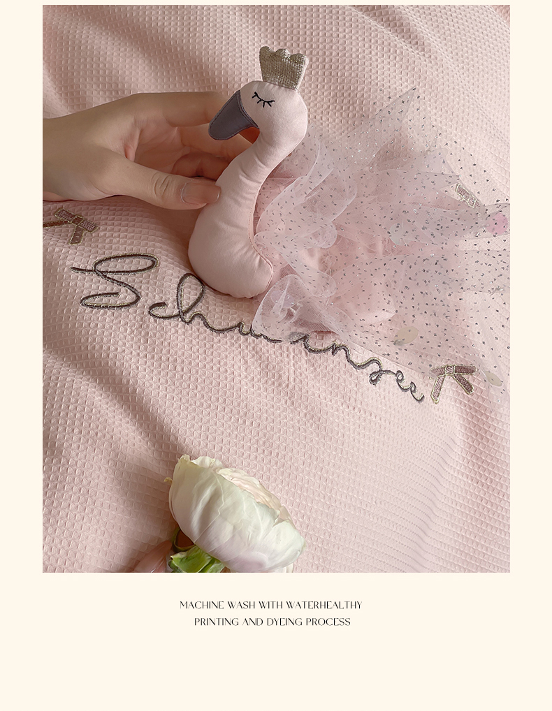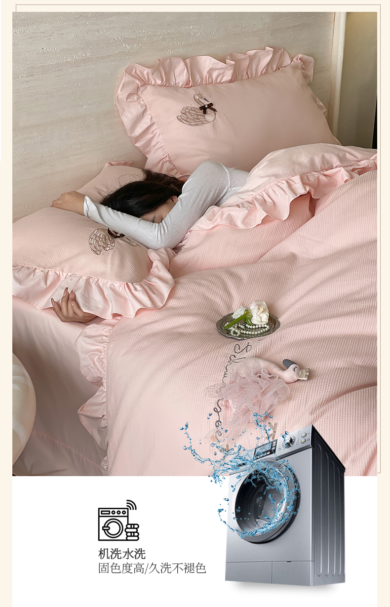 名品优仓 2025新款全棉华夫格水洗棉双层纱手工花提花韩版花边四件套 天鹅舞曲-仙女粉