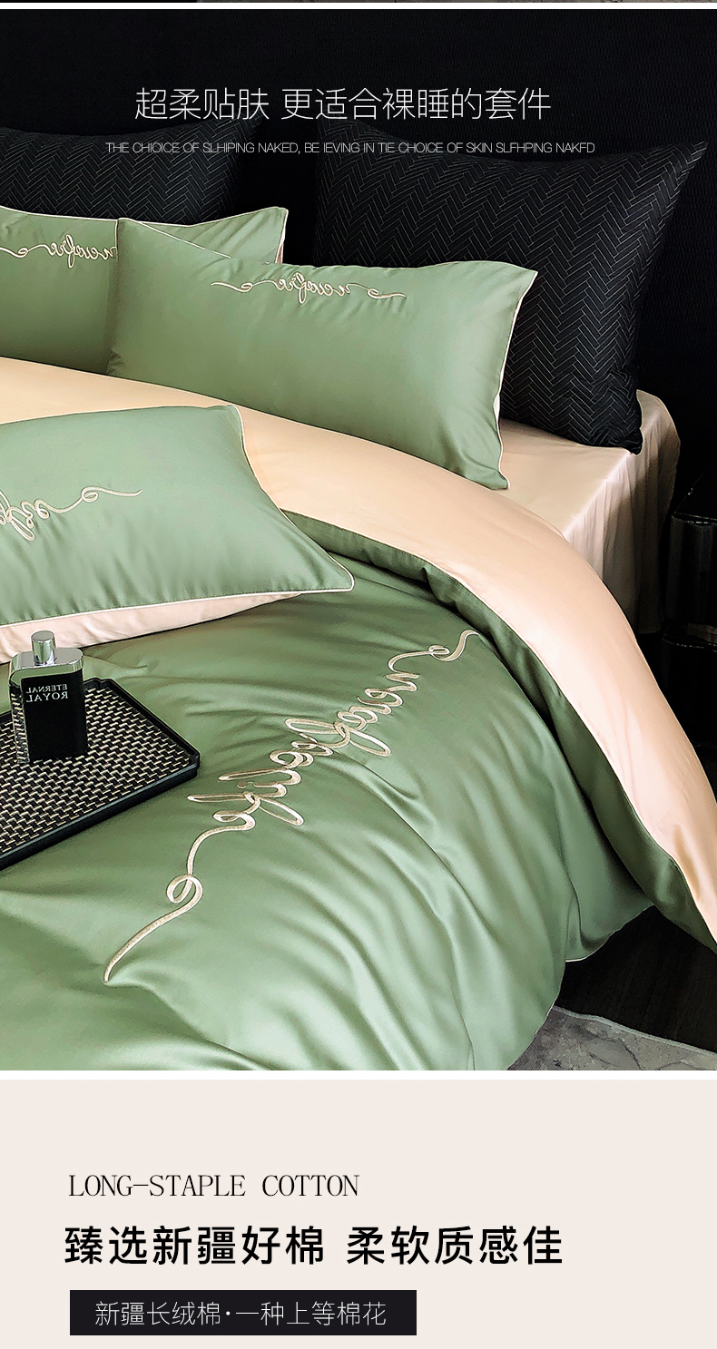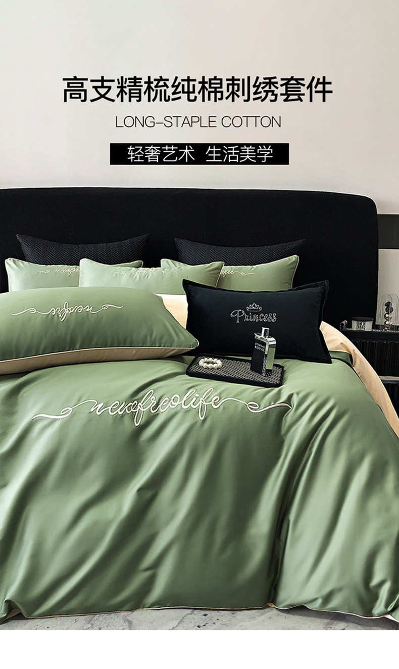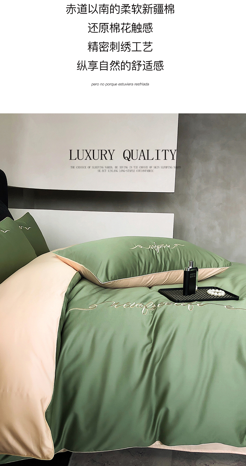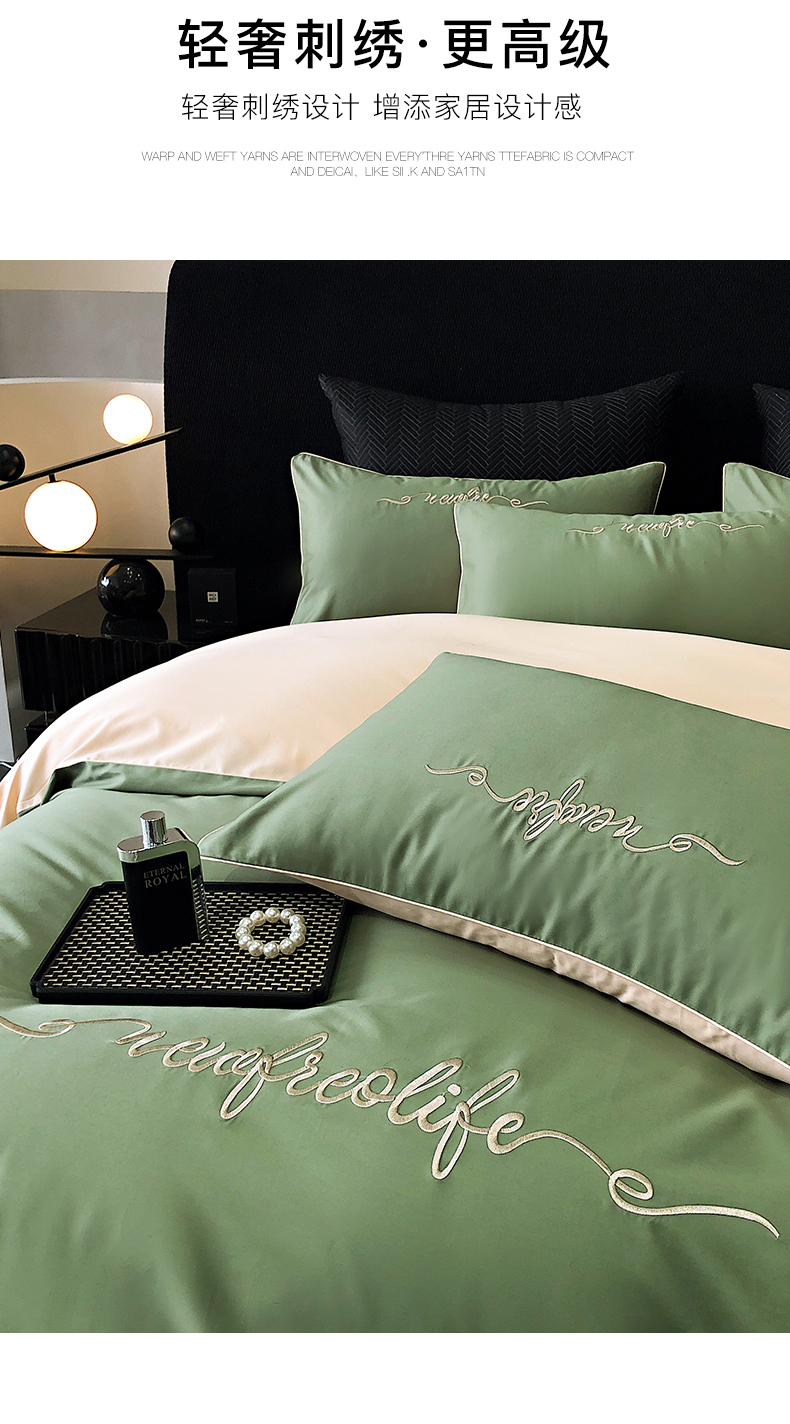 商品名称:禧澜庭 2026新款高支纯棉全棉斜纹四件套刺绣绣花款轻奢三件套--卡罗系列 莺茶绿+卡其