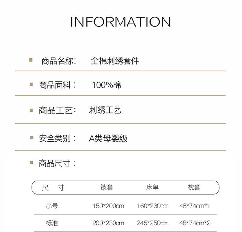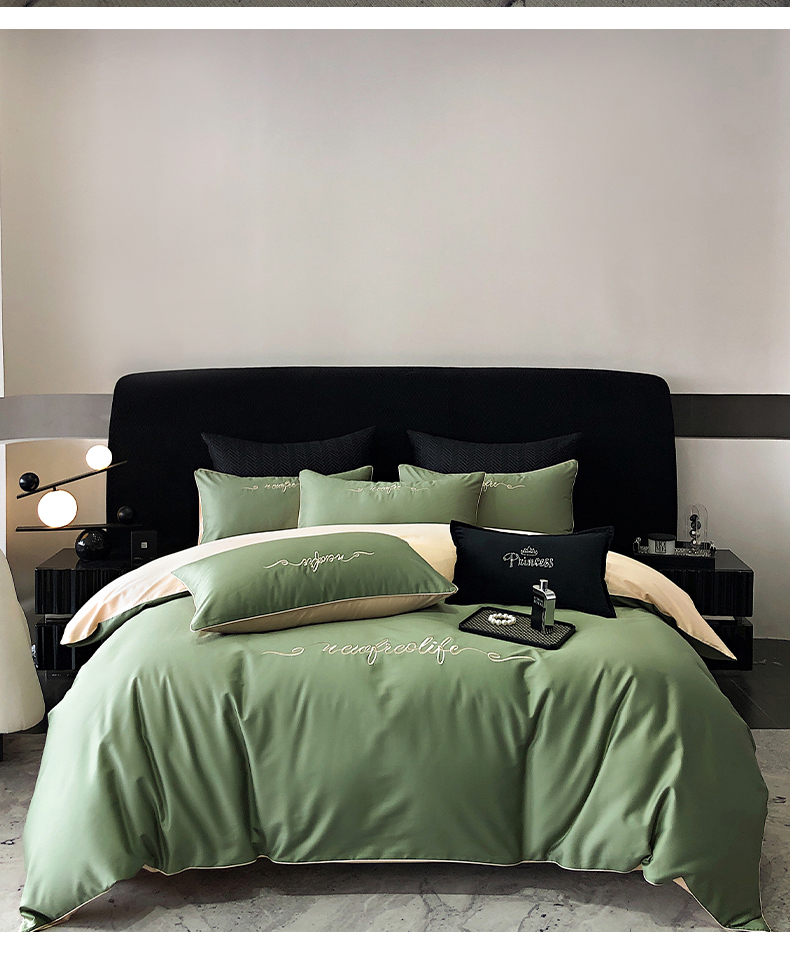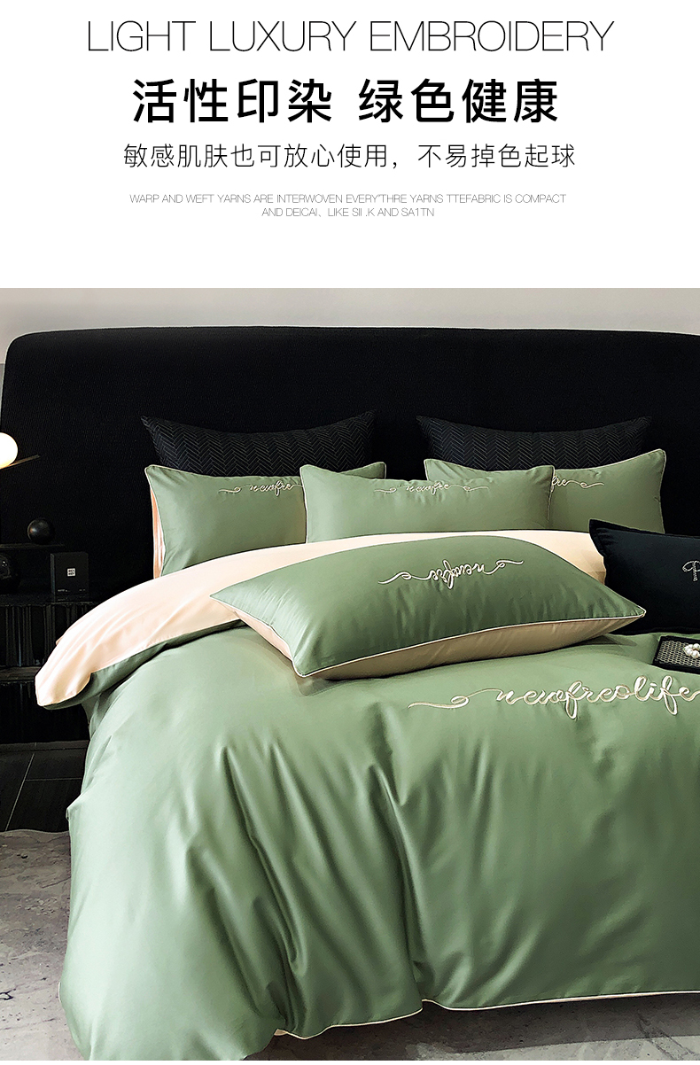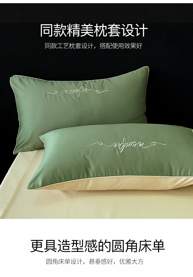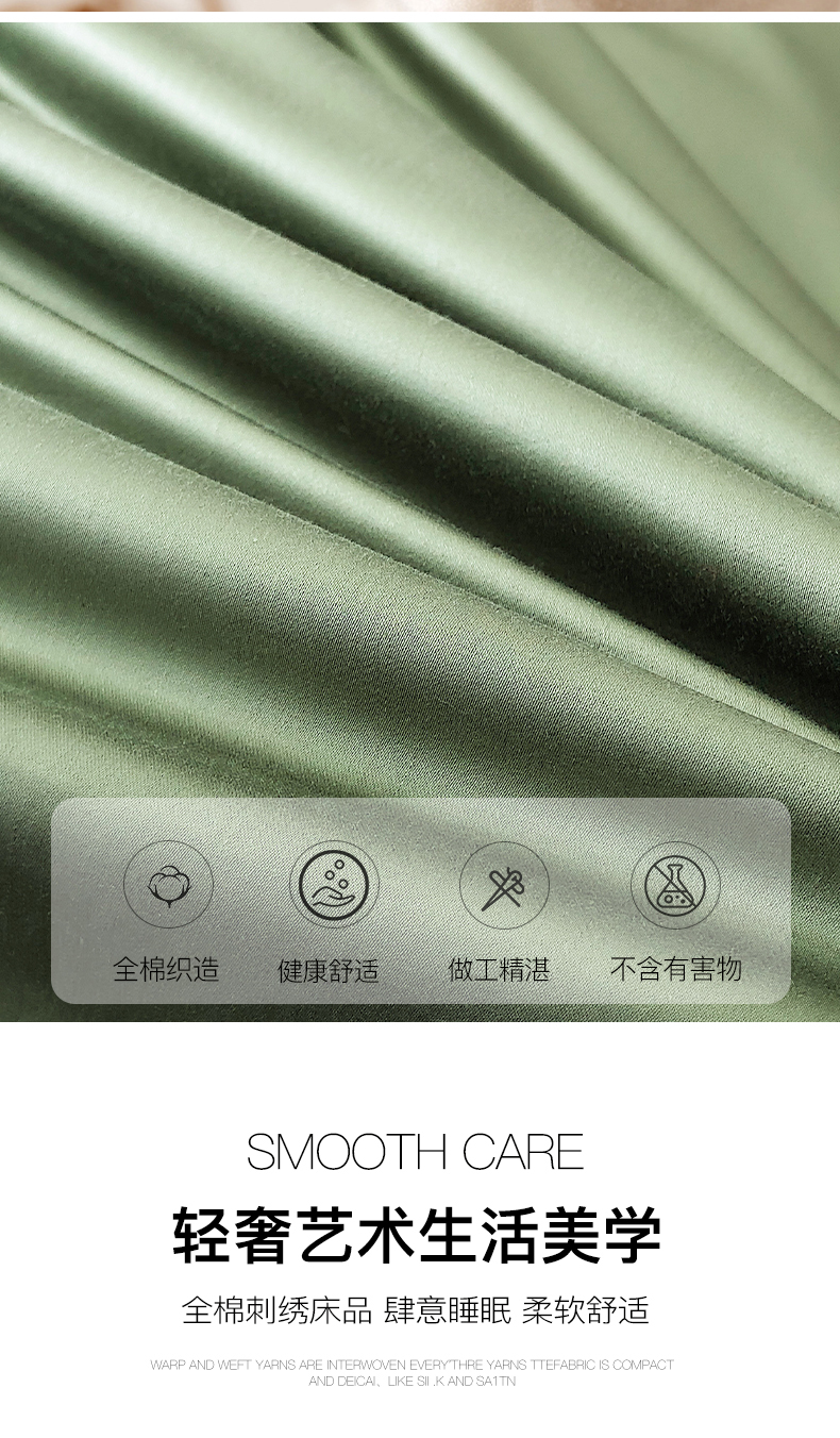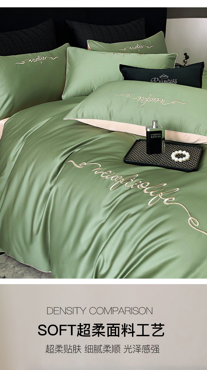 商品名称:禧澜庭 2026新款高支纯棉全棉斜纹四件套刺绣绣花款轻奢三件套--卡罗系列 莺茶绿+卡其