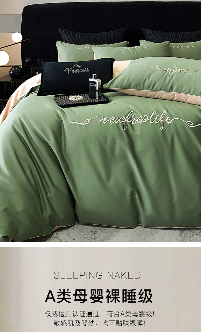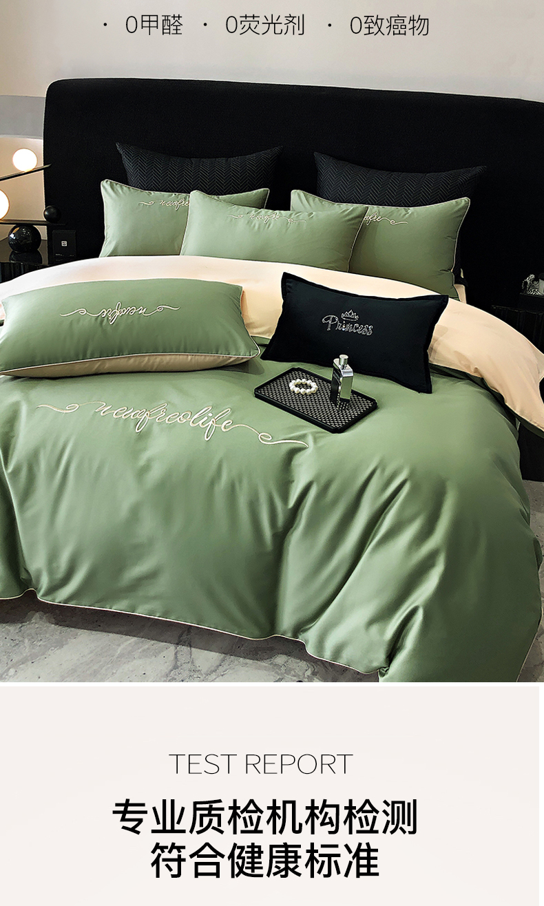 禧澜庭 2026新款高支纯棉全棉斜纹四件套刺绣绣花款轻奢三件套--卡罗系列 莺茶绿+卡其