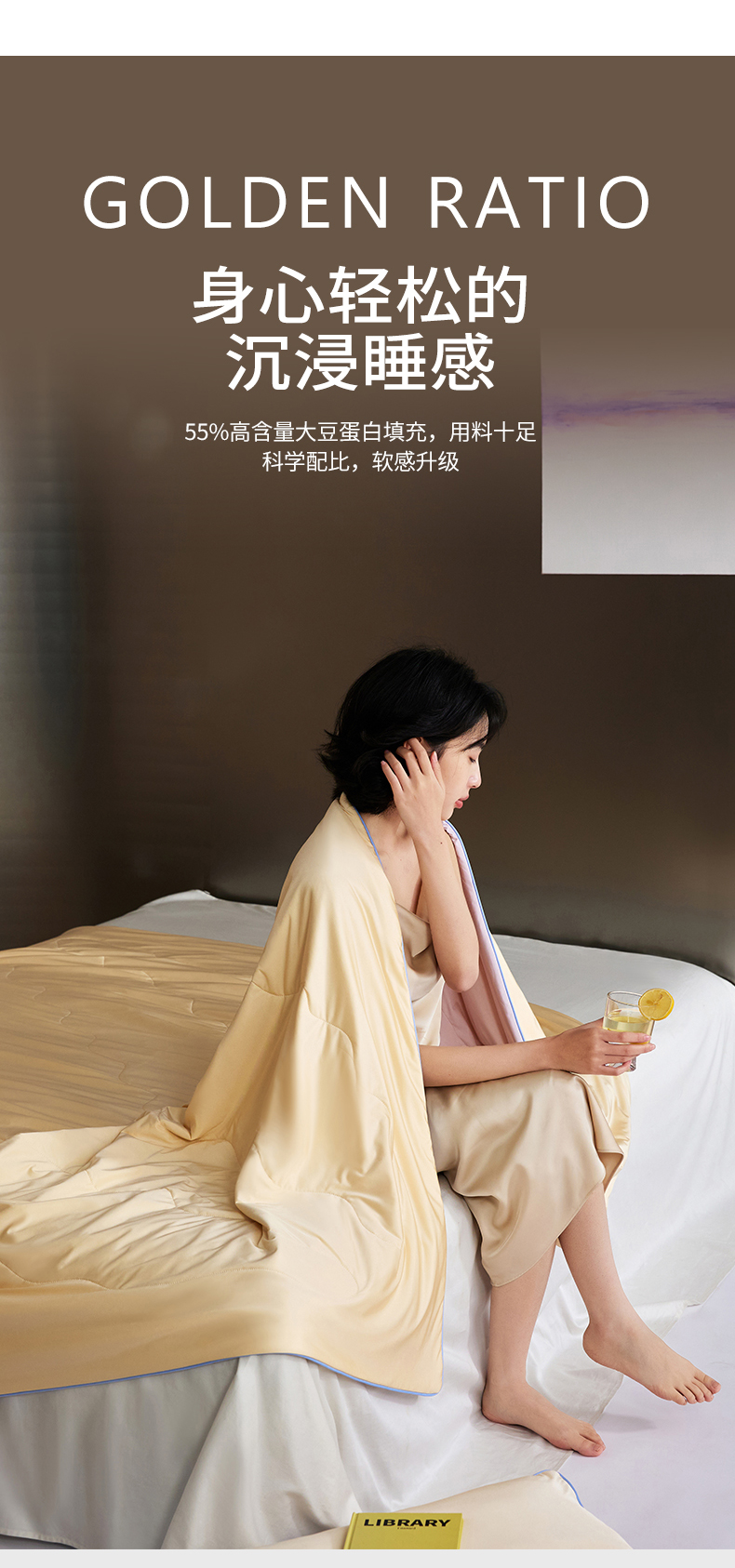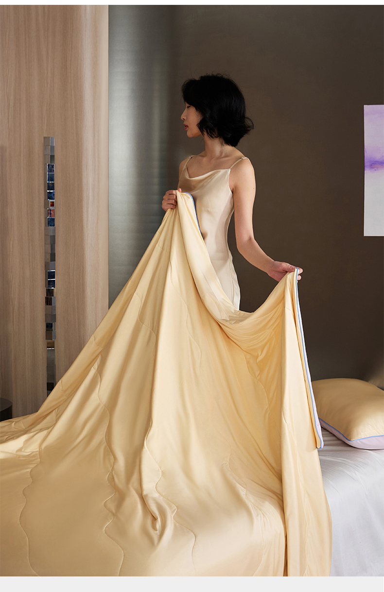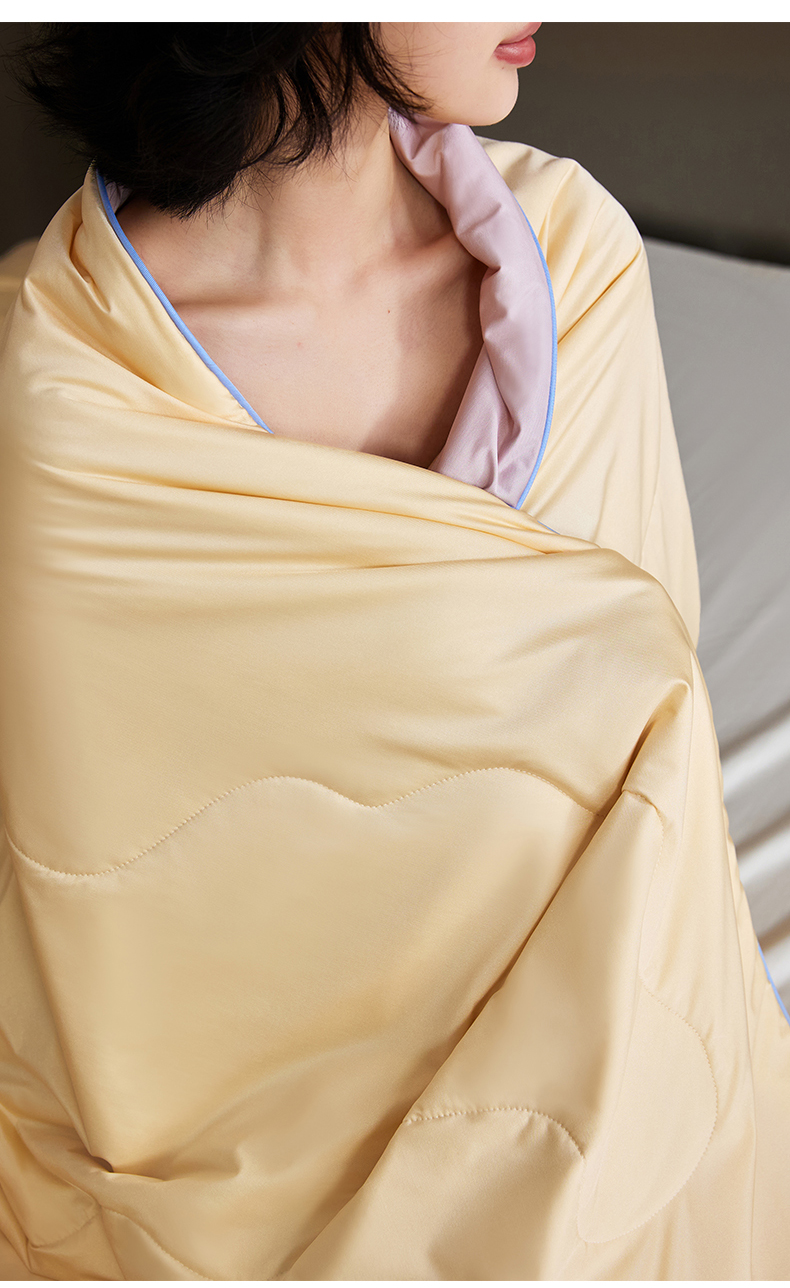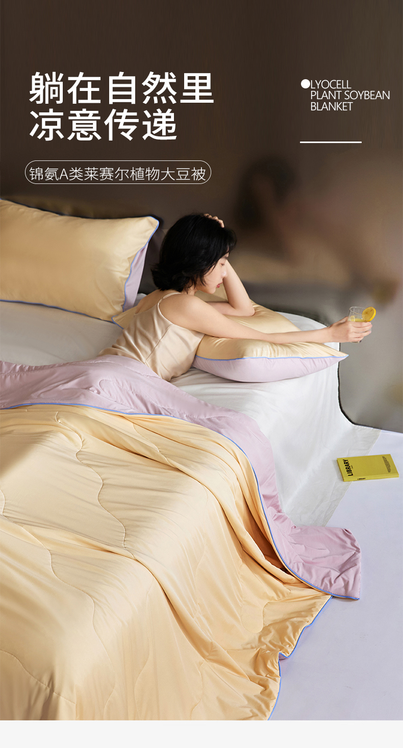 被子 > 夏被 > 头等舱 2025新款锦氨(165克)水光亮面锦A类55莱赛尔植物大豆7A抗菌夏凉被夏被(模特图) 暖黄+水粉色