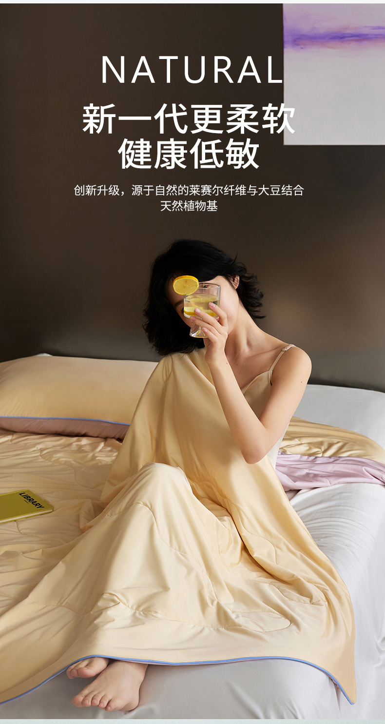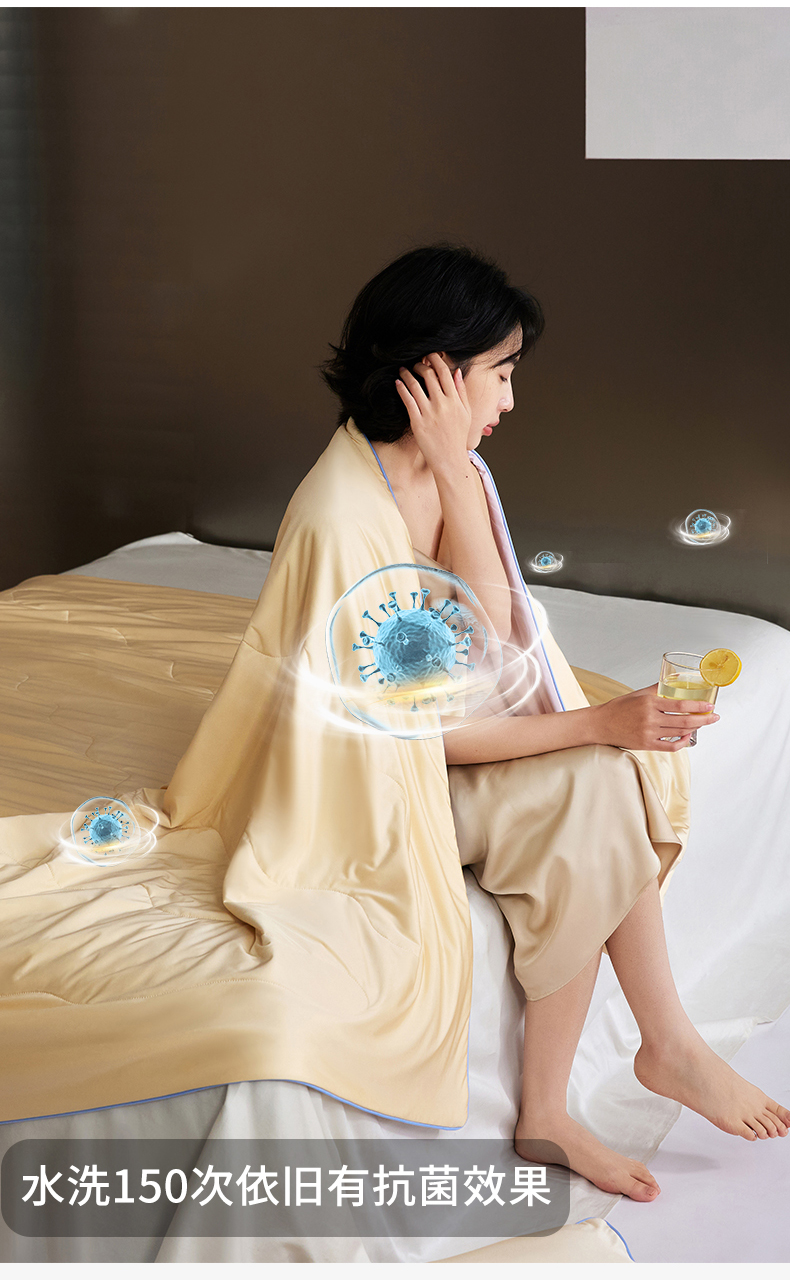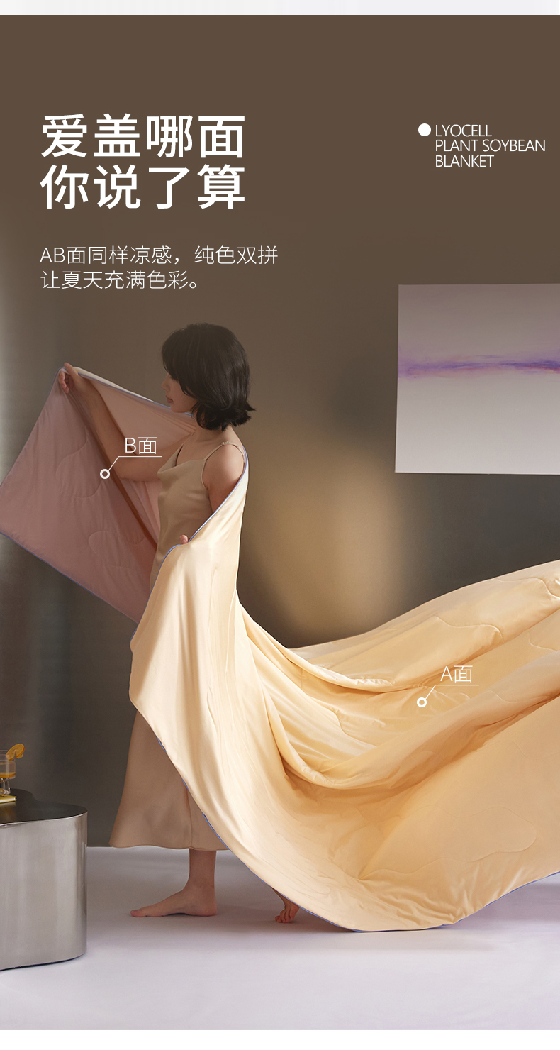 商品名称:头等舱 2025新款锦氨(165克)水光亮面锦A类55莱赛尔植物大豆7A抗菌夏凉被夏被(模特图) 暖黄+水粉色