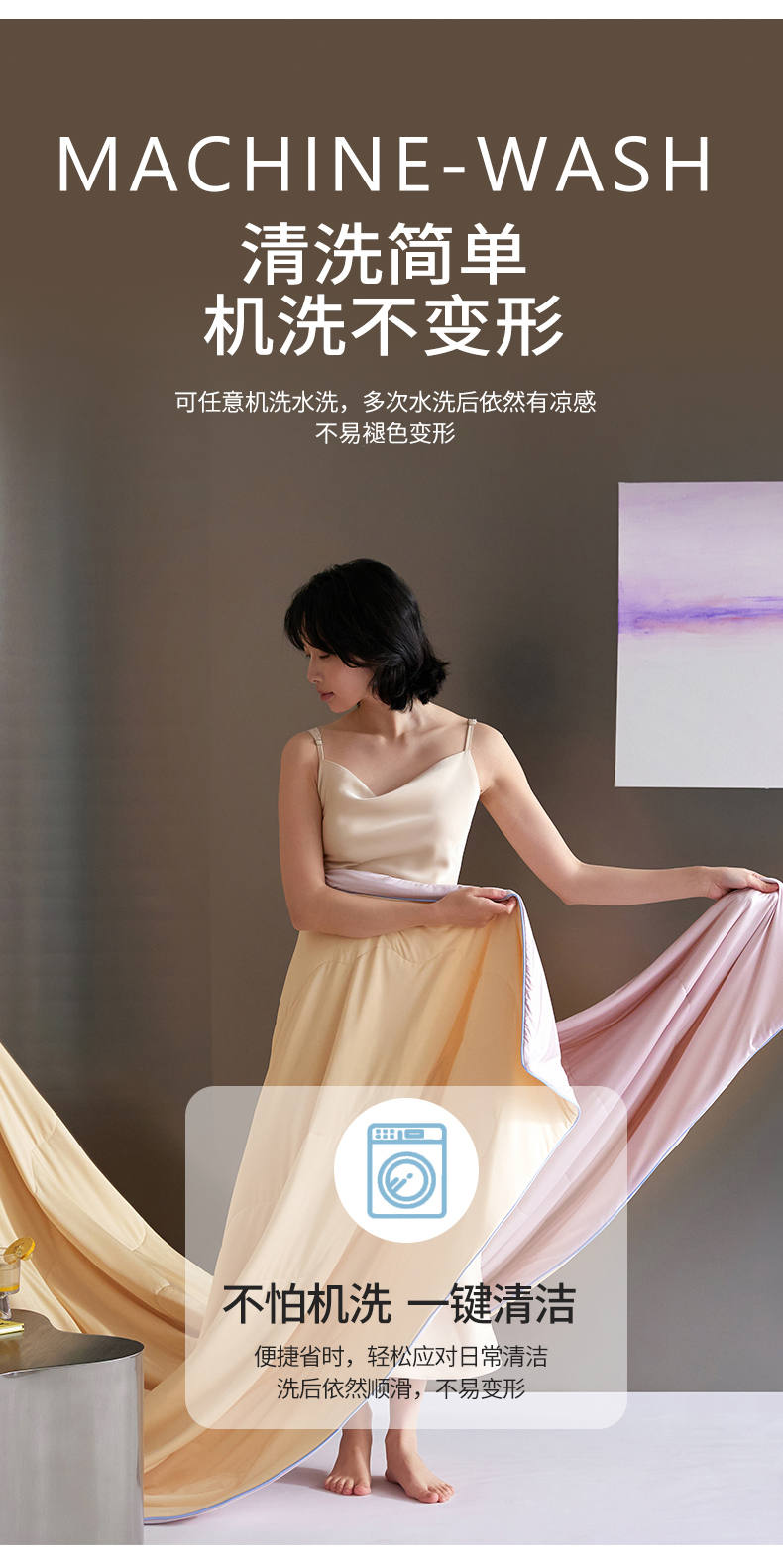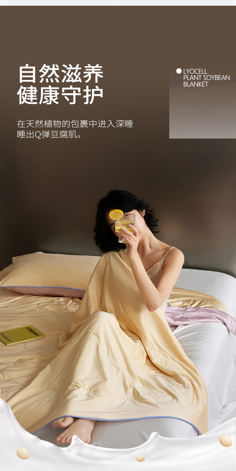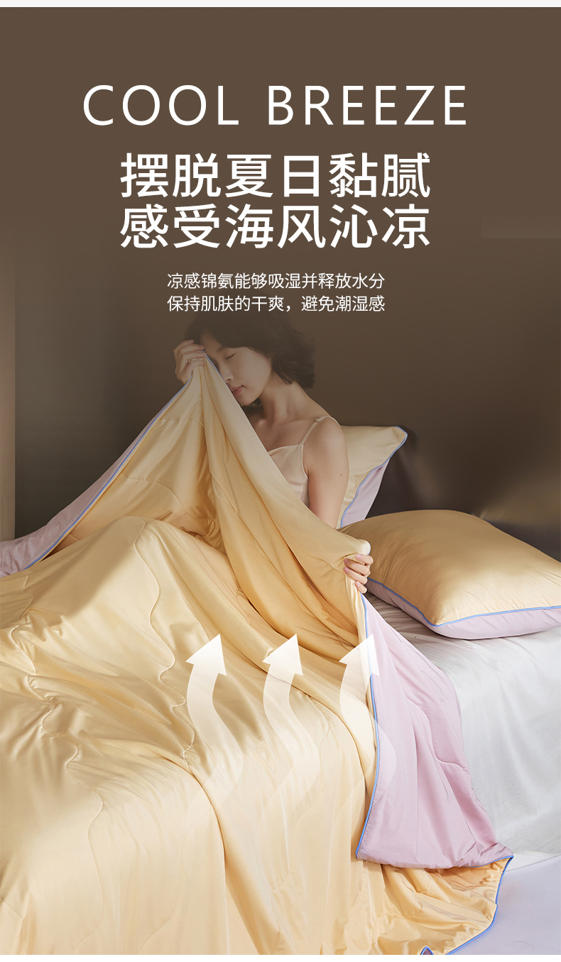 商品名称:头等舱 2025新款锦氨(165克)水光亮面锦A类55莱赛尔植物大豆7A抗菌夏凉被夏被(模特图) 暖黄+水粉色