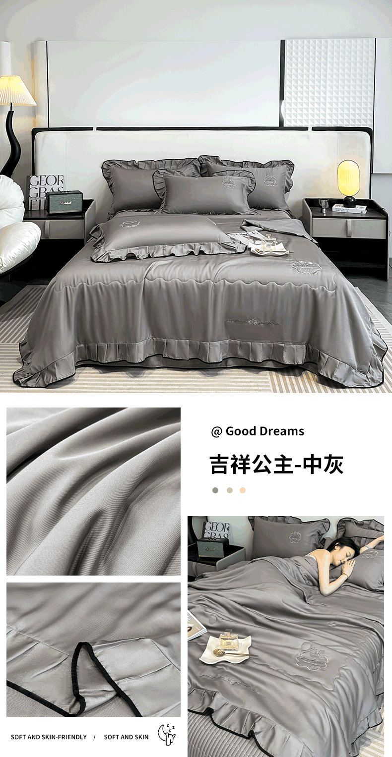 商品名称:富米莱 2025新款韩版水洗真丝冰丝刺绣夏被夏凉被空调被床盖四件套 吉祥公主-中灰
