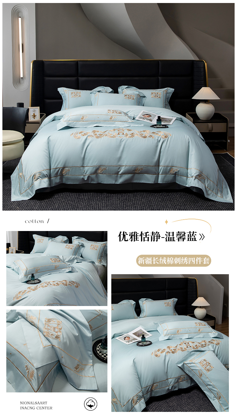 家居1号家纺 2025新款新疆长绒棉宽边刺绣四件套-优雅恬静 优雅恬静-温馨蓝