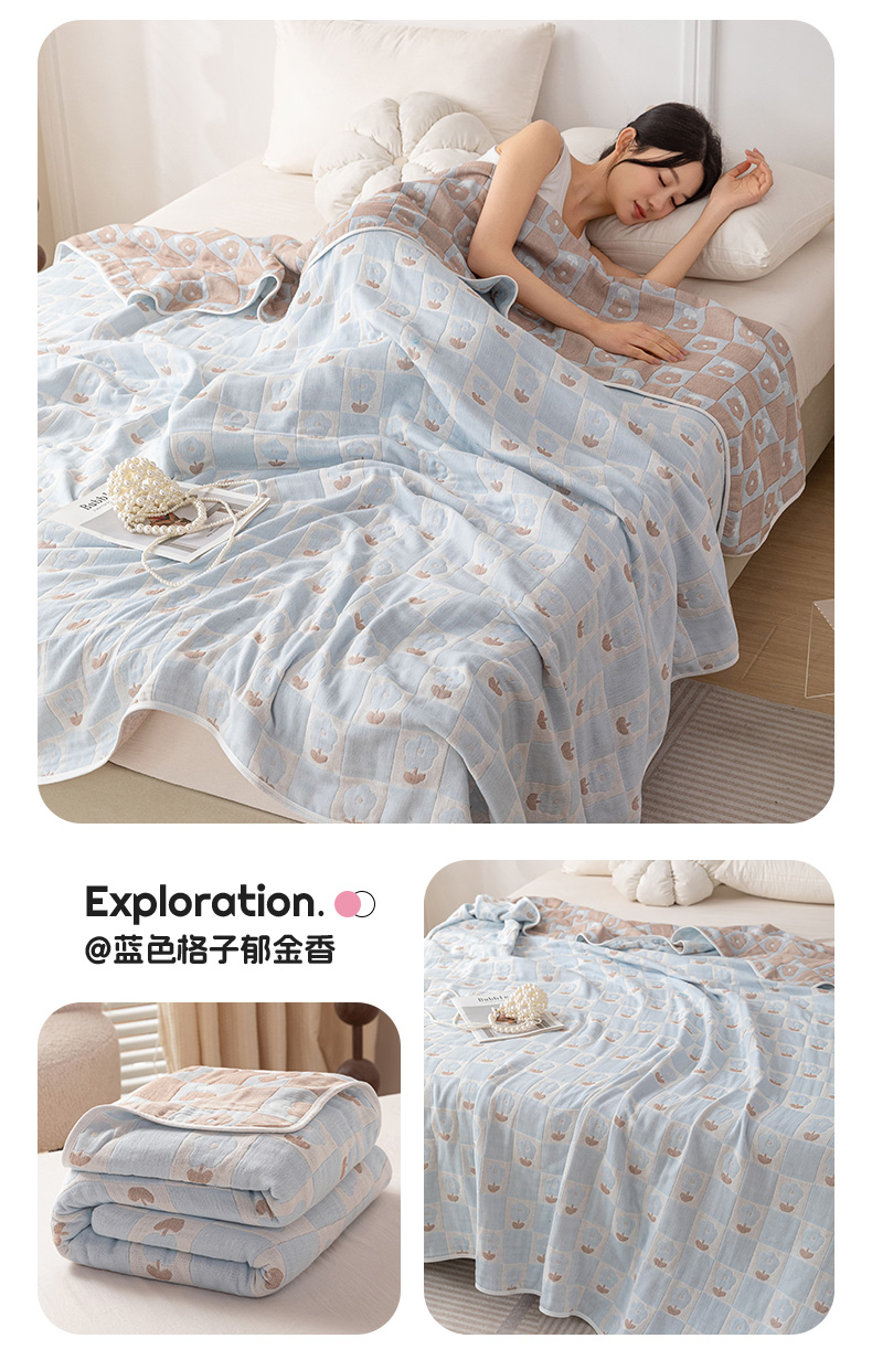 商品名称:乐家毛巾被(工厂自产自销) 2025春夏新款亲肤舒适六层纱布被 蓝色格子郁金香