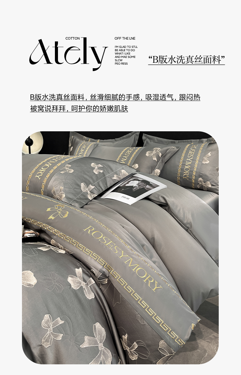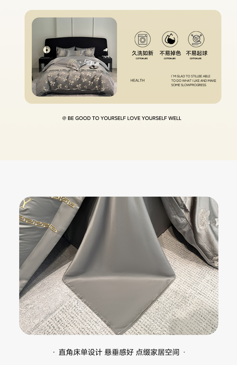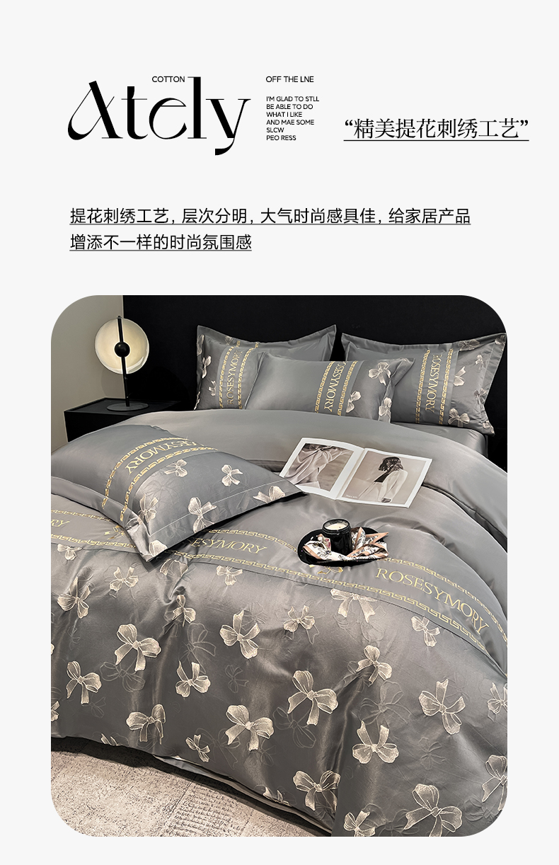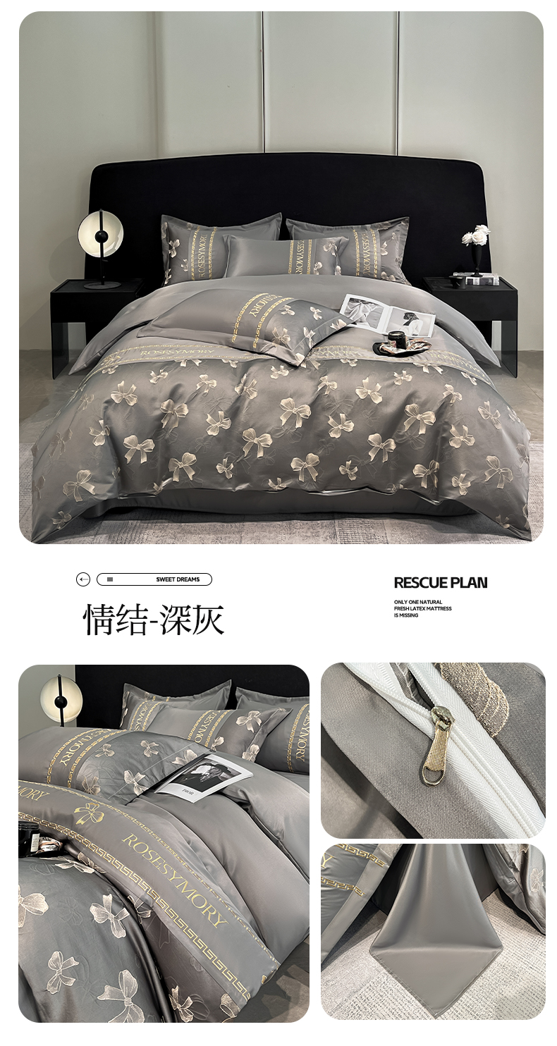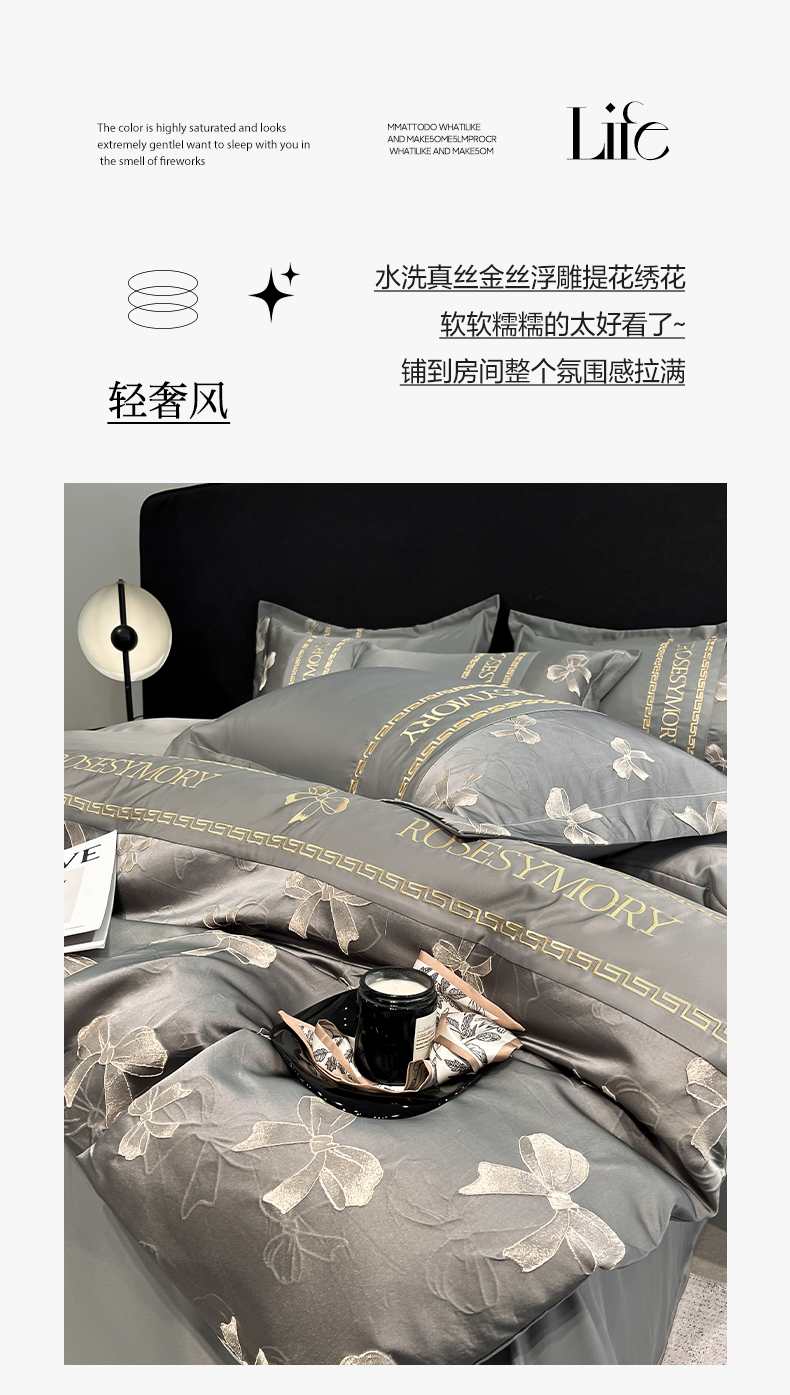 商品名称:米彩家纺 2025新款A类水洗真丝金丝浮雕提花绣花四件套 情结-深灰