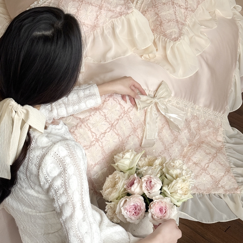 (总)佳汐蓝 2025春夏新品双层皱皱纱刺绣+织带+荷叶边四件套--白茶花,奶白,曲奇
