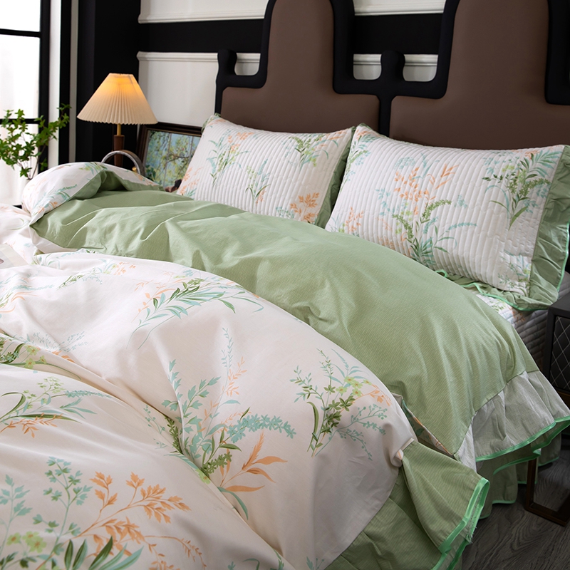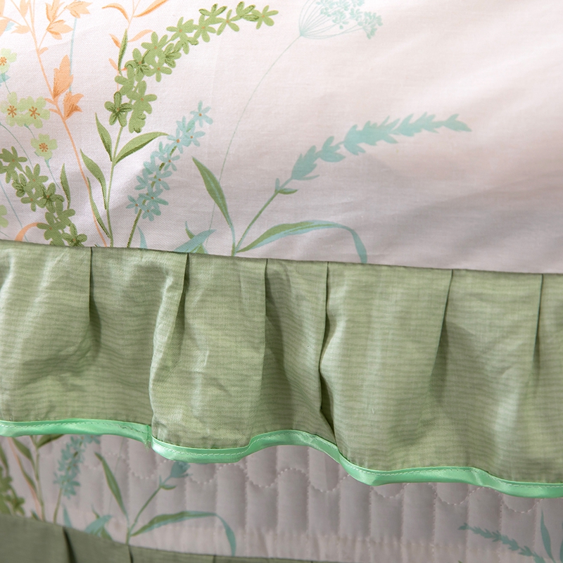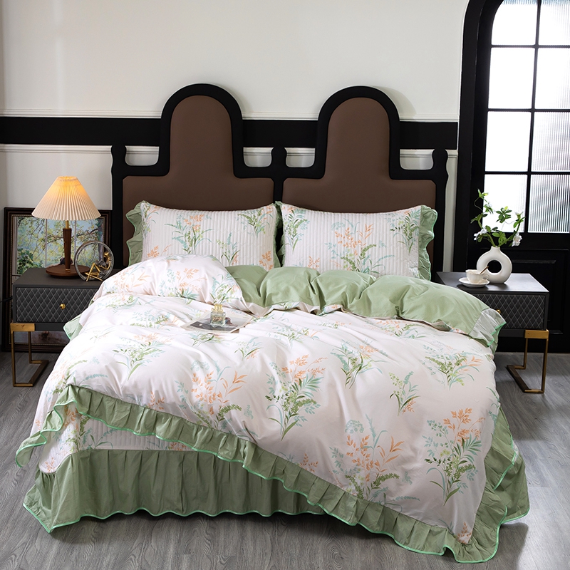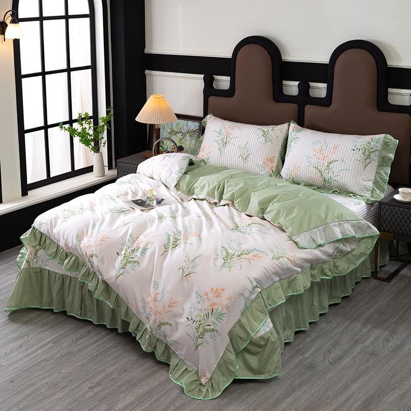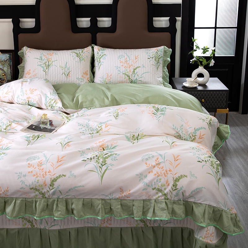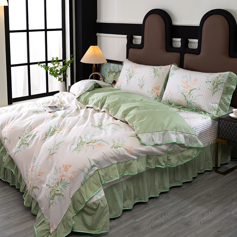 商品名称:木兰花2025新款全棉印花法式韩版花边夹棉床盖床裙款四件套 朱莉安-绿