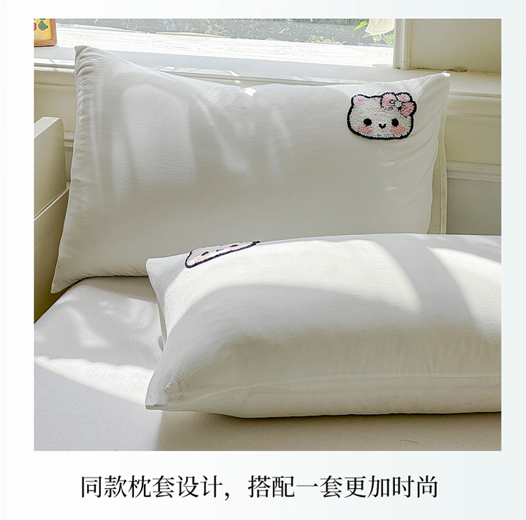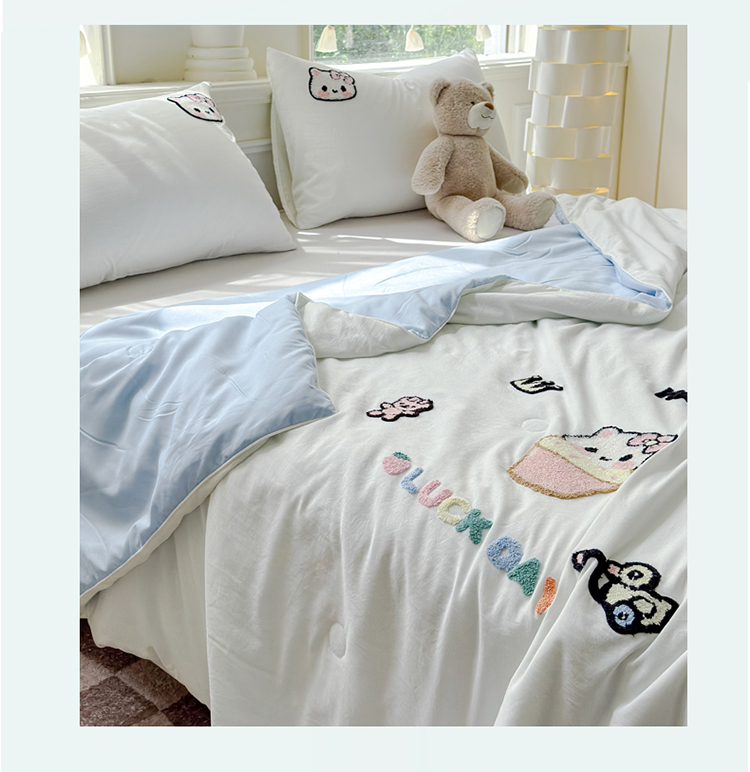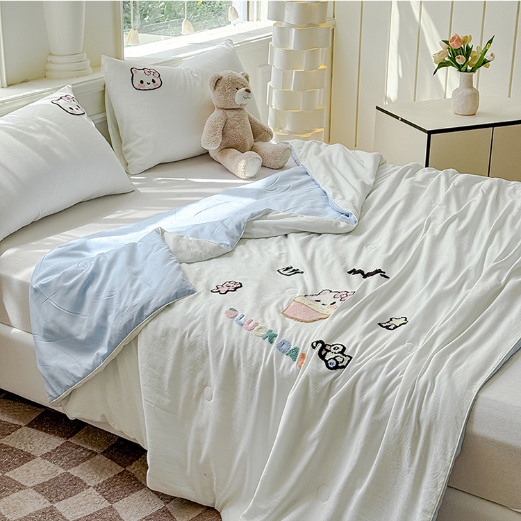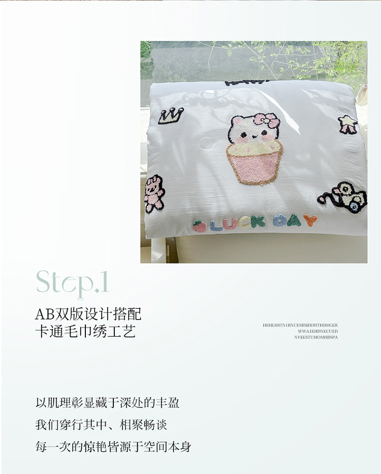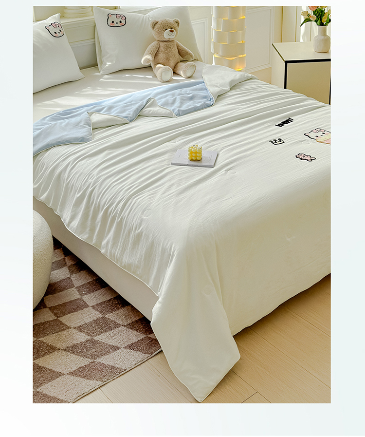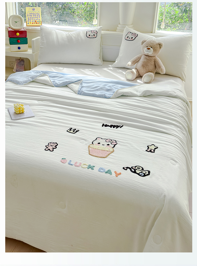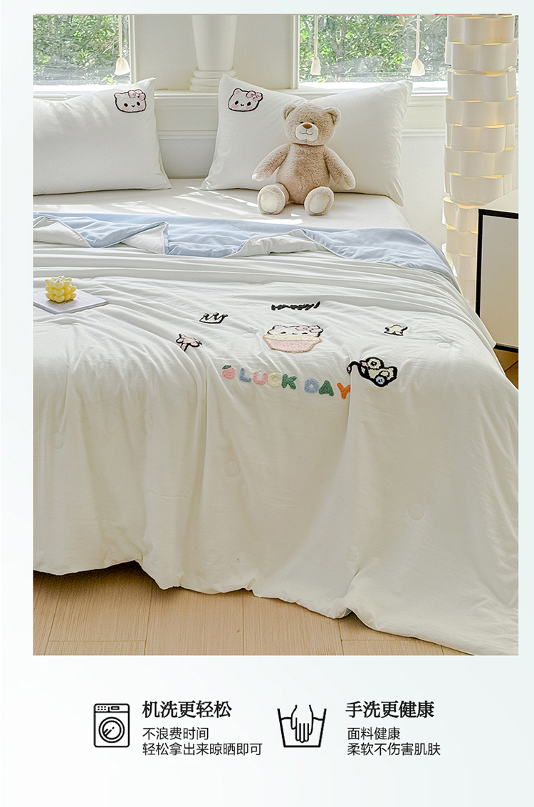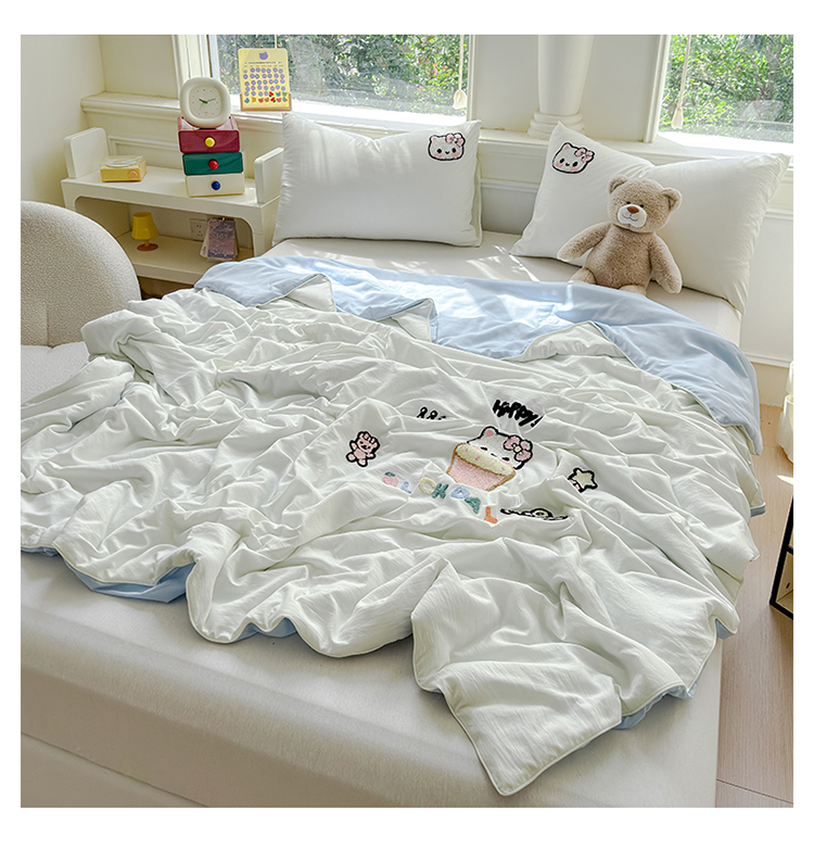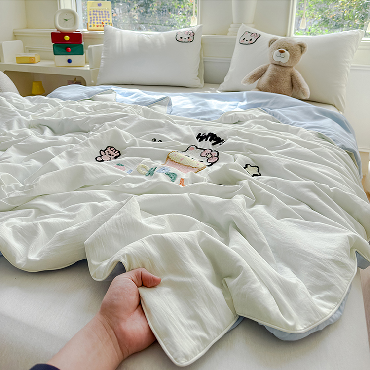 商品名称:2025新款水洗棉毛巾绣夏被卡通夏凉被薄被子 蓝白-茶杯猫