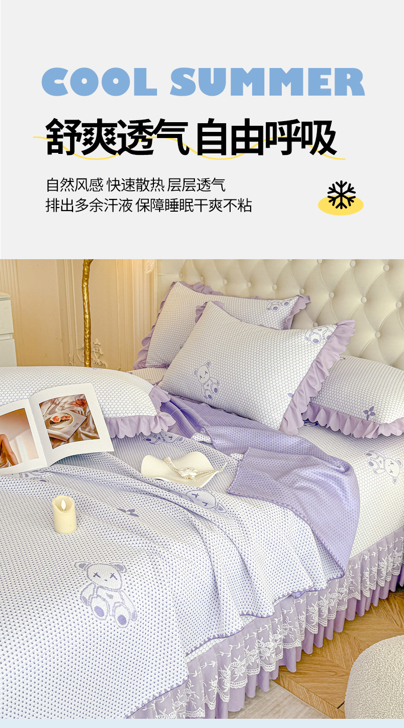 (总)美莱家纺 2024新款软糯泡泡棉蕾丝床盖床盖四件套单品系列-床盖夏被四件套,春风里,春意,海棠,含羞草,浅夕,俏佳人,夏花,小桃兔兔,小熊公仔,心动,薰衣草紫,樱花,郁金香,紫爱心,紫苏